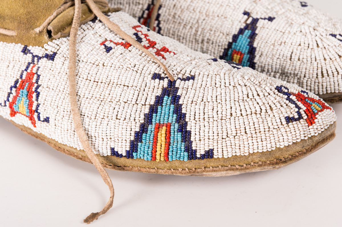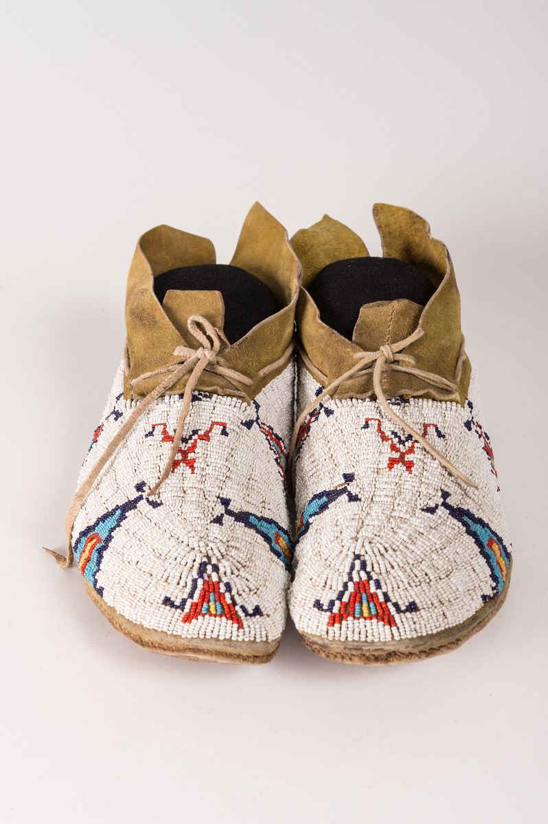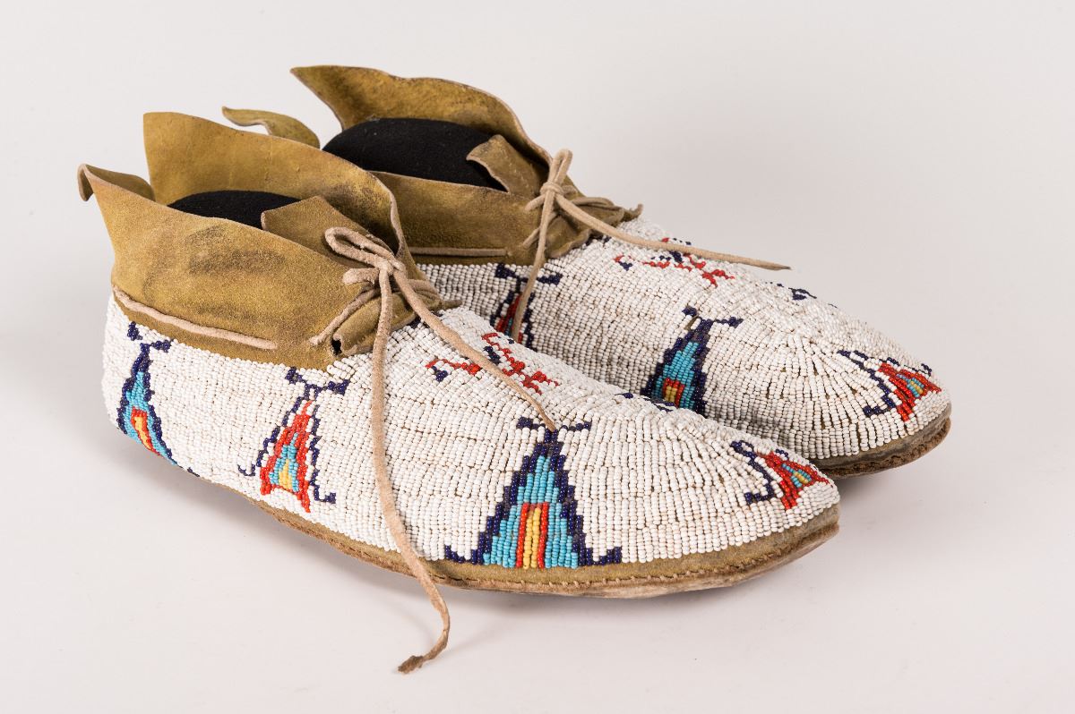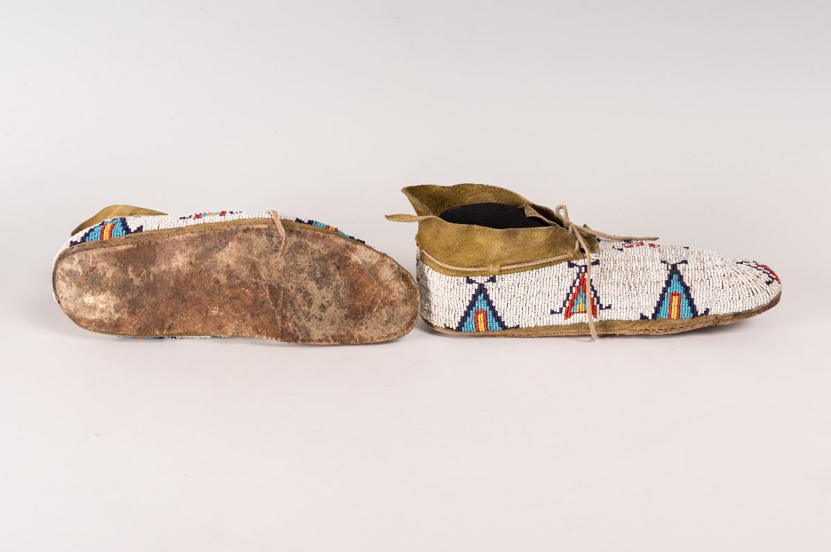 Cheyenne Beaded Man's Moccasins.10 ¾" long. Finely beaded in geometric teepee designs on yellow-ochred hide. Circa 1900.