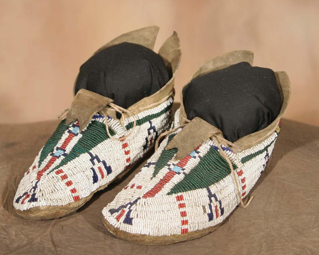 Cheyenne Beaded Woman's Moccasins. 8 ½" long. Classic Cheyenne style & color. 19th century. (est $1,200-1,600). For condition reports please visit: www.auctioninsantafe.com/cr2011.pdf