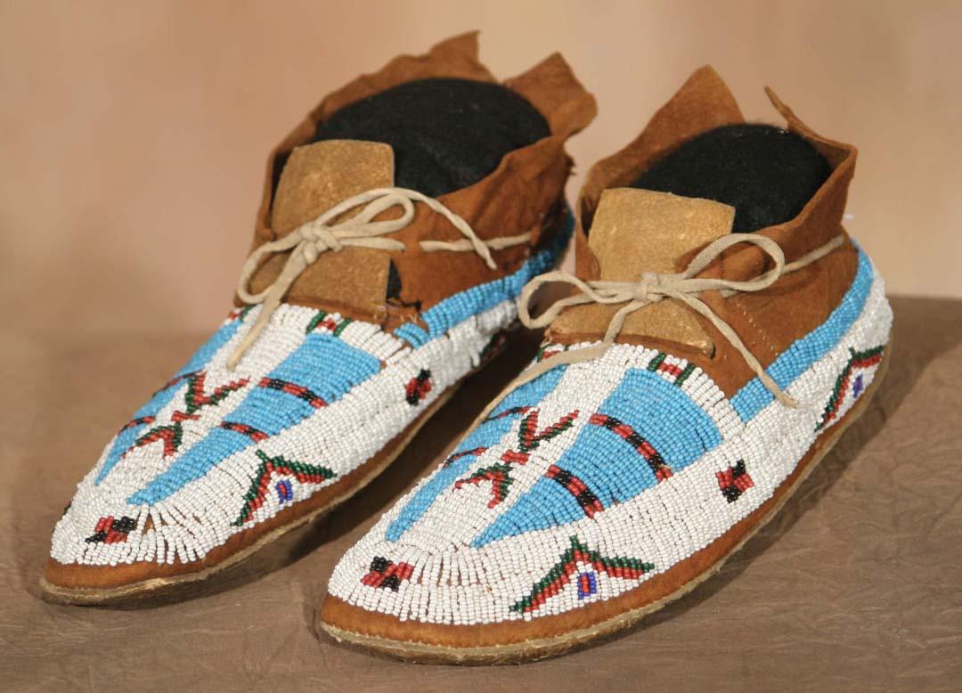 Cheyenne Beaded Moccasins. 9 ½" long. Red ochre dyed deer hide. Circa 1880. (est $900-1,200). For condition reports please visit: www.auctioninsantafe.com/cr2011.pdf