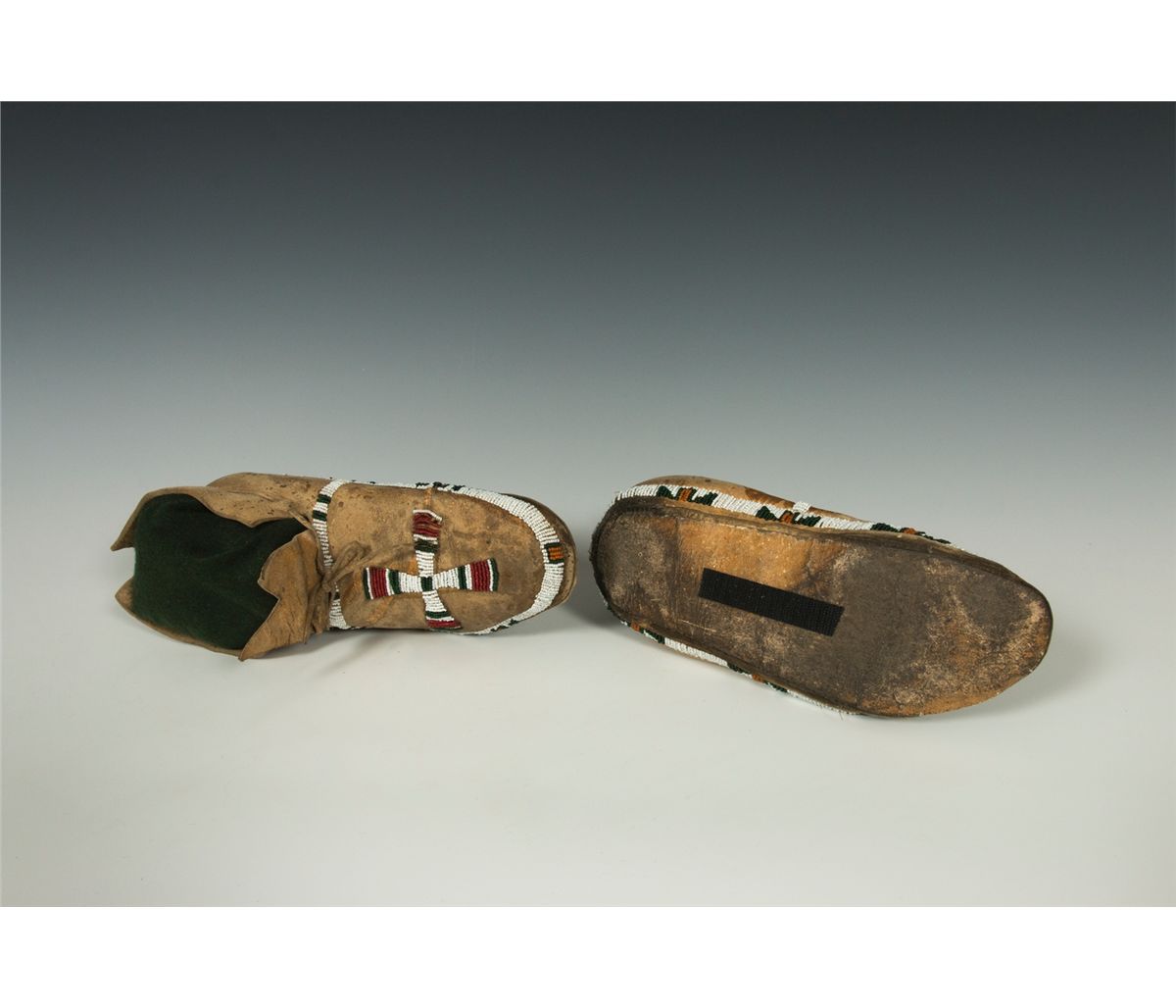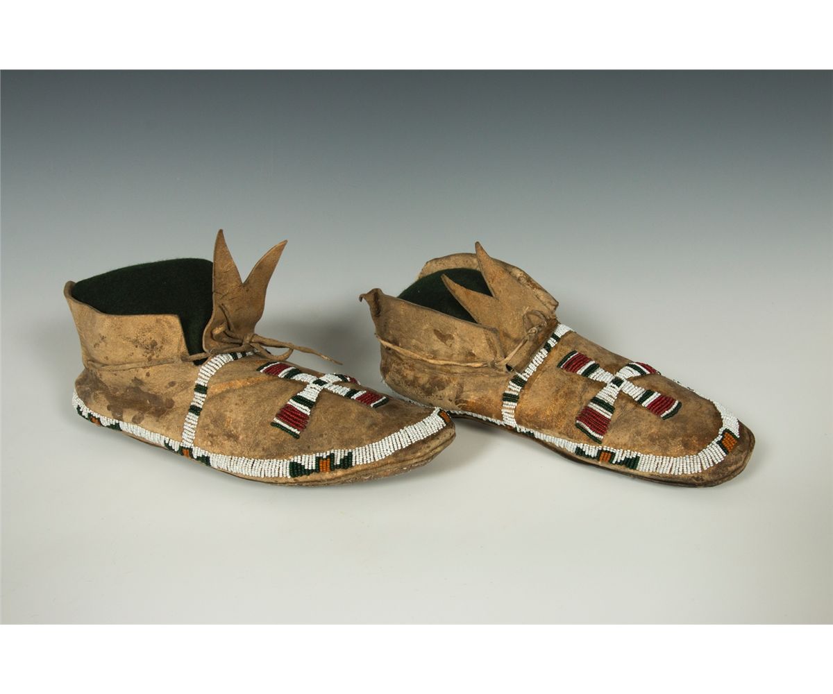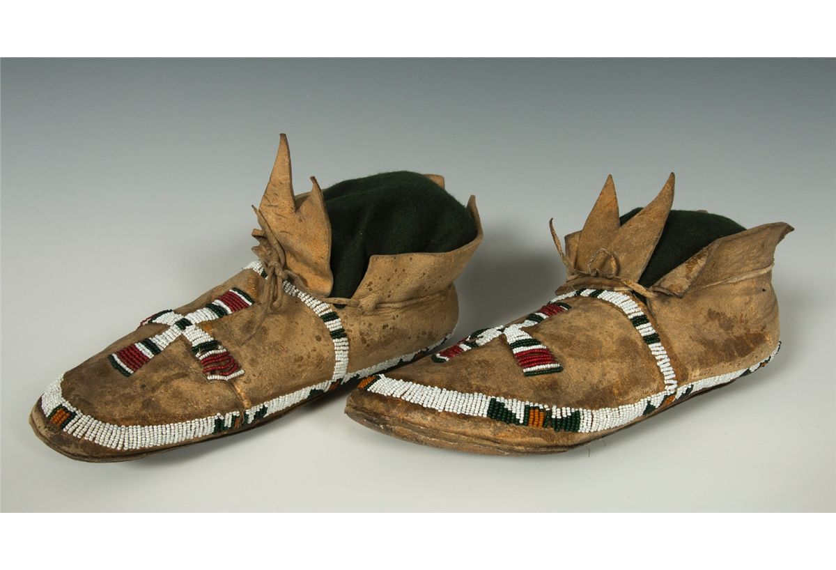 Cheyenne Moccasins. 9.5" long. Beaded in a classic Cheyenne style on buffalo hide. 19th century.