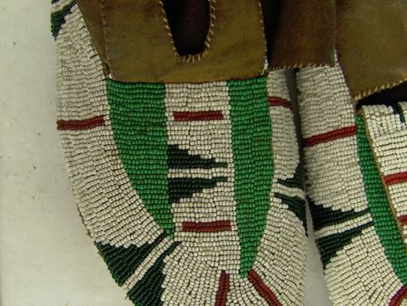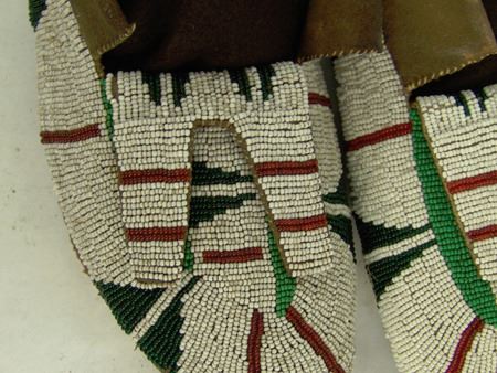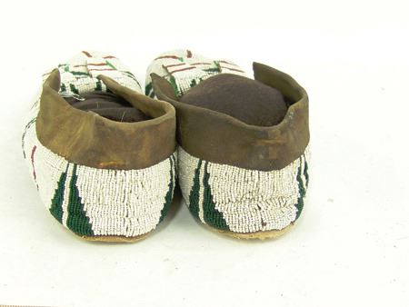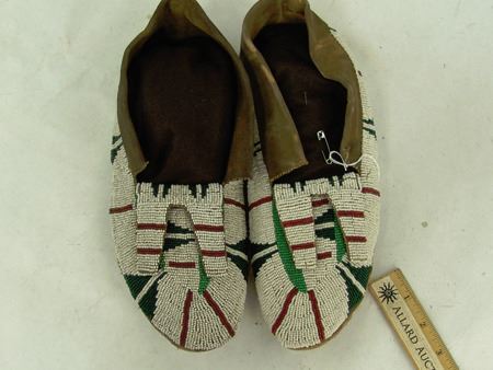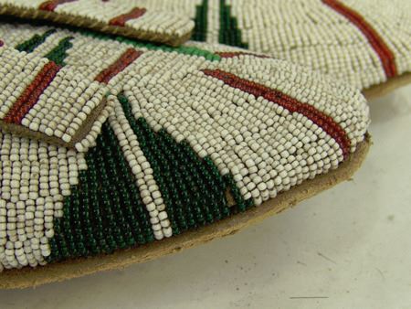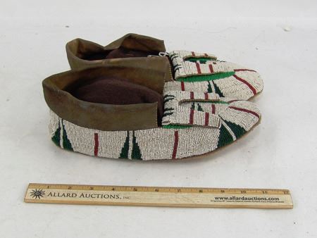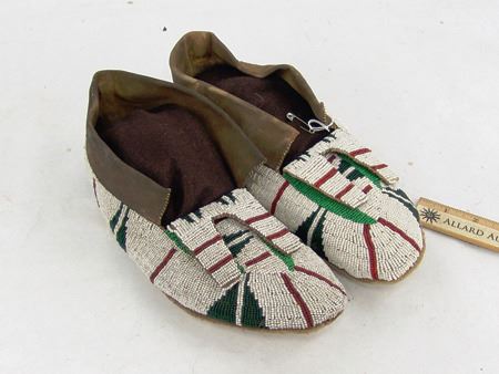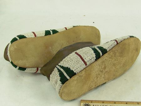 Early/Mid 1900s, Large pair of fully sinew sewn and lazy stitch beaded hide moccasins with hard rawhide soles and striking geometric design in green, dark green, and red on a white field. Very good condition. 11"