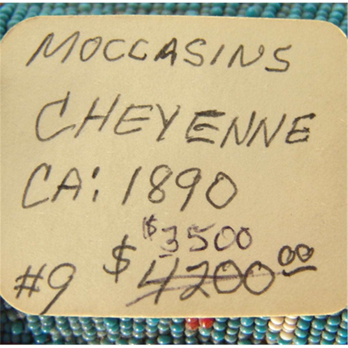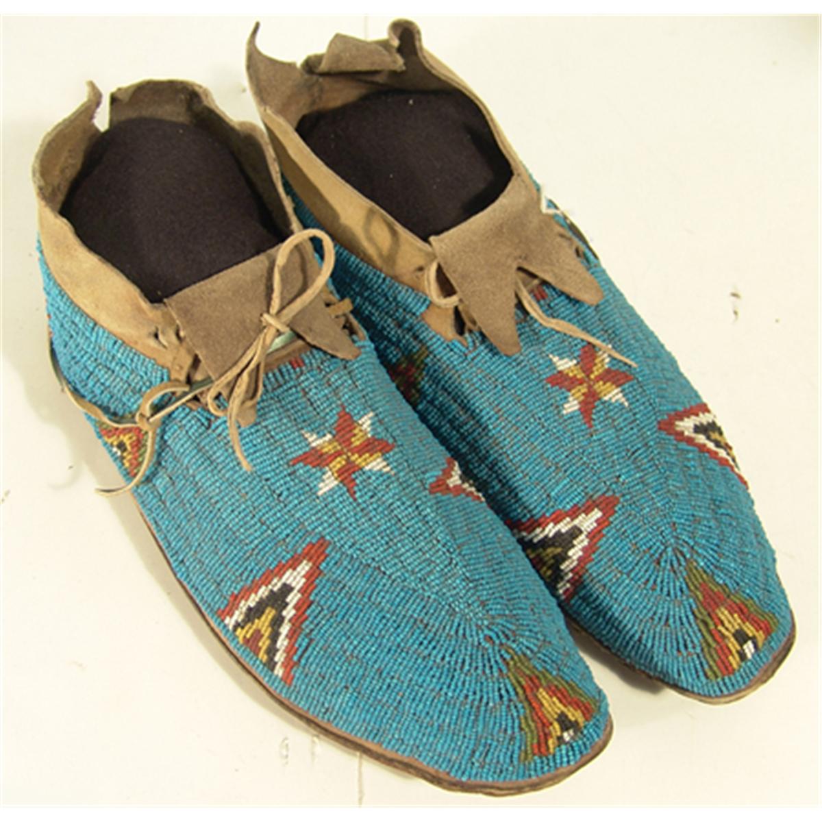 Outstanding pair of fine sinew sewn and lazy stitch beaded moccasins with double hide soles and traditional symbols on a blue field. Condition: very good, excellent visual example. 11"