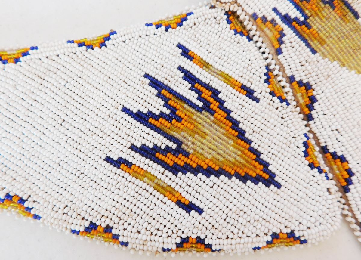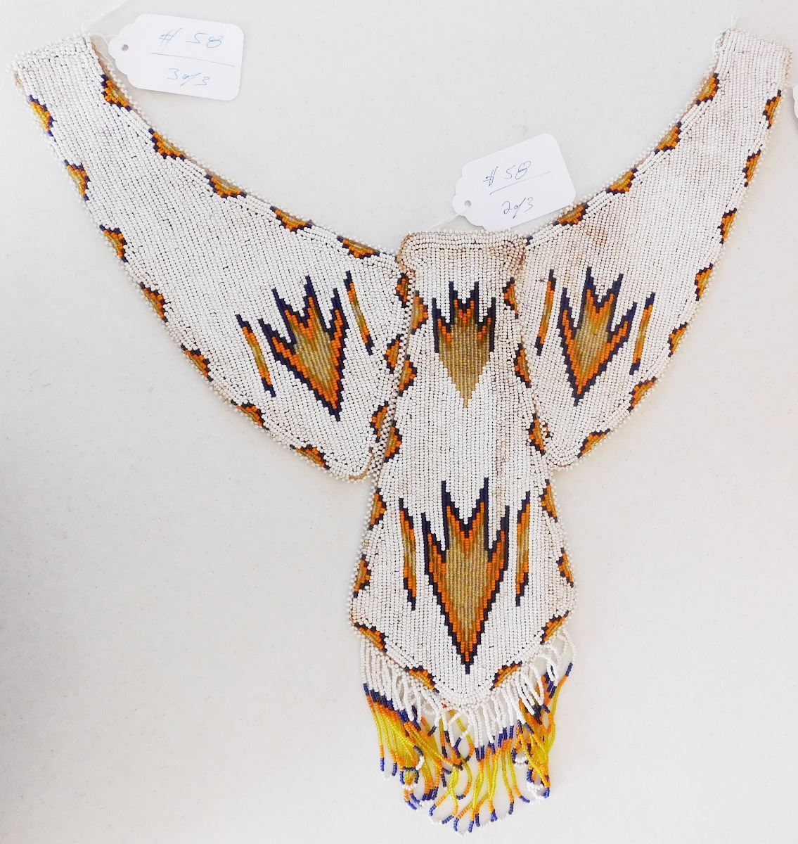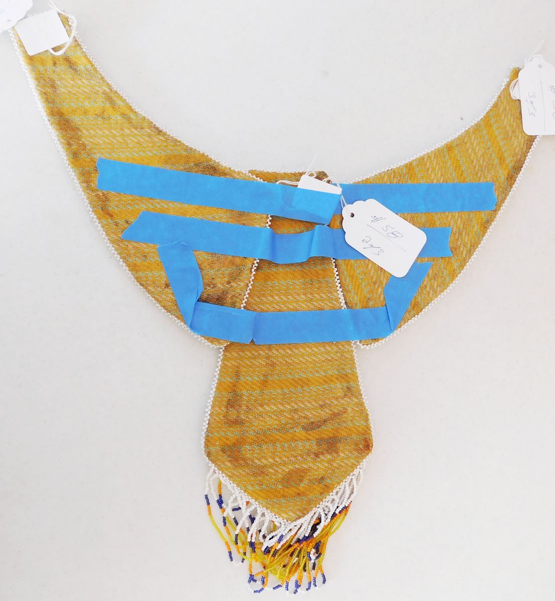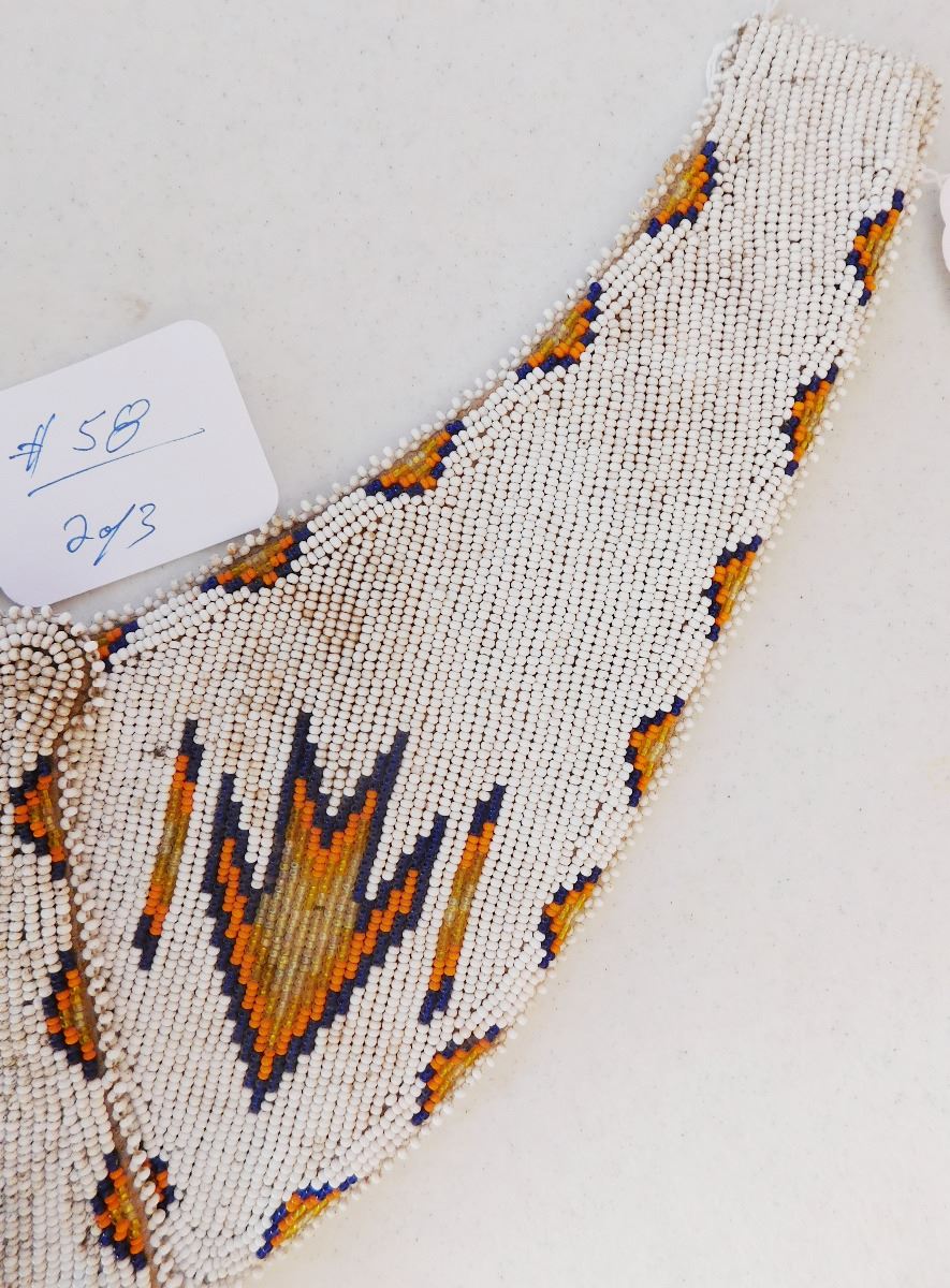 Cheyenne Beaded Neck Tie, circa 1930s. The item measures 13 x 19 inches. It is made from glass beads and trade cloth. It is in three separate pieces which need to be sewn together to wear. It is an Indian copy of a fancy "white man's necktie." This beadwork is in the design of arrowheads. Condition: Good, 3 separate pieces, see images. Shipping: $18.00