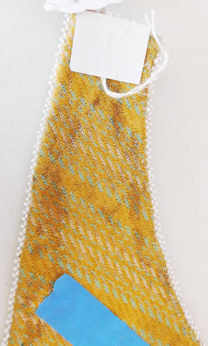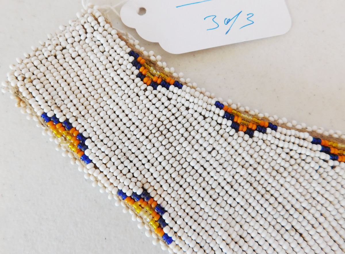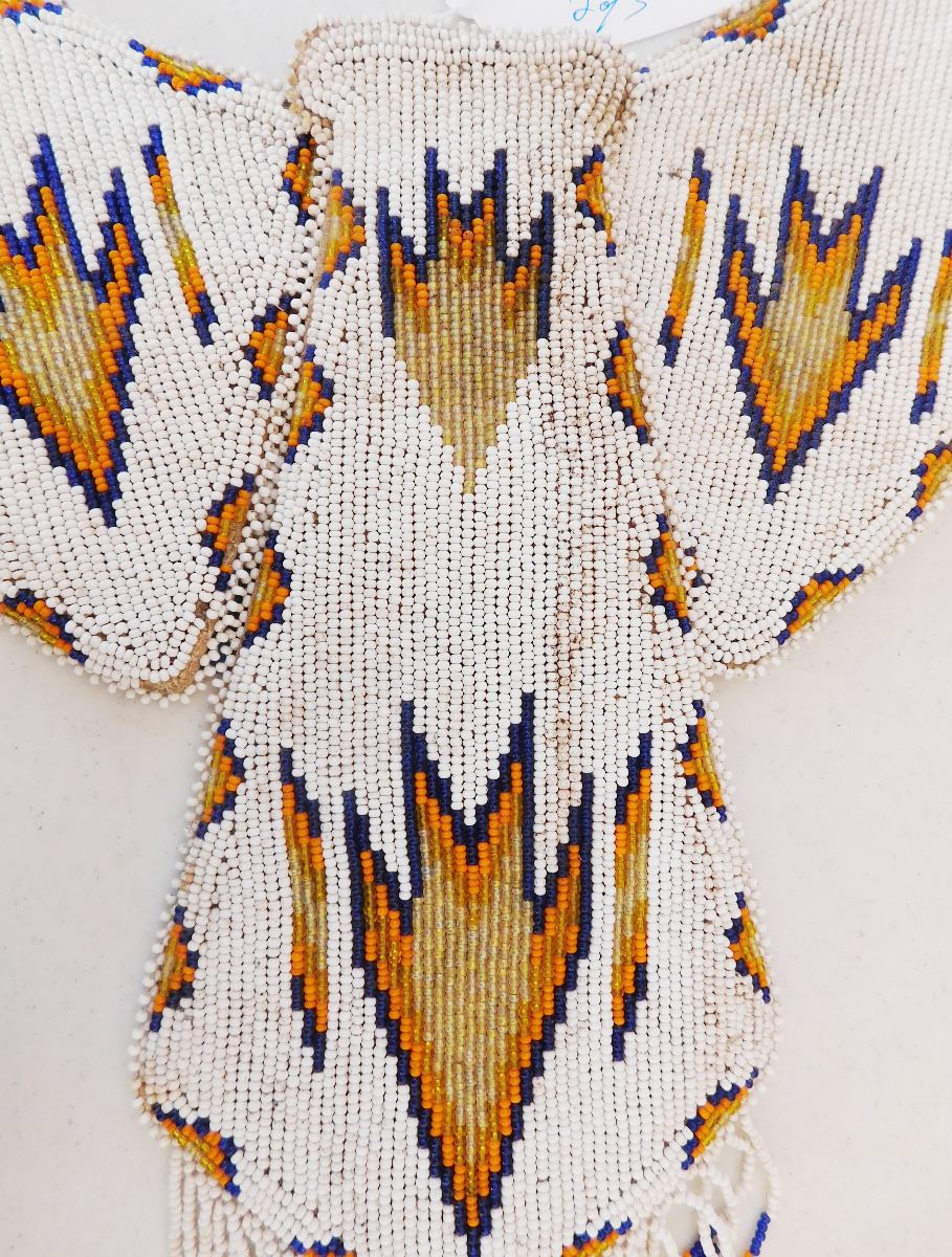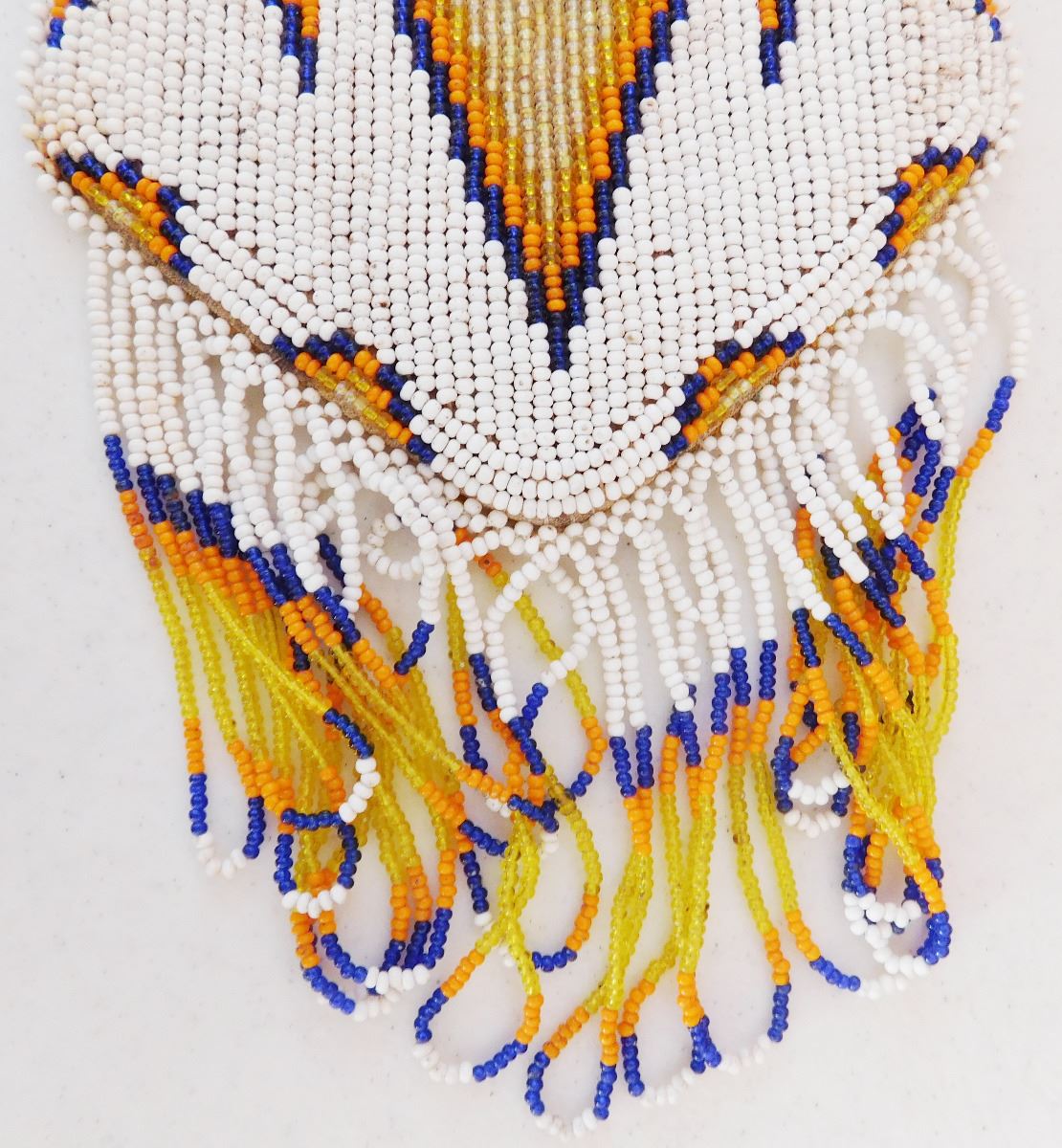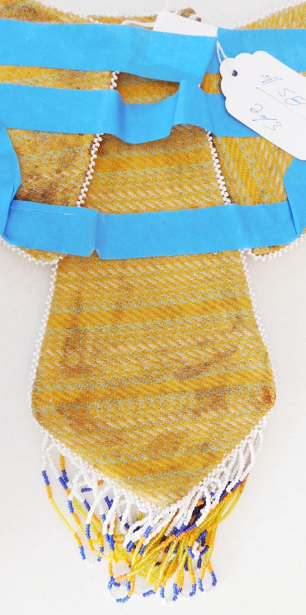 Cheyenne Beaded Neck Tie, circa 1930s. The item measures 13 x 19 inches. It is made from glass beads and trade cloth. It is in three separate pieces which need to be sewn together to wear. It is an Indian copy of a fancy "white man's necktie." This beadwork is in the design of arrowheads. Condition: Good, 3 separate pieces, see images. Shipping: $18.00
