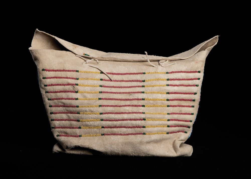 Cheyenne Beaded Possible Bag. With classic line beading in deep red, green and yellow. Sides fully beaded with green designs on pink and blue fields. Circa 1900, 9 1/2" x 15"