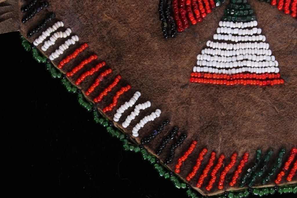 The pouch featrues 1800's trade glass seed bead work from the Cheyenne Native American Indians. The bag has a fancy beaded edge framing the piece with a center cross design. The bottom has cut fringe. The pieces were purchased and sold by Otto F. Ernst. Otto Ernst was a renowned Saddle Maker and would purchase Native American items to sell in his Saddle shop and Catalog. Otto Ernst Saddlery Sheridan, Wyoming. The piece came from the King Saddlery Museum. The bag is from the first to second quarter of the 20th century. Bag measures 5.75"x8".