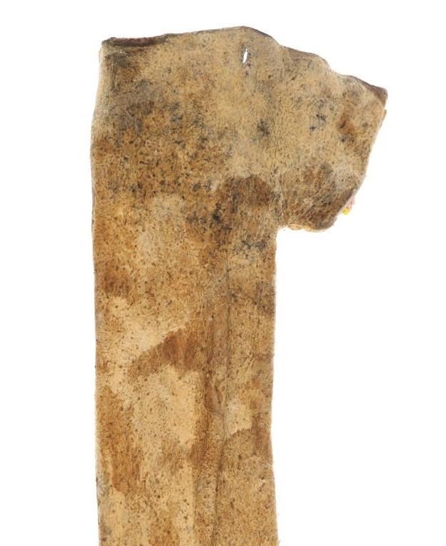 The lot features an Indian hide parfleche beaded sheath attributed to the Cheyenne pattern paired with an old dagger fashioned from an antique bayonet. The antique knife shows a bayonet blade with flase back edge, brass hilt hand guard and old Elk tine antler that has deeply yellowed from age with a metal pommel end. The sheath shows a parfleche rawhide being slightly softened with sinew and trade thread sewing. The front has classic Cheyenne pattern beadwork in glass beds with colors of Cheyenne pink, greasy yellow and red having a couple crazy beads throughout. The knife measures 11.25"L with a 7"L blade. Sheath is 13"L with bottom fringe ties and 3.5"W.