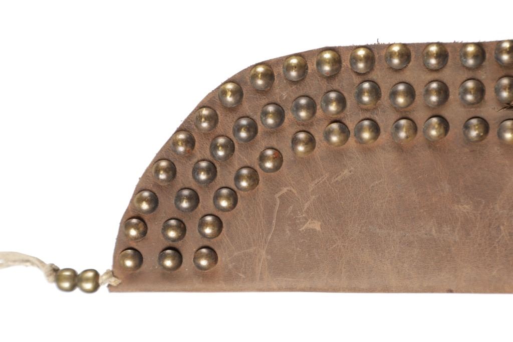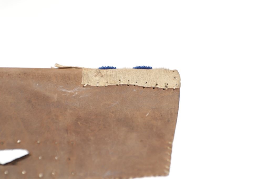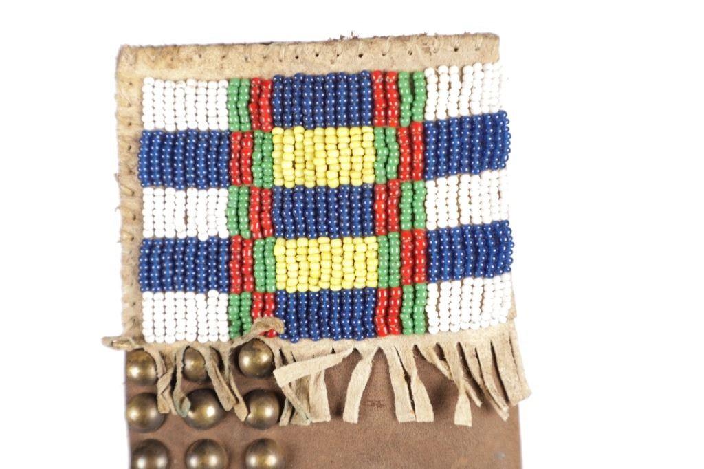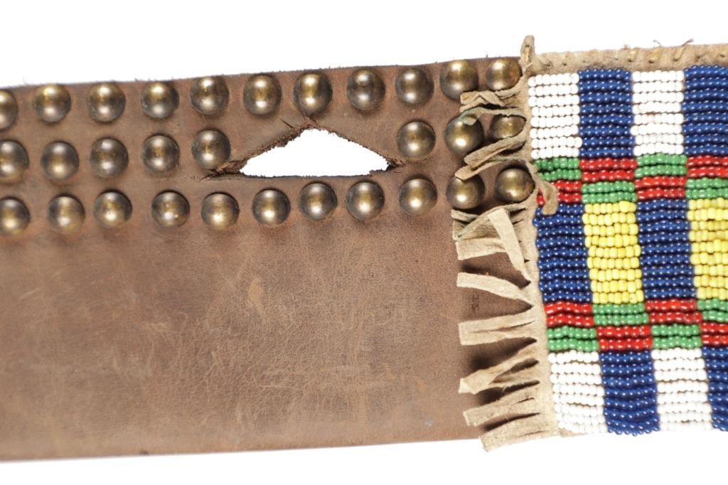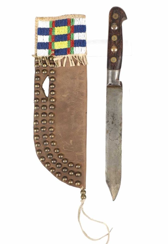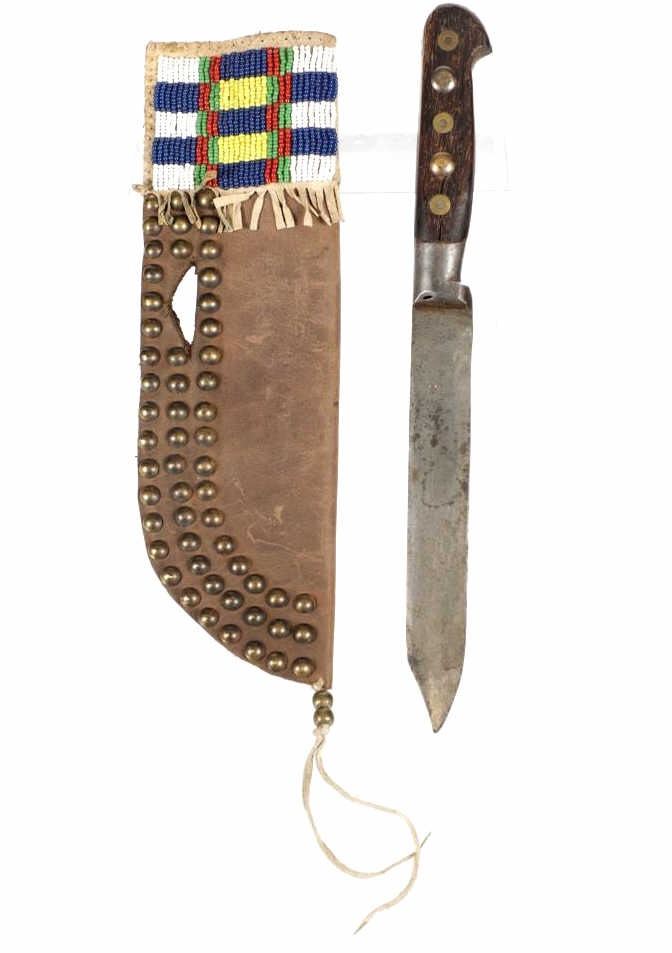 The lot features a beaded hide and harness leather sheath from the Cheyenne Indians with an old 19th Century trade knife. The sheath is 10 inches long by 3 inches wide and is comprised of old brown harness leather with brass tacking. There is a small strip of buckskin lacing with two old brass beads tied onto the bottom. There is a piece of beaded buckskin sewn onto the front done in a classic Cheyenne “bar” design in typical colors. There is sinew sewing and a belt slot cut through. The old trade knife has a wooden handle with copper rivets and brass tacking. Overall the knife is 11 inches long.