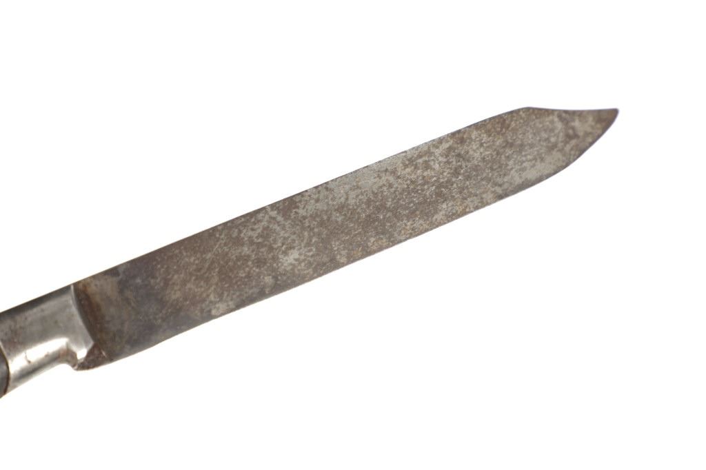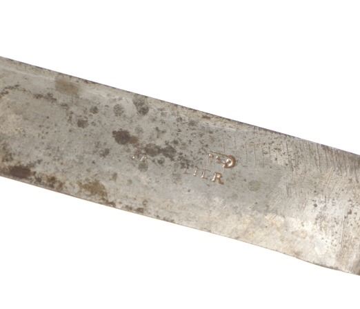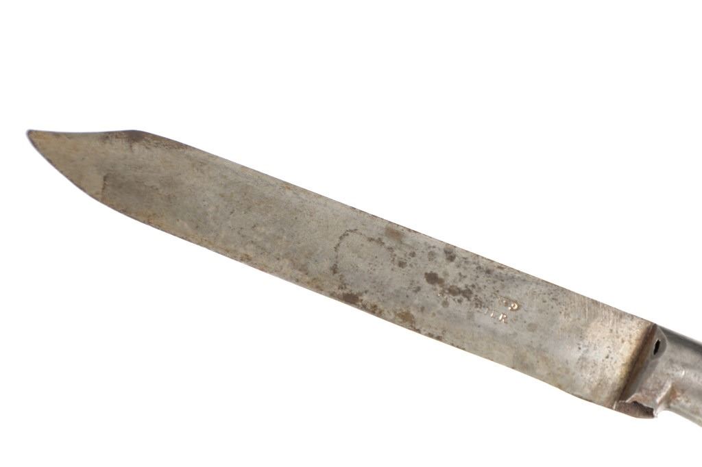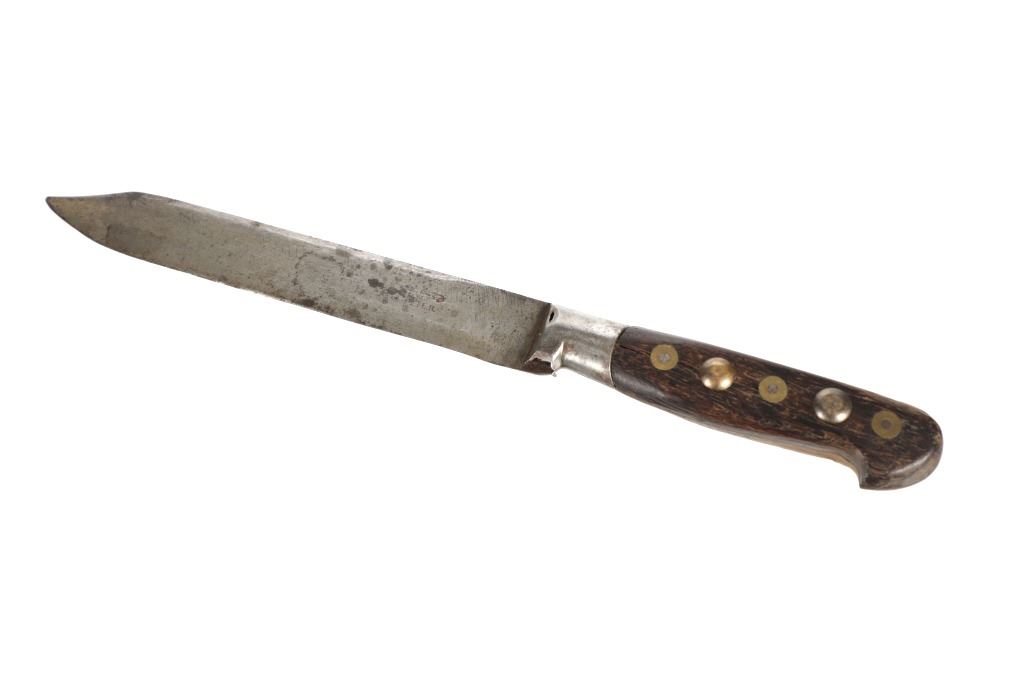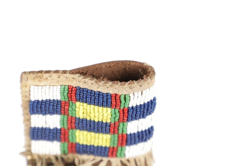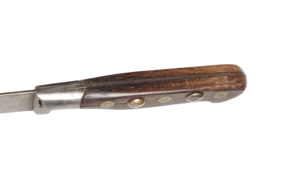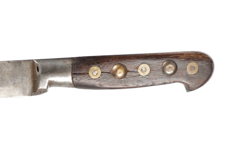The lot features a beaded hide and harness leather sheath from the Cheyenne Indians with an old 19th Century trade knife. The sheath is 10 inches long by 3 inches wide and is comprised of old brown harness leather with brass tacking. There is a small strip of buckskin lacing with two old brass beads tied onto the bottom. There is a piece of beaded buckskin sewn onto the front done in a classic Cheyenne “bar” design in typical colors. There is sinew sewing and a belt slot cut through. The old trade knife has a wooden handle with copper rivets and brass tacking. Overall the knife is 11 inches long.