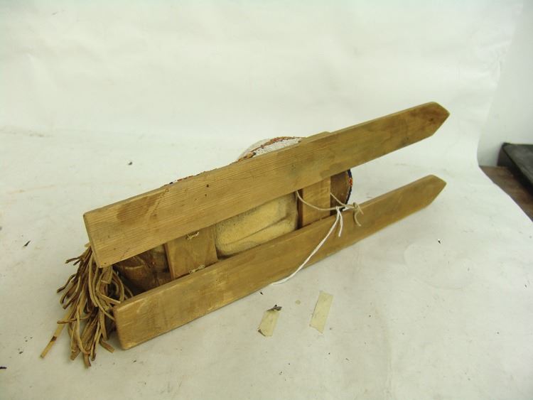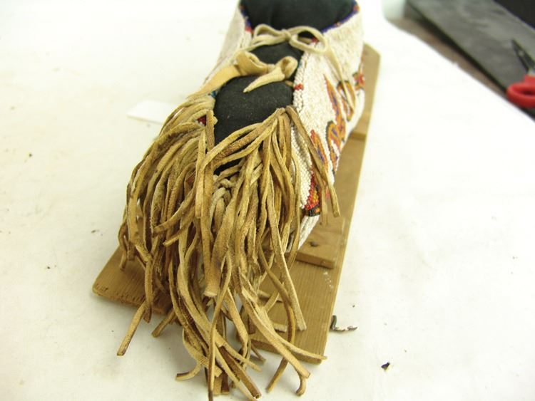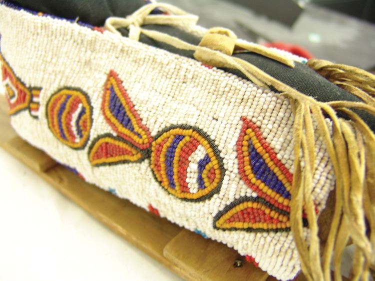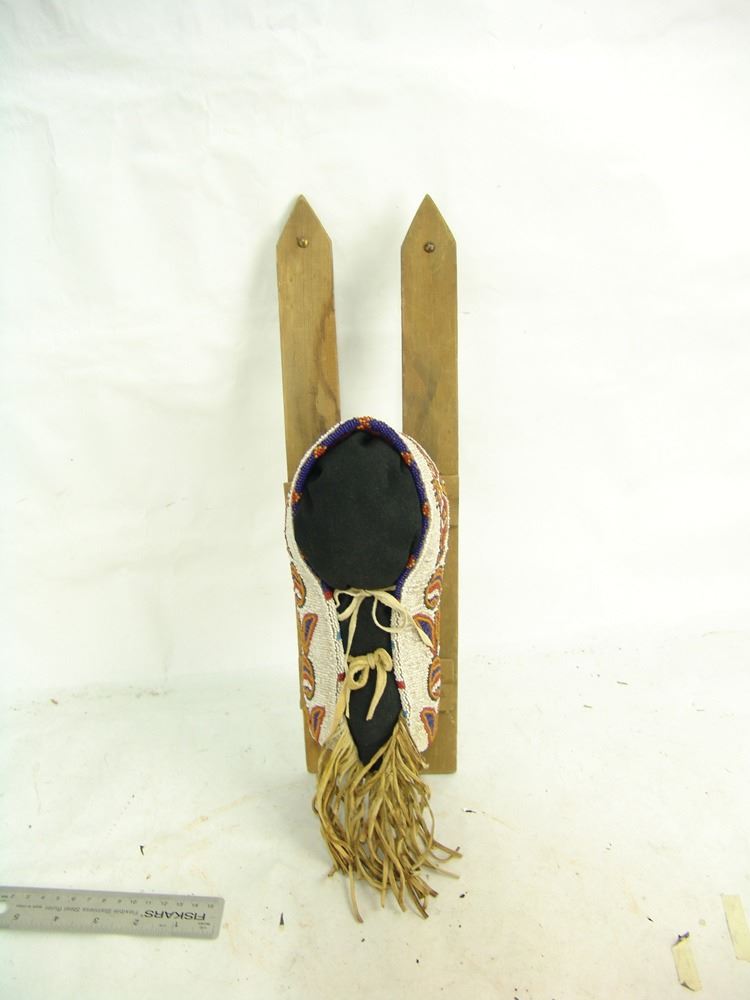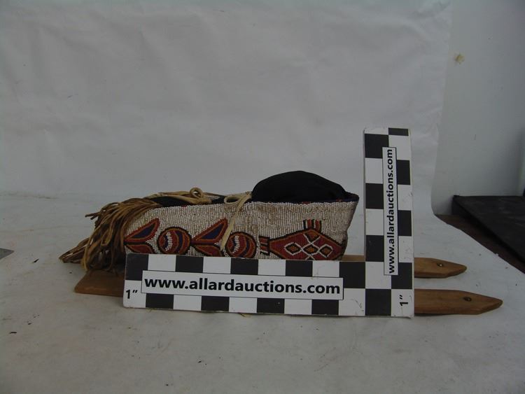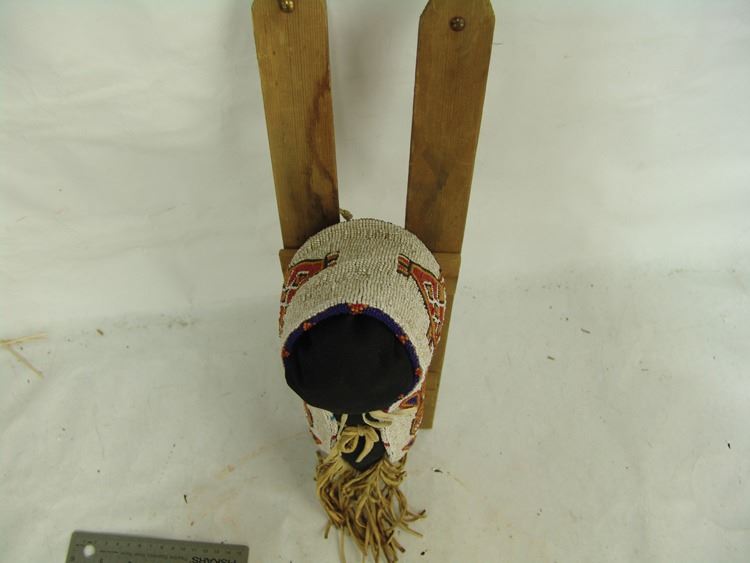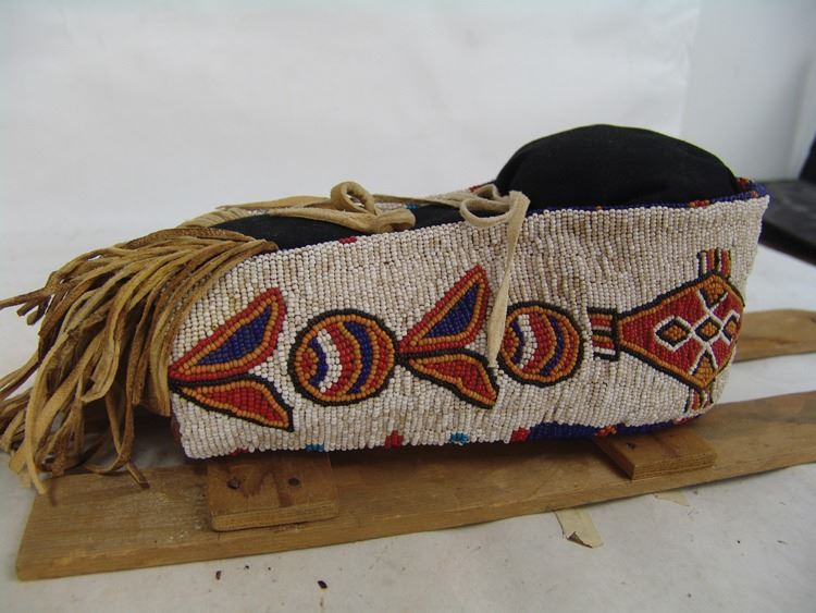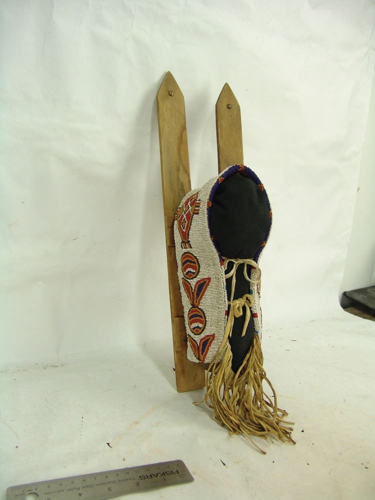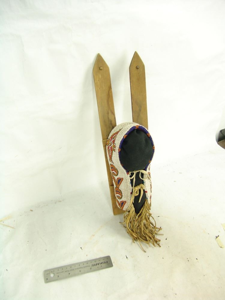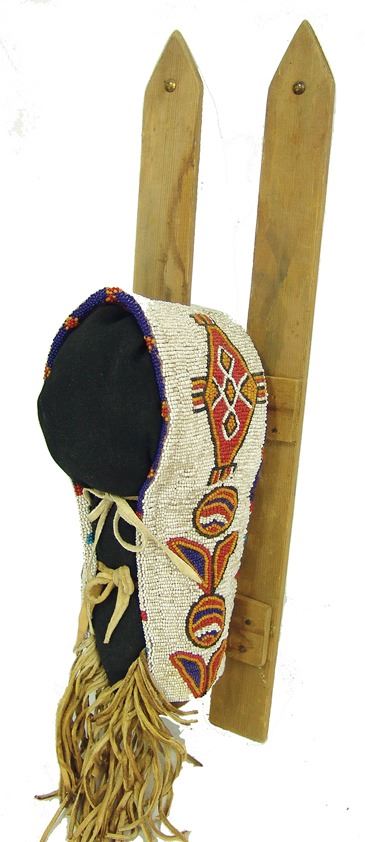 Wonderful flat and contour beaded toy cradleboard with colorful and interesting floralistic figures on a white field, and with wooden slats and fringe. Very good condition.,Mid to Late 1900s,17" (BDWK)