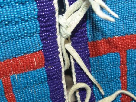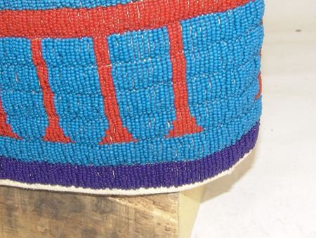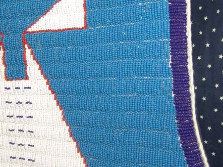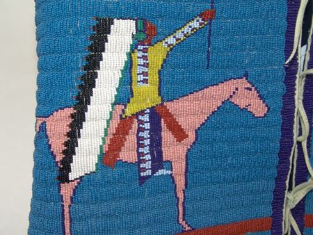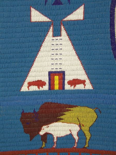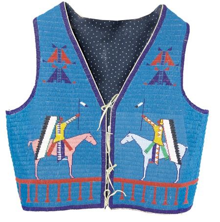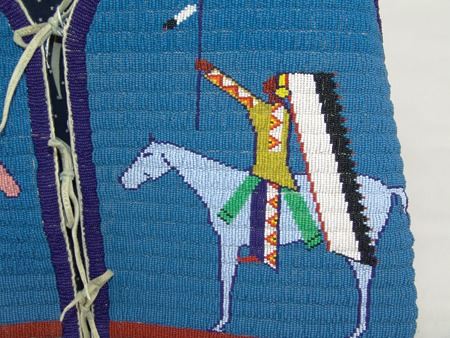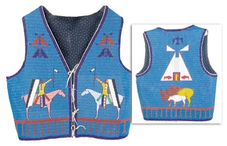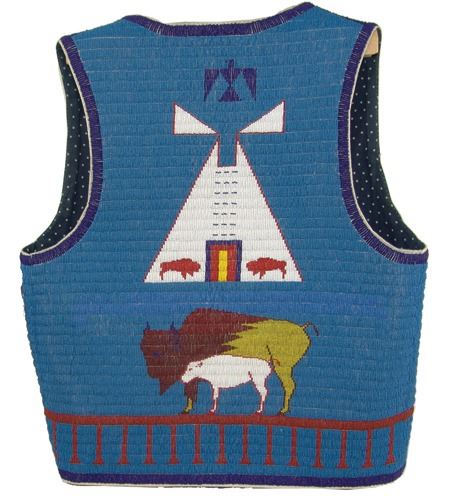 Ca. 2000's, Fantastic lazy stitch beaded thread sewn man's vest with buffalo, tepee, and traditional geometric figures, plus two horses with riders, all done on a sold blue field; canvas backed with calico lining. Very good, barely used condition. Men's Medium 20"x 23"