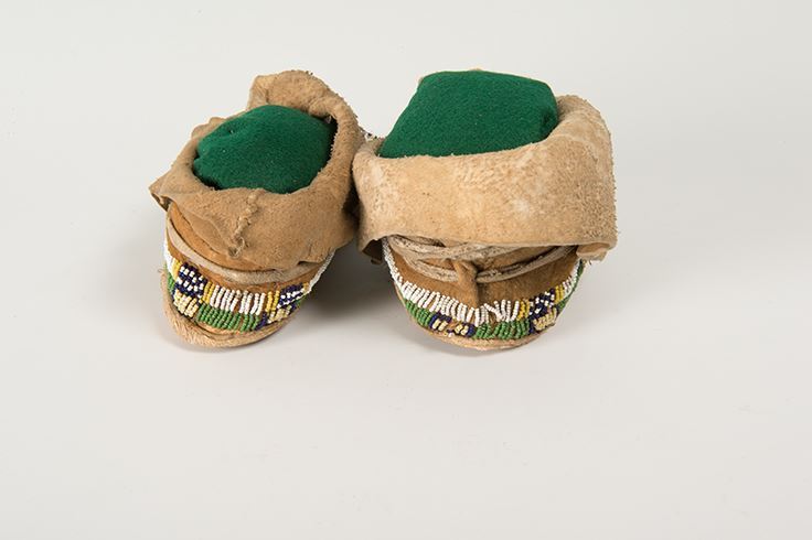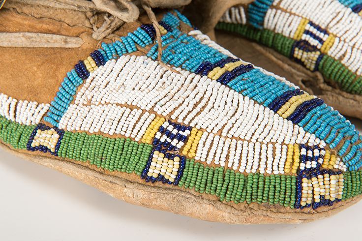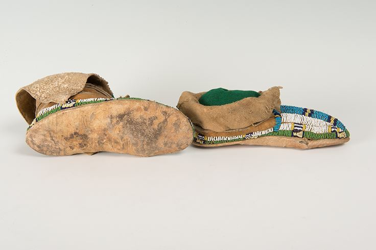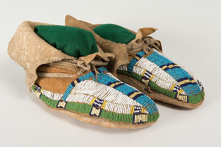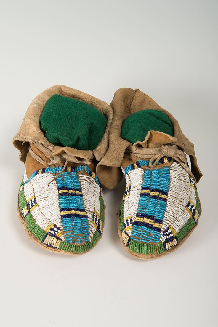 Cheyenne Beaded Woman's Moccasins. 9 ½" long. Blue, yellow and green beadwork designs on white background. 19th century.