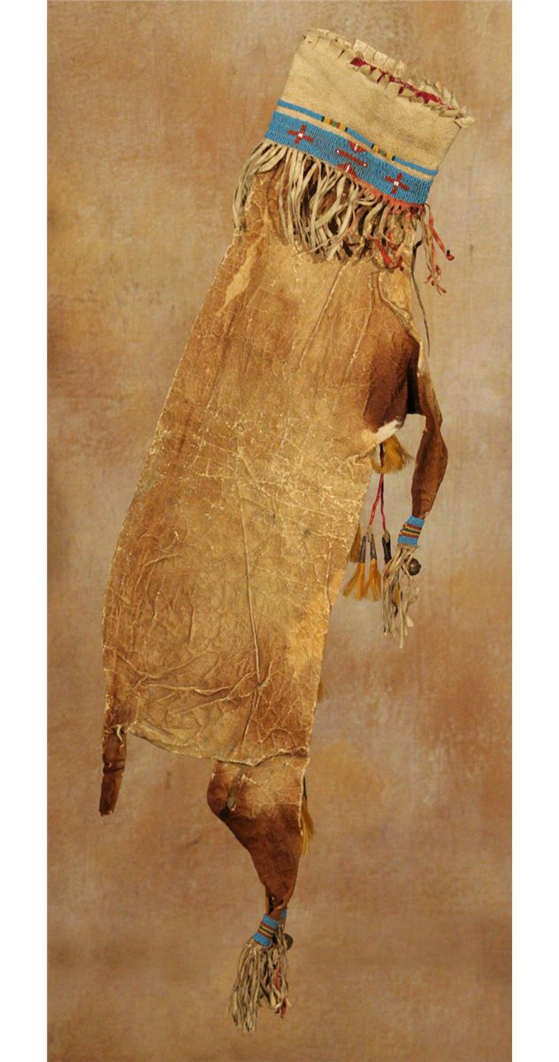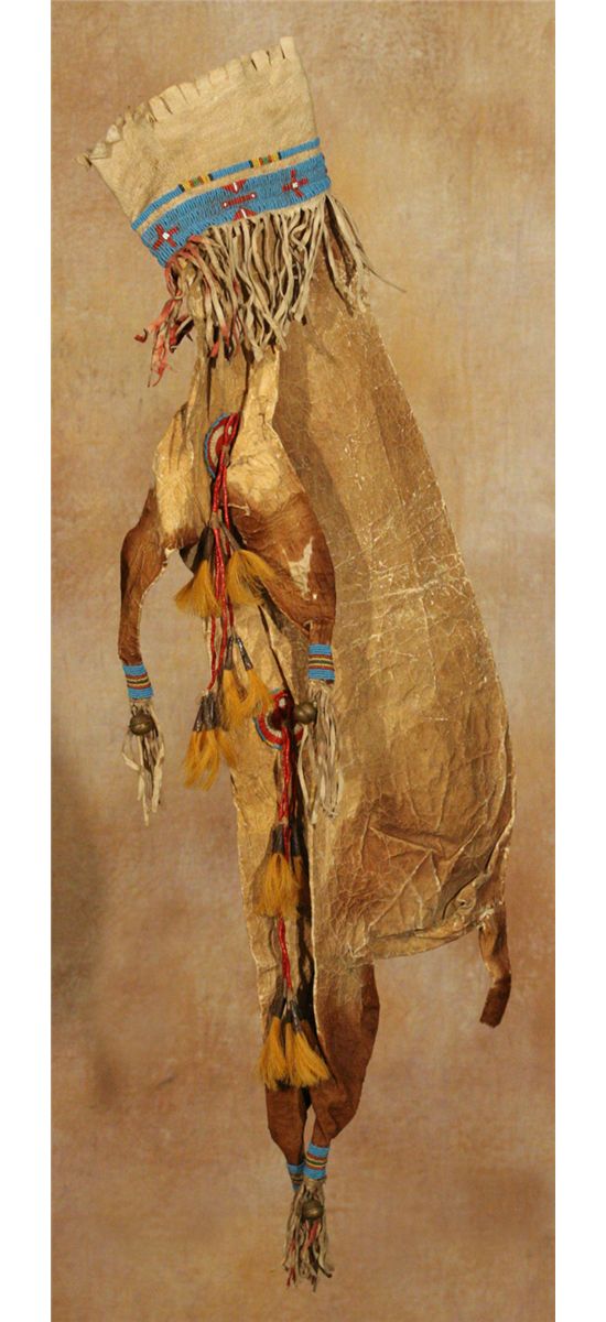 Cheyenne Bag. 36" overall length. Constructed of the tanned hide of an unborn Buffalo calf. Beaded around the top and legs, which are decorated with hawk bells. 4.5" of beaded leather added to the top, lined with trade cloth. Two quilled roundels on the belly with quilled drops of various lengths, terminating in tin cones filled with horsehair. Likely used as a pipe bag. Collected from the Bald Eagle family-Standing Rock reservation. Circa 1880. Provenance: Ex-Wintersteen collection.