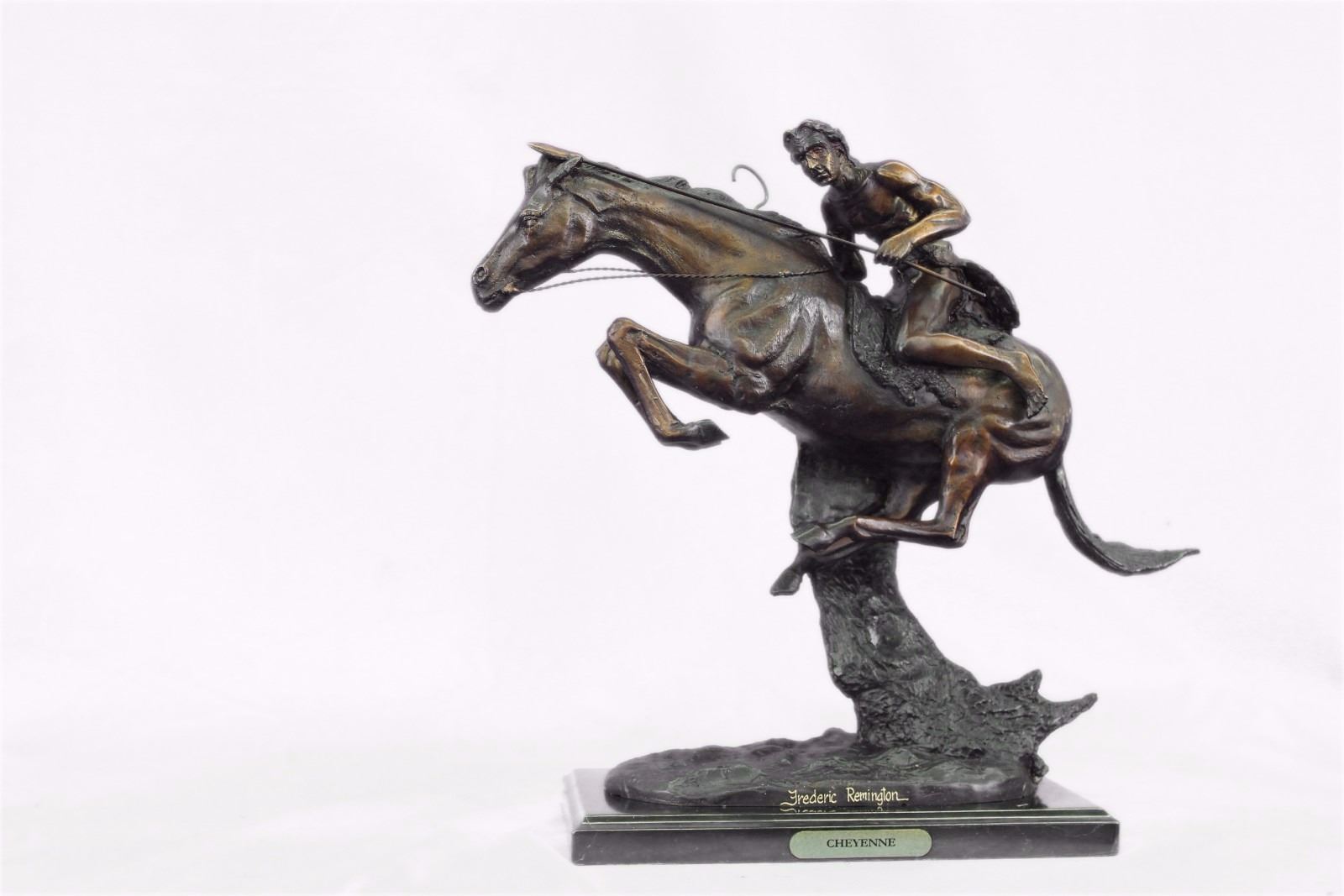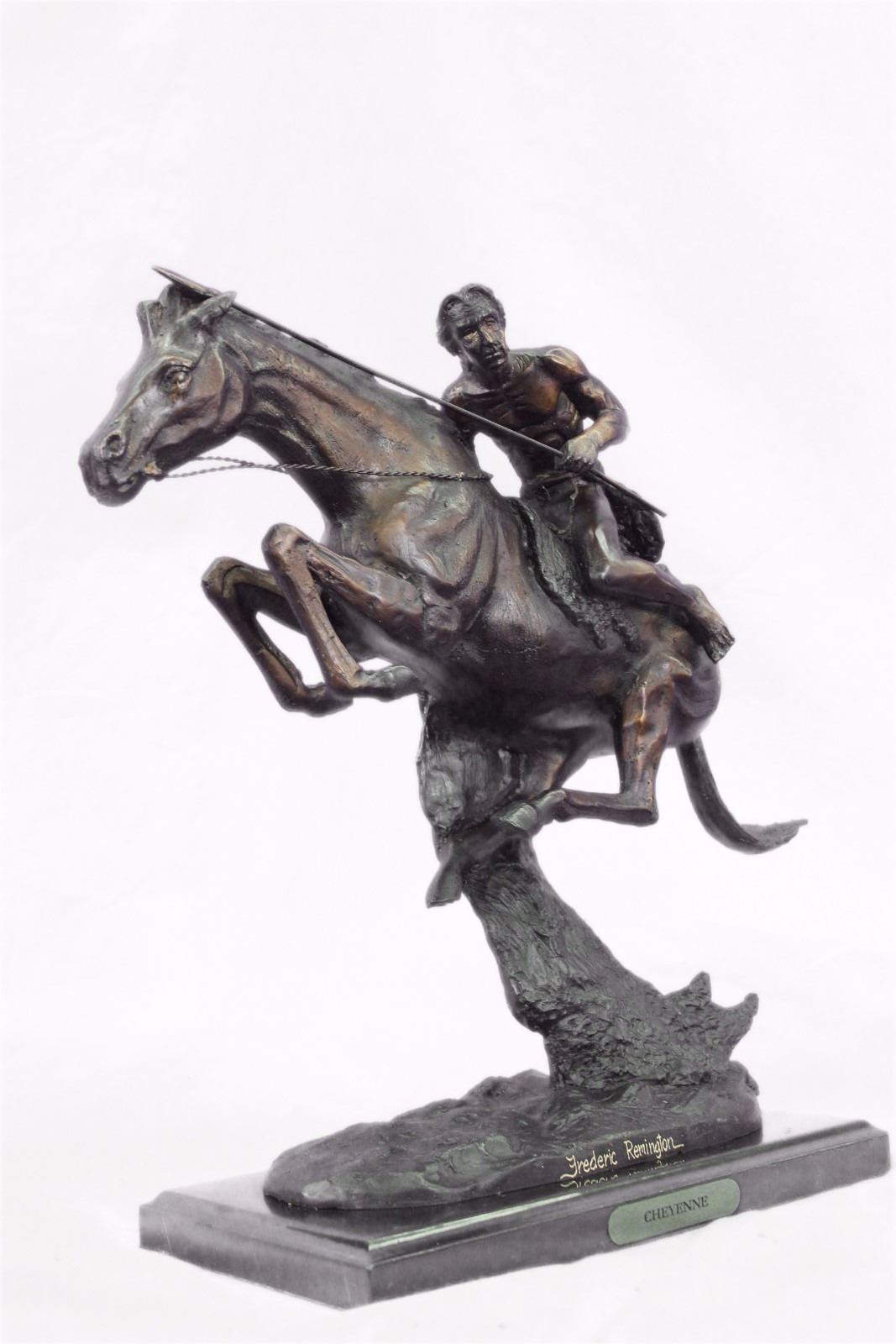 A Native American Indian Gallops Across The Desert With His Horse. Armed With A Spear, He Leans Into His Horse'S Body, Ready To Attack. The Horse Keeps His Head Low, Its Nose Pointed Forward As He Runs Powerfully. The Careful Details Can Be Seen In The Cut Of The Horse'S Strong Legs And The Glare In Its Face. 100% Bronze And Handmade, This Brown Patina Sculpture Was Cast Using The Lost Wax Method And Mounted On A Black Marble Base. Bronze Dimensions With Marble Base: Height 17 X Width 19 inches. Weight: 22 Lbs. Please Note: This is a reproduced bronze sculpture from the original molded and signed. This featured bronze sculpture is a recast after the original, and has been done recently. This 100% bronze sculpture is an abstract piece certain to be a conversation piece.