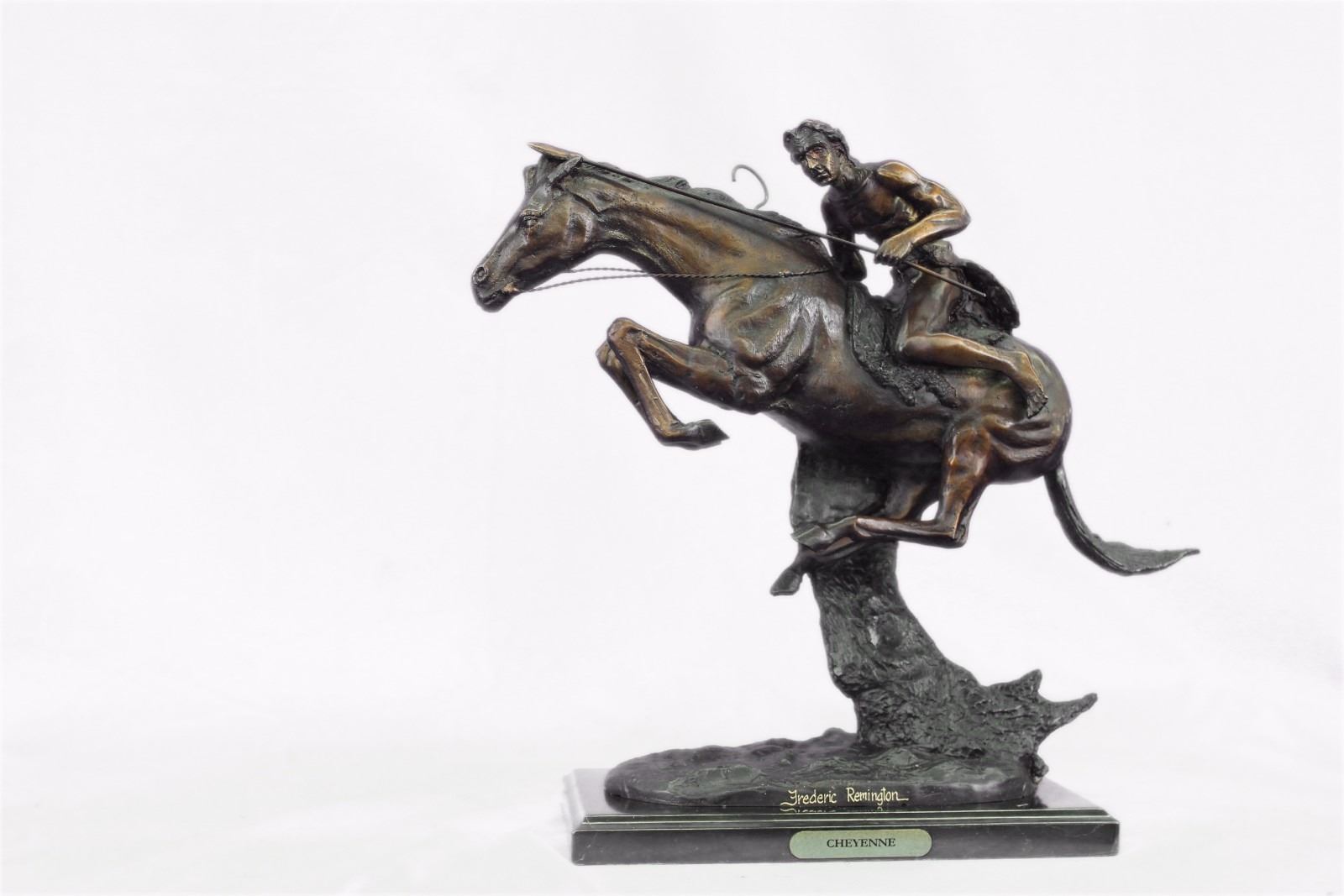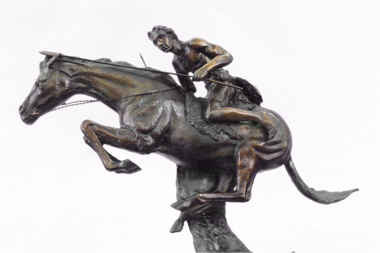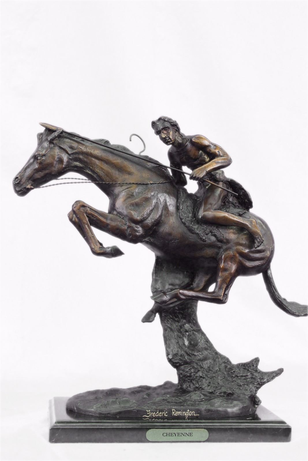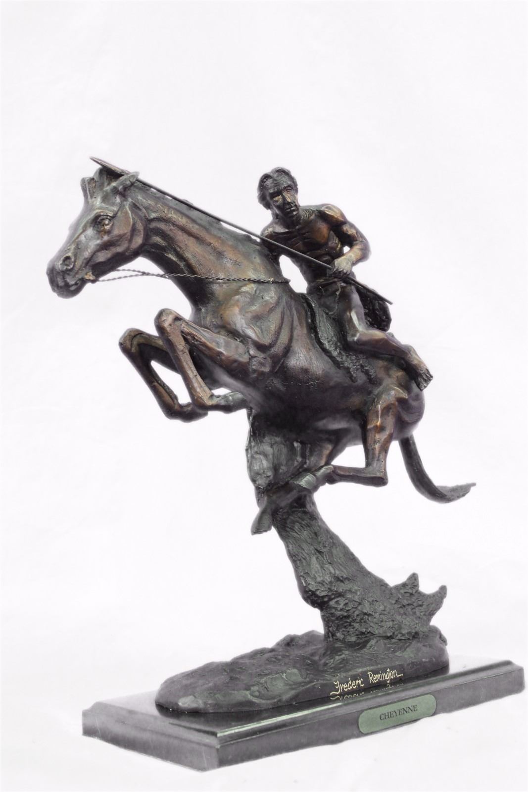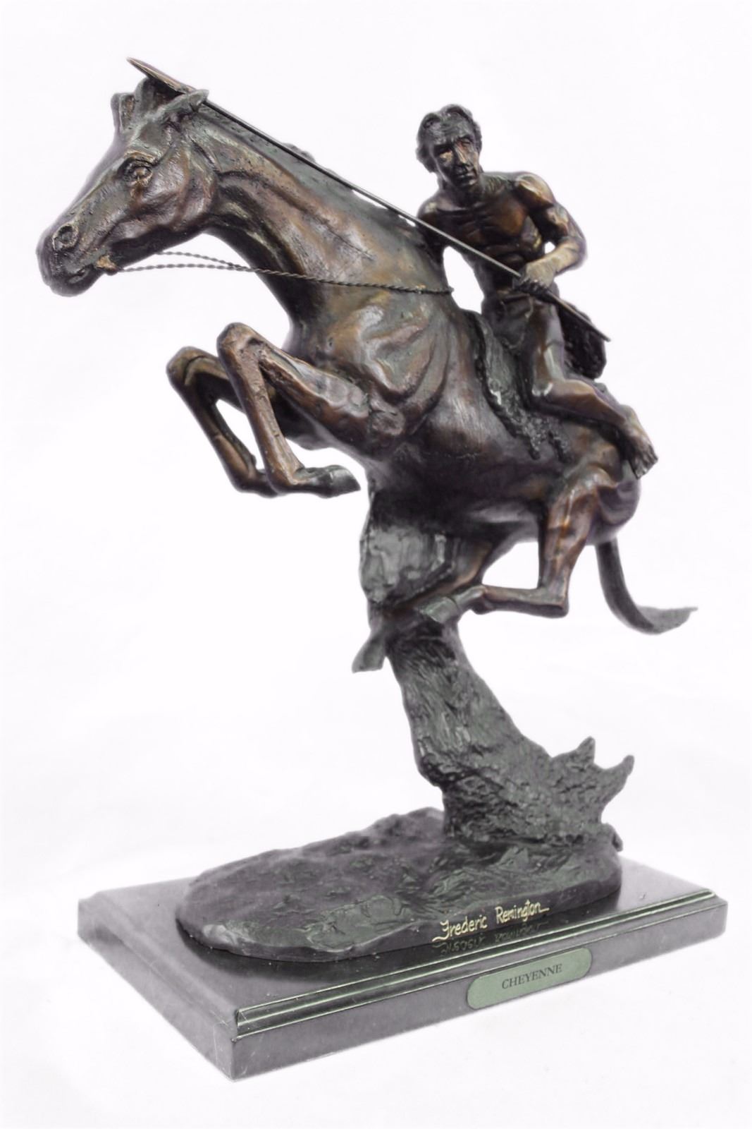 A Native American Indian Gallops Across The Desert With His Horse. Armed With A Spear, He Leans Into His Horse'S Body, Ready To Attack. The Horse Keeps His Head Low, Its Nose Pointed Forward As He Runs Powerfully. The Careful Details Can Be Seen In The Cut Of The Horse'S Strong Legs And The Glare In Its Face. 100% Bronze And Handmade, This Brown Patina Sculpture Was Cast Using The Lost Wax Method And Mounted On A Black Marble Base. Bronze Dimensions With Marble Base: Height 17 X Width 19 inches. Weight: 22 Lbs. Please Note: This is a reproduction bronze sculpture from the original molded and signed. This featured bronze sculpture is a recast after the original, and has been done recently. This 100% bronze sculpture is an abstract piece certain to be a conversation piece.Please Note: This is a reproduction bronze sculpture from the original molded and signed. This featured bronze sculpture is a recast after the original, and has been done recently. This 100% bronze sculpture is an abstract piece certain to be a conversation piece.