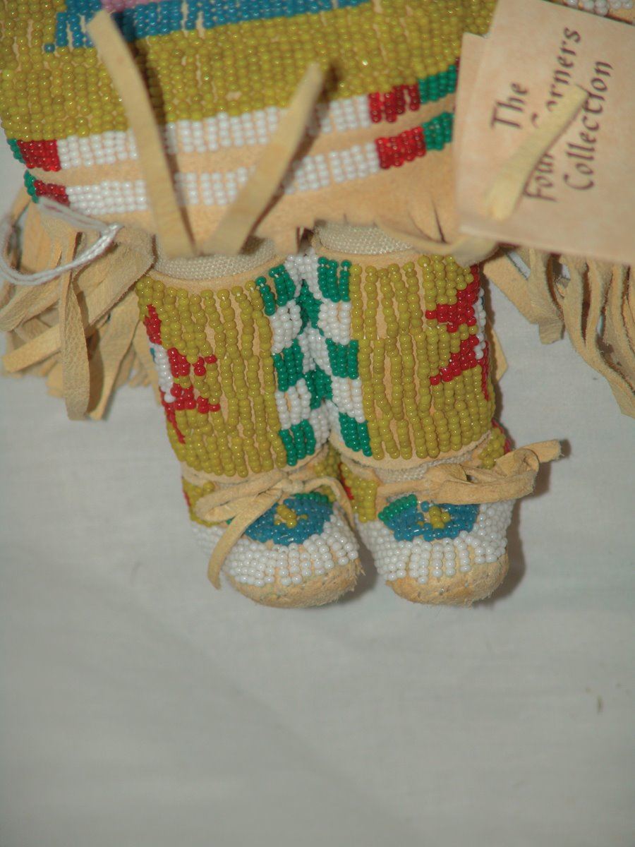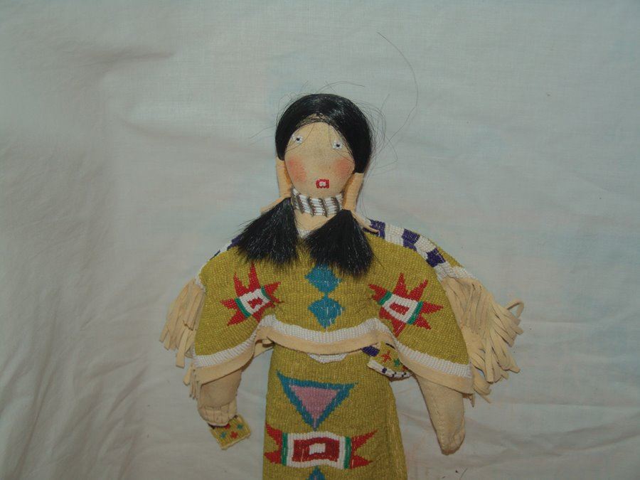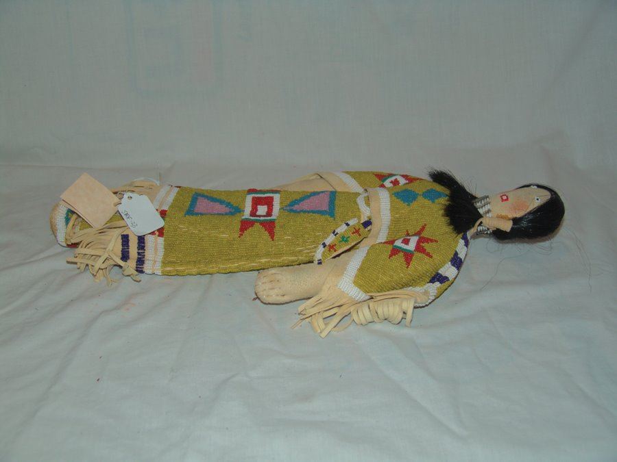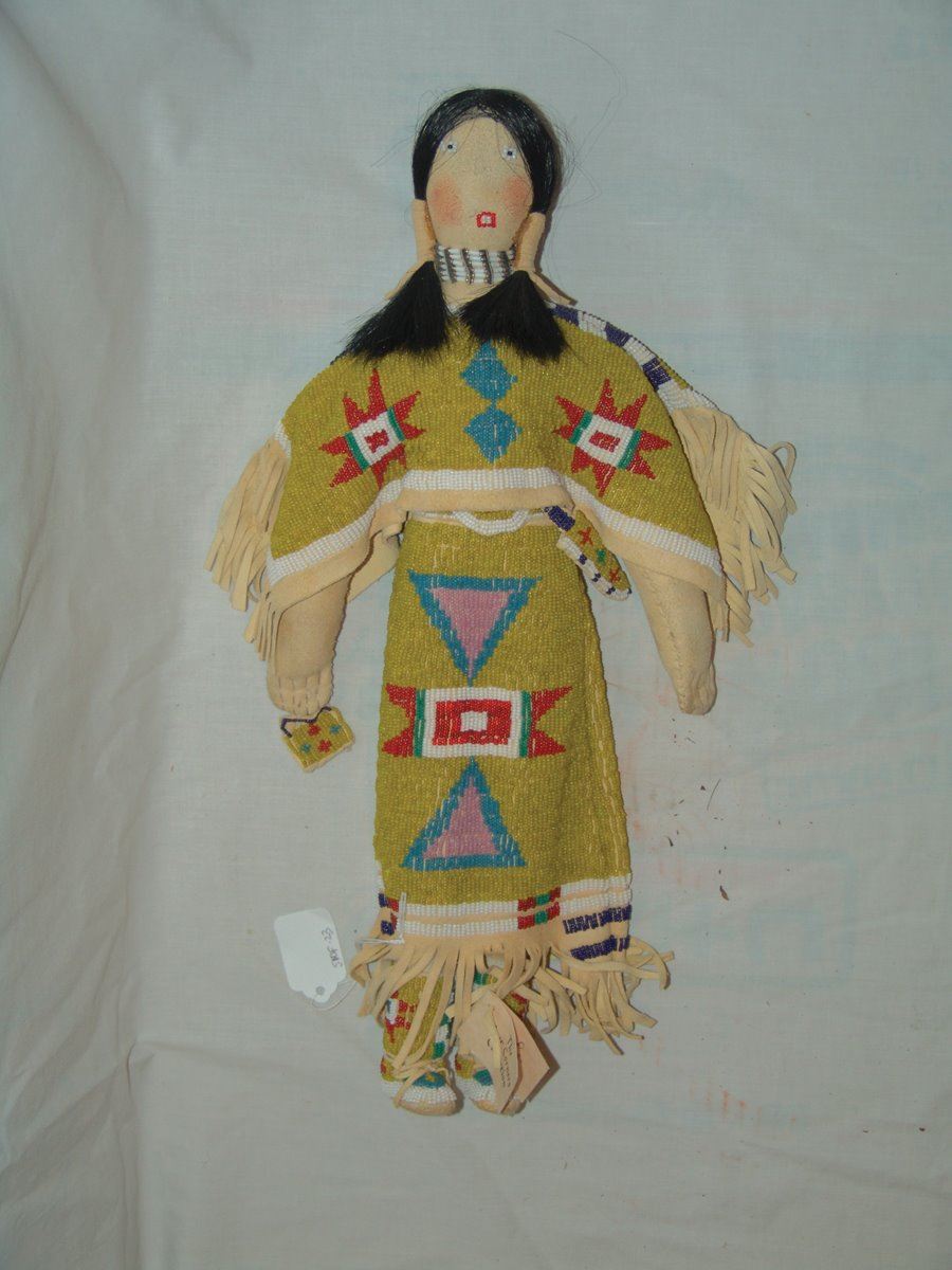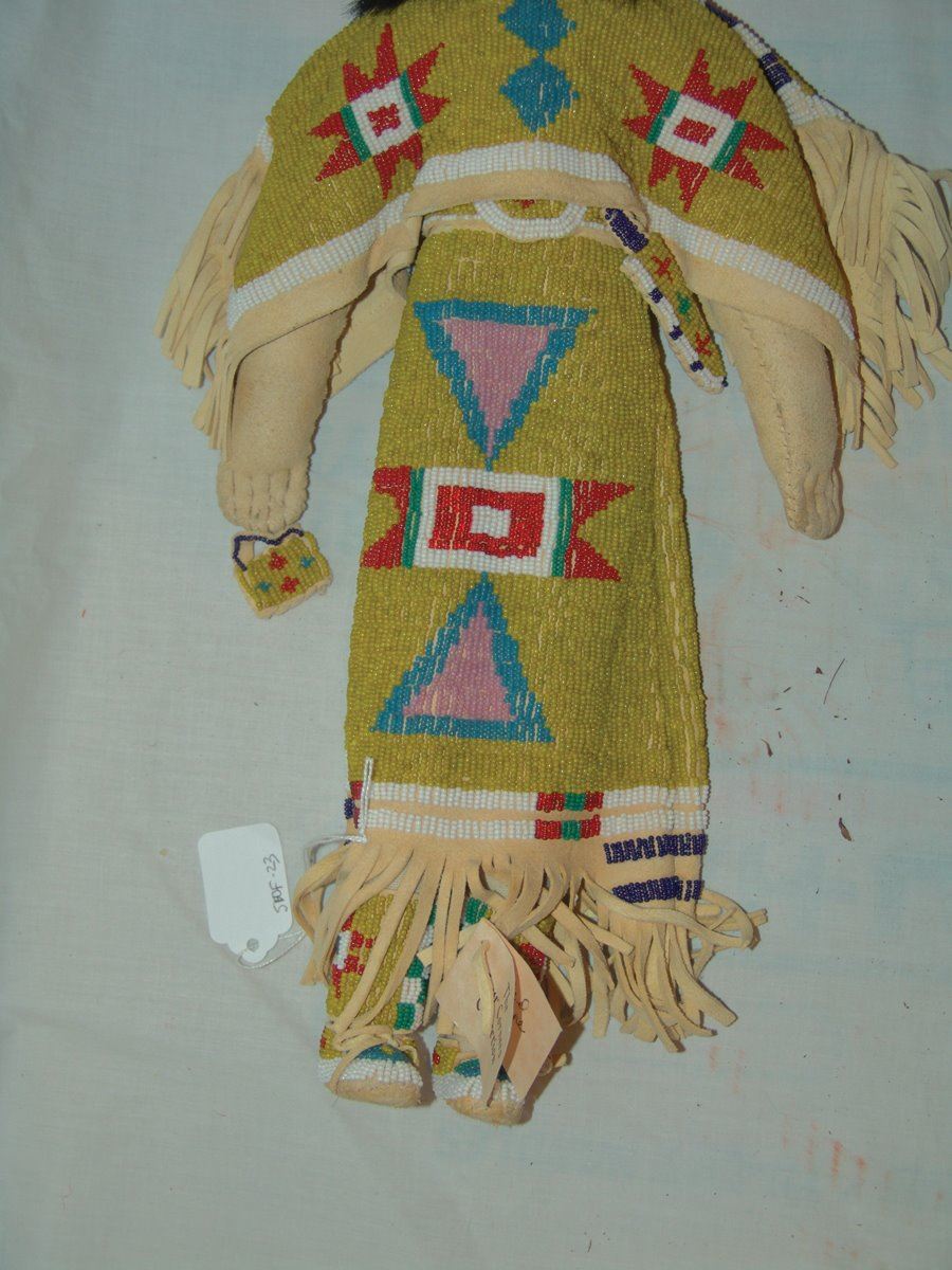 Wonderful larger sized handcrafted buckskin boll with beautiful matching lazy stitch beaded dress, yoke, moccasins, leggings, purse, and belt. Very good like new condition.,,18"