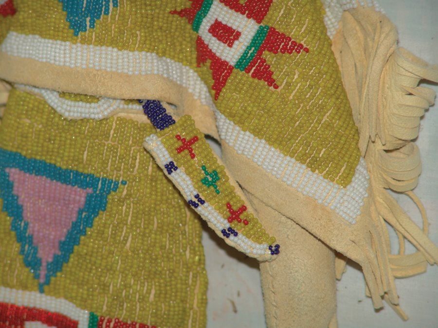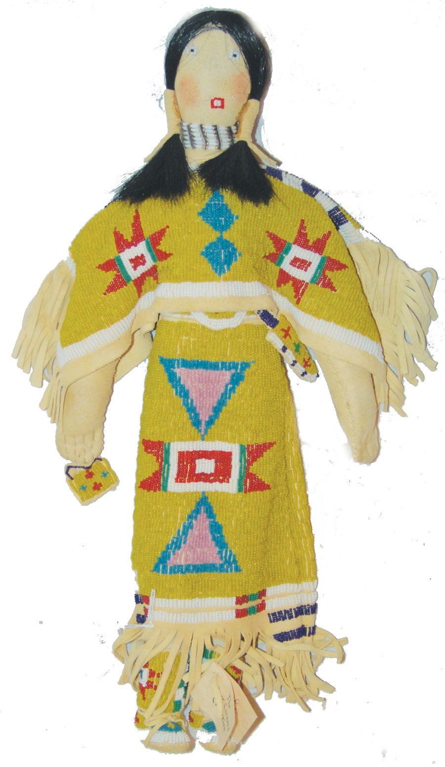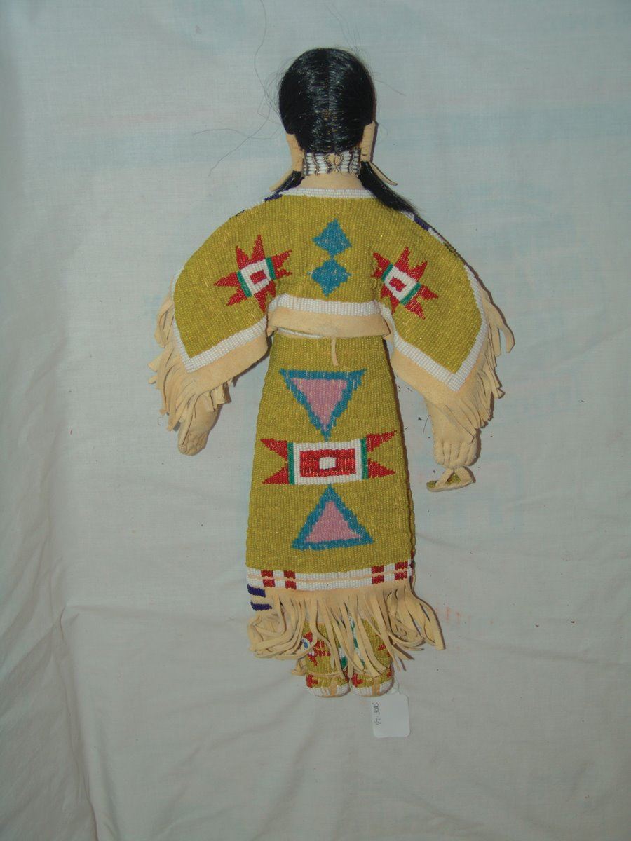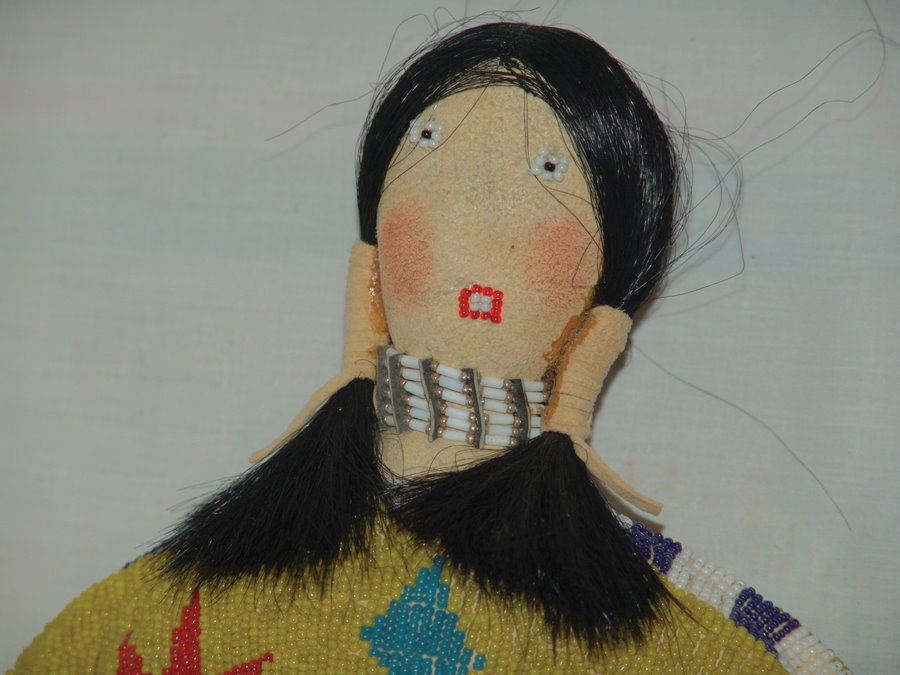 Wonderful larger sized handcrafted buckskin boll with beautiful matching lazy stitch beaded dress, yoke, moccasins, leggings, purse, and belt. Very good like new condition.,,18"