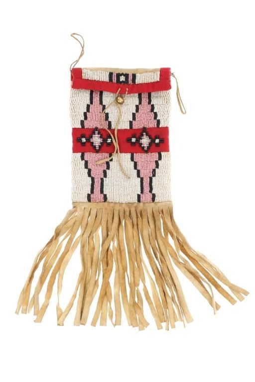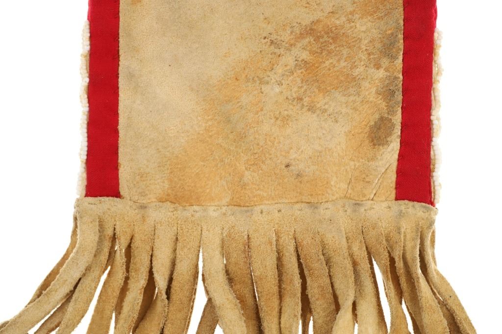 The lot features a beaded buffalo hide dispatch bag attributed to the Cheyenne Indians. The bag is comprised of Indian brain-tanned buffalo hide and is nicely beaded on the front in traditional Cheyenne geometric patterns. The pouch is thread sewn and has red stroud clothe, a copper button, and thick cut fringe off the bottom. Measures 6 ½ inches wide by 17 inches long.