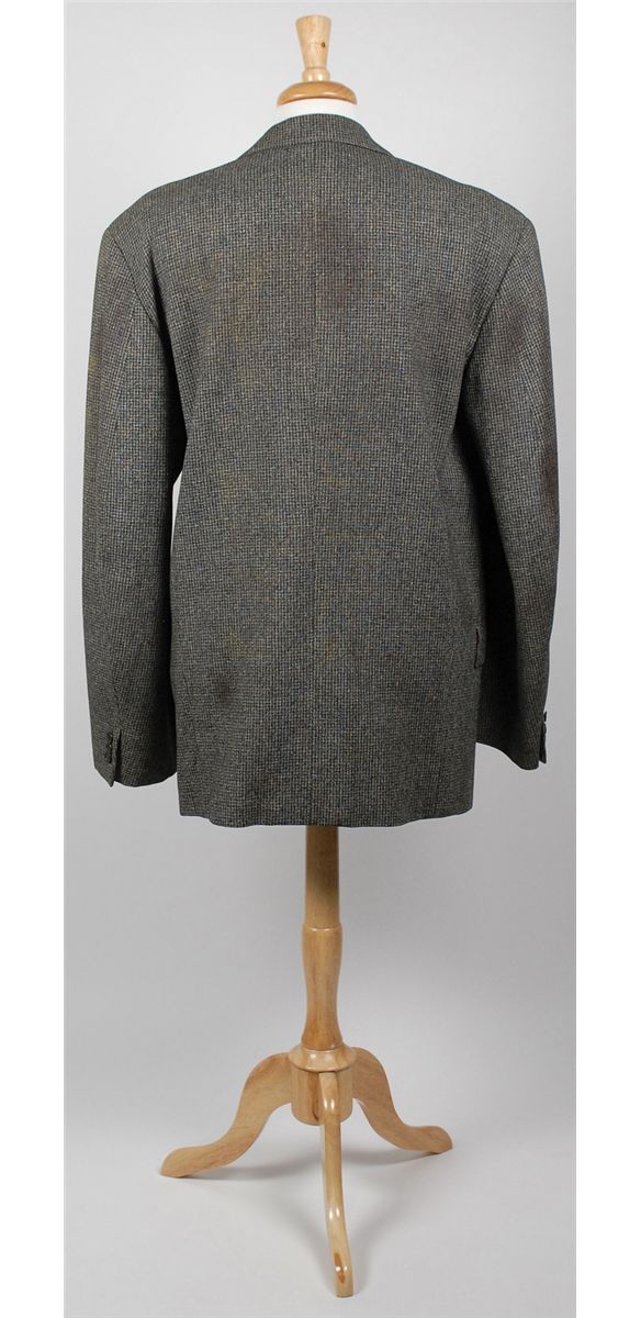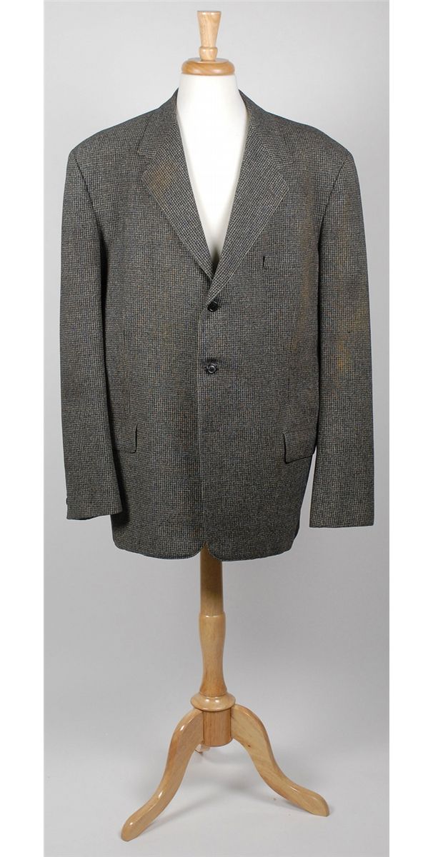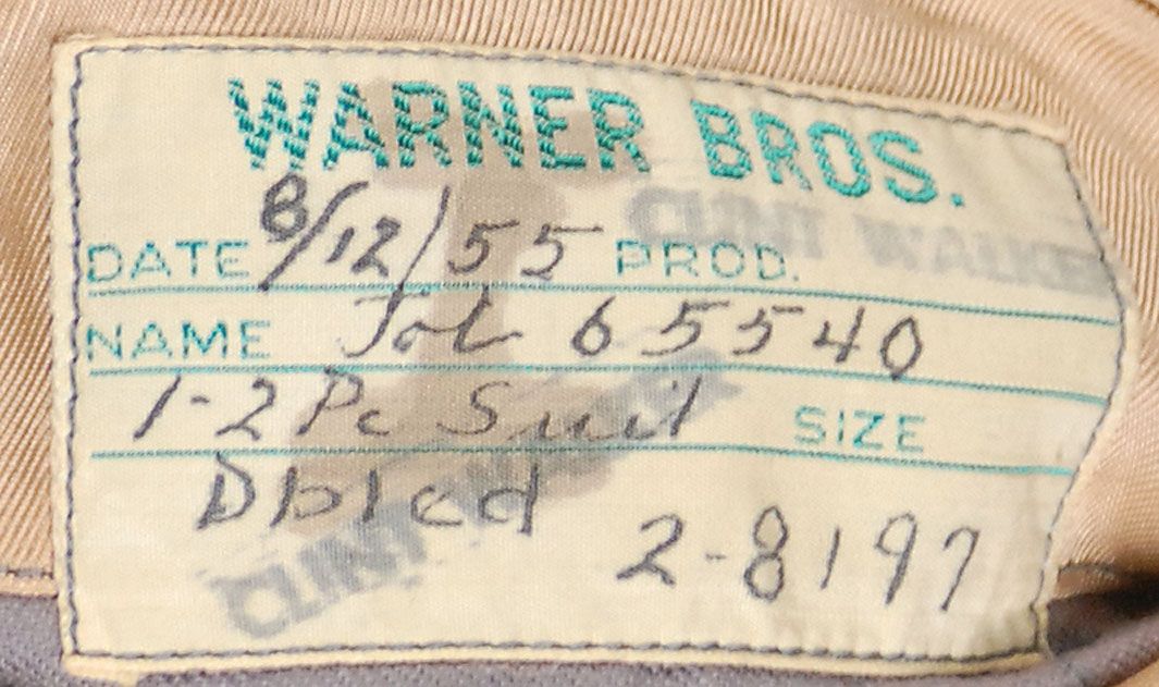 Sports jacket worn in a production by Clint Walker in the 1955 Cheyenne episode entitled The Last Train West. Single-breasted gray tweed jacket has a Warner Bros. label sewn into the inside breast pocket, with Walker’s name stamped at the top and “8/12/55, Job 65540, 12 pc Suit, Dbled 2-8197,” written below. In fine condition.