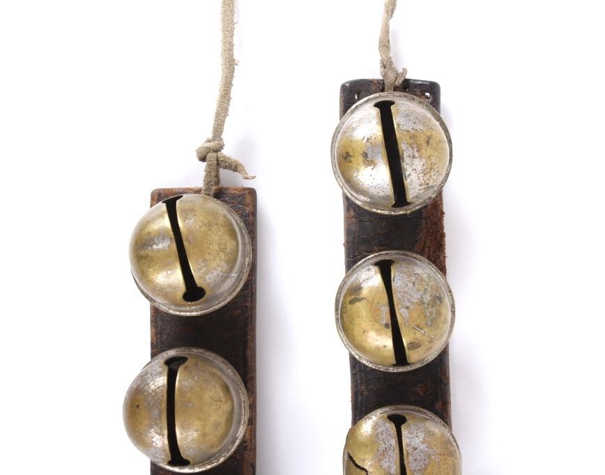 The lot features a set of brass covered metal dance bells from the Cheyenne Native American Indians datint to the late 19th Century. The set would have been worn as arm bands, cuffs or legging bands for dance ceremonies. The set was harvested from early sleigh bells which most likely were traded to the Cheyenne Indians. The set shows a total of thirteen brass covered metal bells on a harness saddle leather band which is tied with Indian tanned hide ties. Each set is approximately 10.5-11"L inside wrist size. Each bell is 1.5"x1.25".