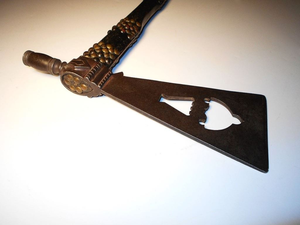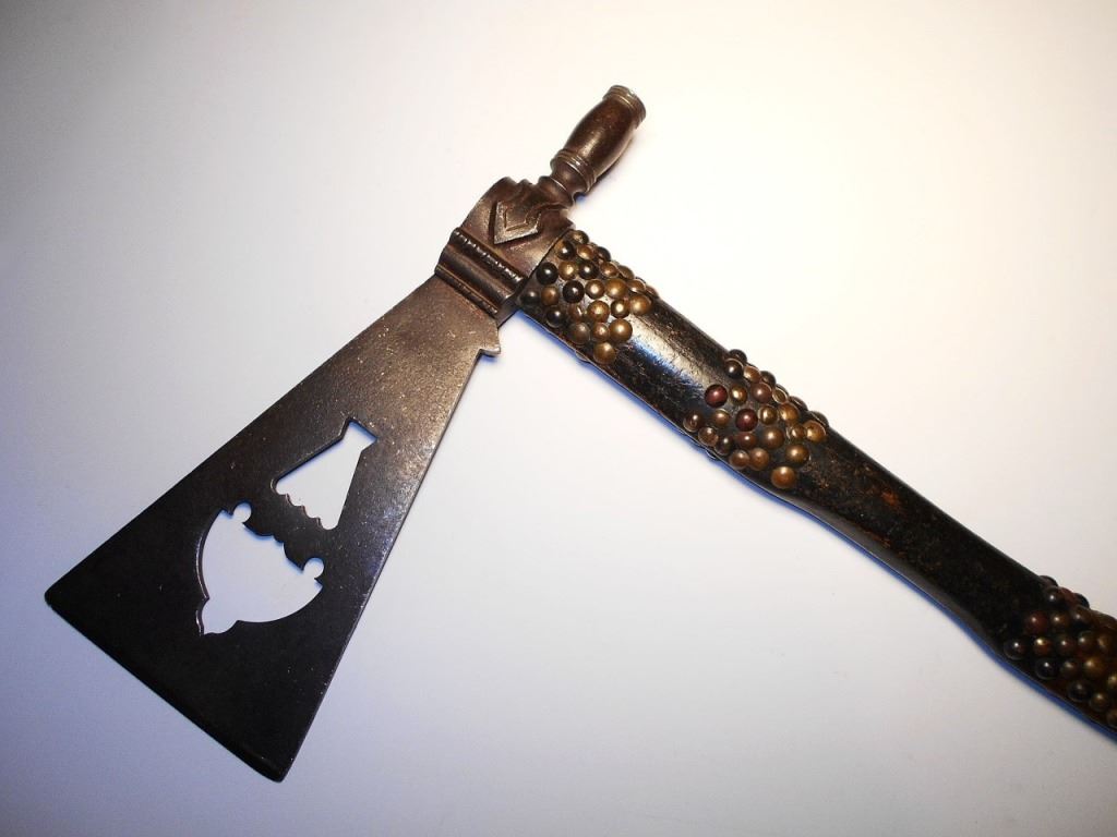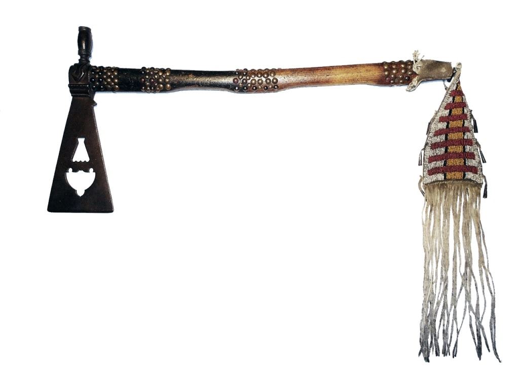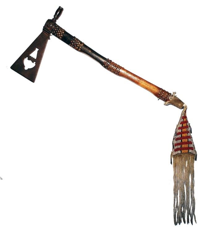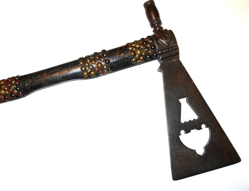 This is an excellent Cheyenne Native American Indian pipe tomahawk with rare “Double Batwing” cut outs in the blade and dates to circa 1880’s. The pipe tomahawk shows a heavy authentic hand-forged head with very scarce double “batwing” cutouts out of the center of the blade accented by the tall bowl with hand-filed rings, artful chevrons, detailed & hand-filed mouldings and a rear facing spur, truly an artist appeal. The forged head is married to a nice original solid wood haft handle which is adorned with a brass trade tack linear design accented by a Buffalo Indian tanned hide hand-cut fringe wrap at the smoking tip along with a Buffalo hide typical shaped drop. The drop is secured with the Buffalo gripping wrap and shows eight old tarnished rolled tin jingle cones along with a fantastic geometric fully beaded pattern in chalk white, greasy yellow, cobalt and red in a typical Cheyenne bar motif design. At the bottom of the drop is long hand cut Buffalo Indian tanned hide fringe and overall the drop measures 18” when hanging. Sewn with a sinew lacing. The gripping area has a section of the finish worn off with a nice deep patina from age and use. There are less than 30 known authentic double batwing / double cutout pipe tomahawks in any museums or private collections. These tomahawks rarely come up for public sale making them a very scarce and unique American Indian collectible. Cowan’s Auctions offered a Southern Plains Style Pipe Tomahawk with Inlay and Double-Cutout in their 4/5/2013 sale attributed to circa 1870 and sold for an astounding $42,000. A similar tomahawk is photographed in Hartzler and Knowles Indian Tomahawks and Frontiersmen Belt Axes (1991 figure 60). Other authentic examples have been offered by Manitou Galleries, Bonhams, Auction in Santa Fe, along with an example being showing in a publication by Gary Hendershott. Provenance: From the ex-collection of Tom Hardy from Sante Fe and Ohio. The tomahawk measures overall 24 inches in length with a 12 inch long head that has a 4 ¼ inch long blade.