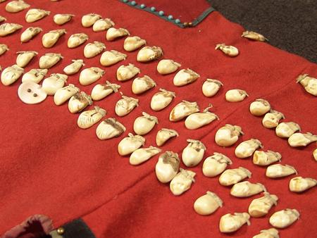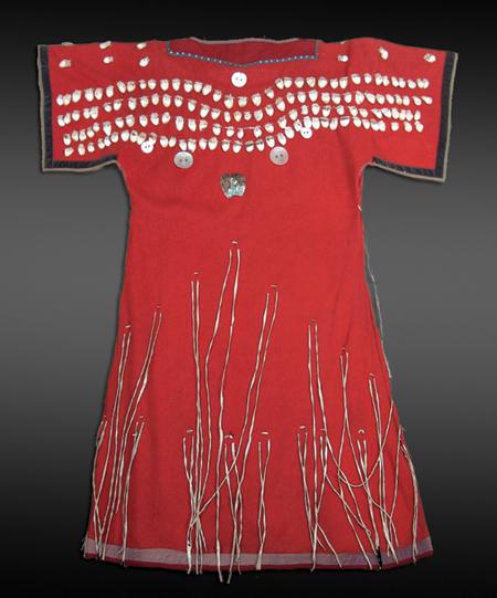 Beautiful classic red trade cloth dress with 320 real elk teeth on the front and back. With provenance. Purchased from Jim Fowler in 1979 for $2500 and is published in Period Gallery West Special Edition 1979, page 7. Appraisal value $3500. 40" x 22"