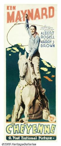 <B>Cheyenne (First National, 1929).</B></I> Insert (14" X 36"). Super cowboy Ken Maynard stars in this early Western feature. The insert has slight edge bumps and some creasing on the top right corner. The overall appearance of the piece is excellent. The colors are sharp and the paper still in wonderful condition. Very Fine.