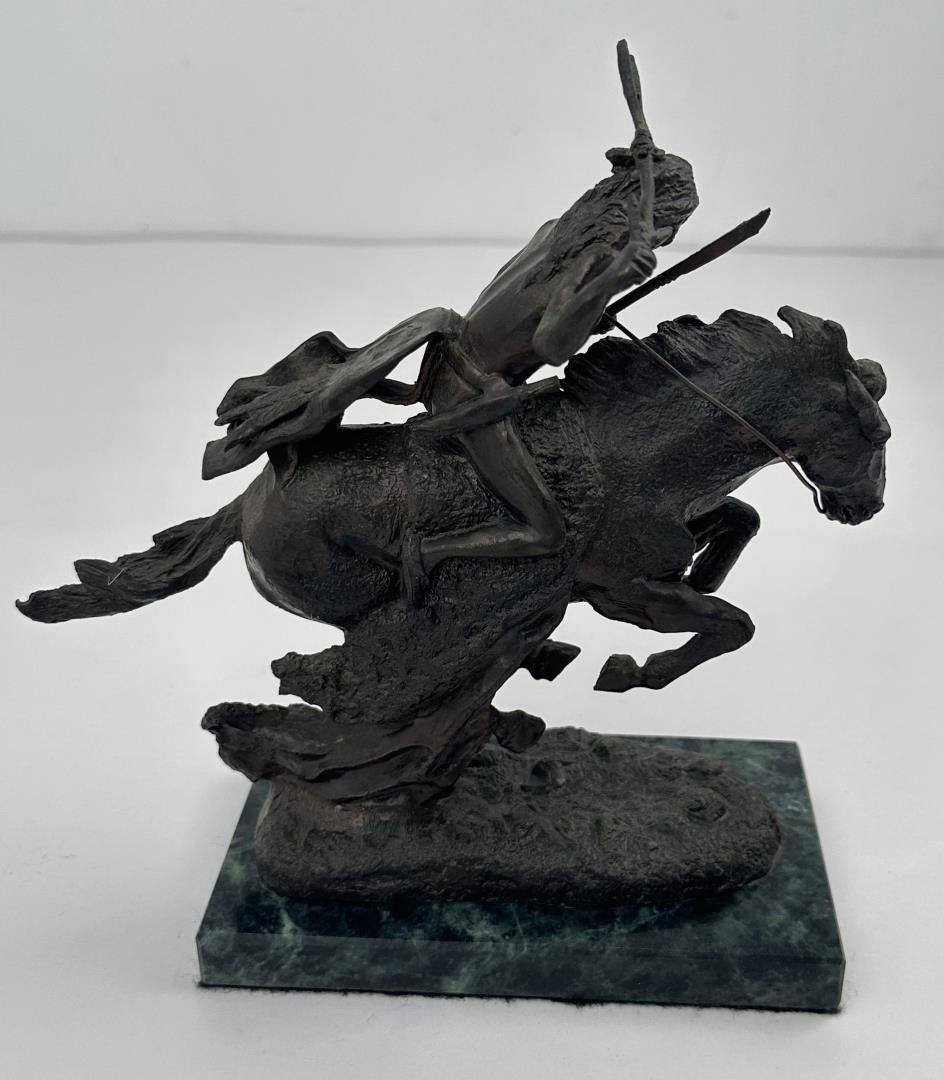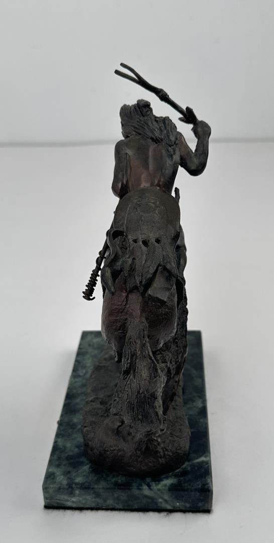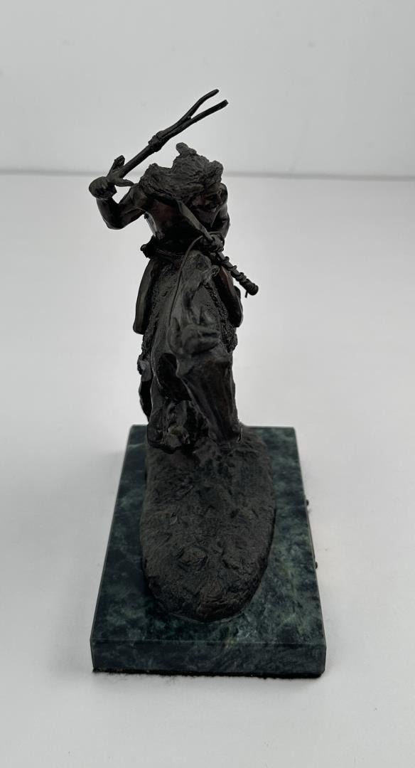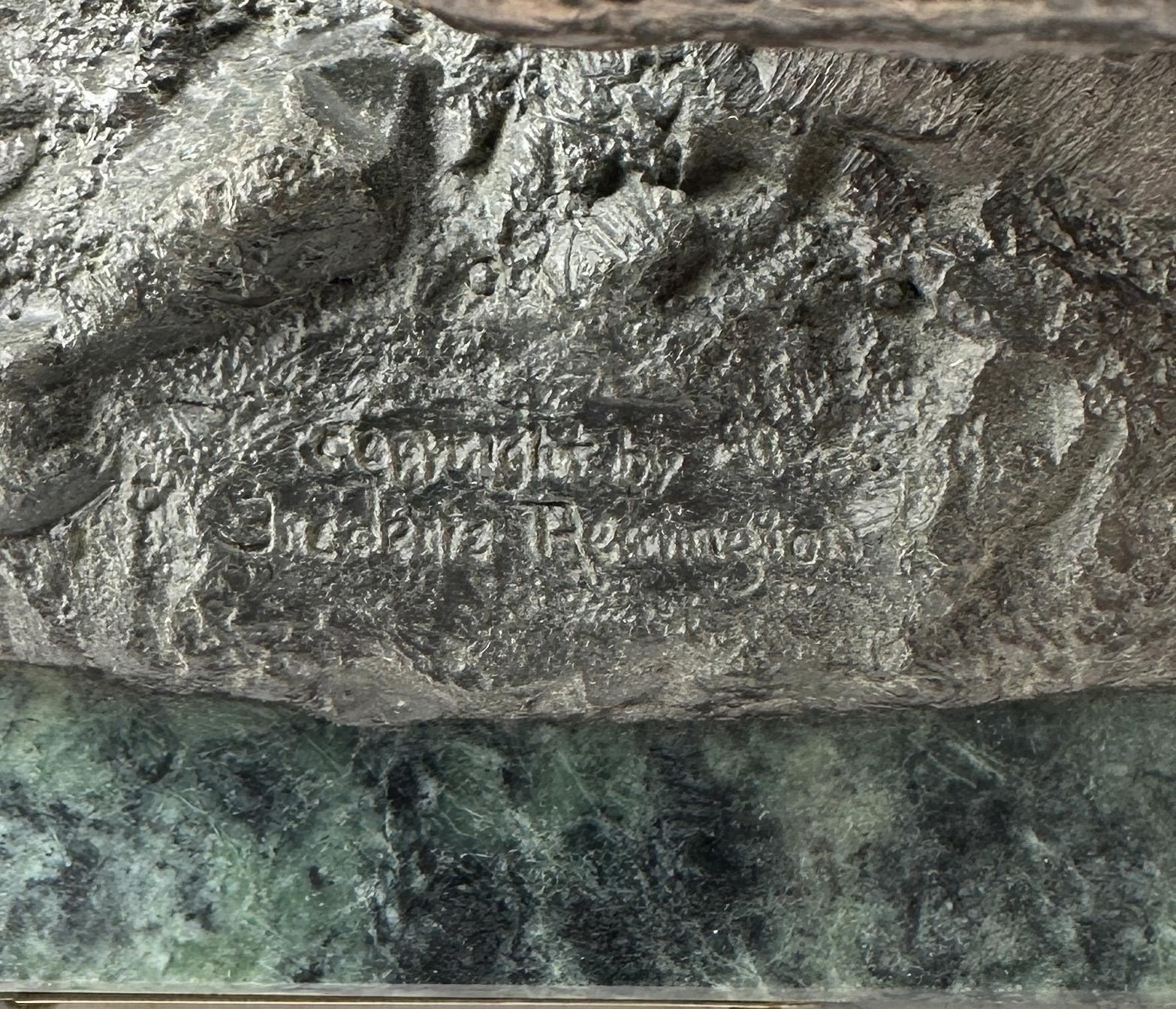 8 1/2" tall, 7 7/8" long. In his lifetime polymath Frederic Remington was the most successful and famous Western American artist. His immense talents included excelling as an illustrator, author, sculptor, and fine artist. His was a life tragically cut short. Born on October 4, 1861 in Canton, a small berg in bucolic upper state New York, he was much influenced by his father Seth Pierpont Remington, a Republican journalist who founded the St. Lawrence Plaindealer. His father had been a captain in the Civil War, and in 1870 President Ulysses S. Grant appointed him United States Collector of the Port of Ogdensburg, New York. In 1876 young Frederic enrolled at Highland Military Academy in Worcester, Massachusetts where he studied for the next two years. Two years later he enrolled at Yale for one year to study in the School of Fine Arts. His two loves were art and football. Only three months into school, he published his first illustration in the on-campus newspaper Yale Courant. On the gridiron he was a natural, demonstrating great strength and agility. Like Theodore Roosevelt, Remington also enjoyed boxing. A year later he met his future wife Eva Caten from Gloversville, New York. After the death of Remington’s father from tuberculosis on February 18, 1879, Eva rejected his first marriage proposal. Floundering, Remington headed to the American West to find himself—much like Theodore Roosevelt did when his mother and wife died on the same day. That led to a trip to Montana where he completed a number of sketches. Invigorated by his Western experiences, in February 1883 he headed to Kansas and with part of his inheritance bought a 160 acre sheep ranch near Peabody, Kansas. That failed adventure lasted about a year, and he then relocated to Kansas City, Missouri where Eva would join him as his wife. Yet he squandered the rest of his inheritance on a saloon there. After more illustrations were sold to Harper’s Weekly, in 1885 the Remingtons moved to New York City, and in 1886 he attended the Art Students League. By then Remington was earning $1,200 a year, twice the income of a school teacher. Other magazines such as St. Nicholas and Outing also published his art. His work certainly impressed a young Theodore Roosevelt who was chronicling his life in Medora—now in North Dakota—for a serial that ran in The Century Magazine. It was very common at the time for authors to serialize their works in magazines before they were published in book form. In the fall of 1887 Remington was commissioned to illustrate the magazine stories which ended up in Roosevelt’s 1888 classic book Ranch Life and the Hunting Trail. Early on, a lasting friendship between the two was cemented through these publications. By 1889 he had garnered national notoriety as one of the most accomplished illustrators in the country. He was a national celebrity. In 1889 his monumental canvas A Dash for the Timber was exhibited at the National Academy of Design. The New York Times reported, "The picture at the Autumn exhibition of the Academy of Design before which stands the largest number of people is Frederic Remington’s Dash for the Timber." A Silver medal for Last Lull in the Fight followed at the Exposition Universelle in Paris. In 1891 the National Academy of Design elected Remington as an Associate member. Yet he was never admitted as National Academician, despite support from fellow artists Gilbert Gaul, Childe Hassam, and others. His financial success allowed the Remingtons to move into a grand home he named Ednion Algonquin for "a place where I live in New Rochelle, New York. A young Norman Rockwell would someday paint in his studio. Through his travels, Remington embraced social Darwinism survival of the fittest that championed the U.S. military’s domination of the inferior Native Americans. Theodore Roosevelt, George Armstrong Custer, and Remington along with most other Americans—idolized Charles Darwin. As early as 1888 Remington started contributing short stories along with illustrations to magazines. His writings teemed with romantic Western stories chalk full of drama and violence. Initially, they presented the cavalryman as the hero and the Indian as the villain, especially when the Indian had been tainted with the vices of the white man. His West was the "frontier model where the fittest were rugged individuals from northern Europe and white Americans. Even though he was an accomplished author and painter, perhaps his greatest talent was as a sculptor. His bronzes are more famous and collectible than any other Western American artist. And yet his bronze repertoire was completed in just fourteen years. Starting in order of modeling, they are: The Broncho Buster, The Wounded Bunkie, The Wicked Pony, The Scalp, The Norther, The Cheyenne, The Buffalo Signal, Coming Through the Rye, The Mountain Man, The Sergeant, Paleolithic Man, Savage, Polo, The Rattlesnake, Dragoons 1850, The Outlaw, The Horse Thief, The Buffalo Horse, The Cowboy, Trooper of the Plains 1868, The Broncho Buster (large), and The Stampede. His Coming Through the Rye was widely viewed by the public at two world’s fairs. A New Jersey artisan in 1904 was commissioned by Remington to produce a heroic size plaster of the sculpture for the 1904 Louisiana Purchase Exposition in St. Louis, Missouri (called Off the Trail). It was then shipped to Portland, Oregon the next year for the Lewis and Clark Exposition and titled Shooting Up the Town. The Cowboy—his only monumental bronze—was commissioned in 1905 by the Fairmount Park Art Association in Philadelphia. The twelve feet high bronze was shipped to Philadelphia in May 1908 and unveiled in the park as The Mounted Cowboy. In 1900 Remington turned to Riccardo Bertelli at Roman Bronze Works in Brooklyn to cast his bronzes by the lost-wax casting process which allowed higher detail in the finished product. The Norther that year was his first bronze by this method. The Cheyenne was copyrighted