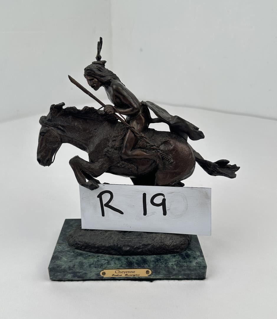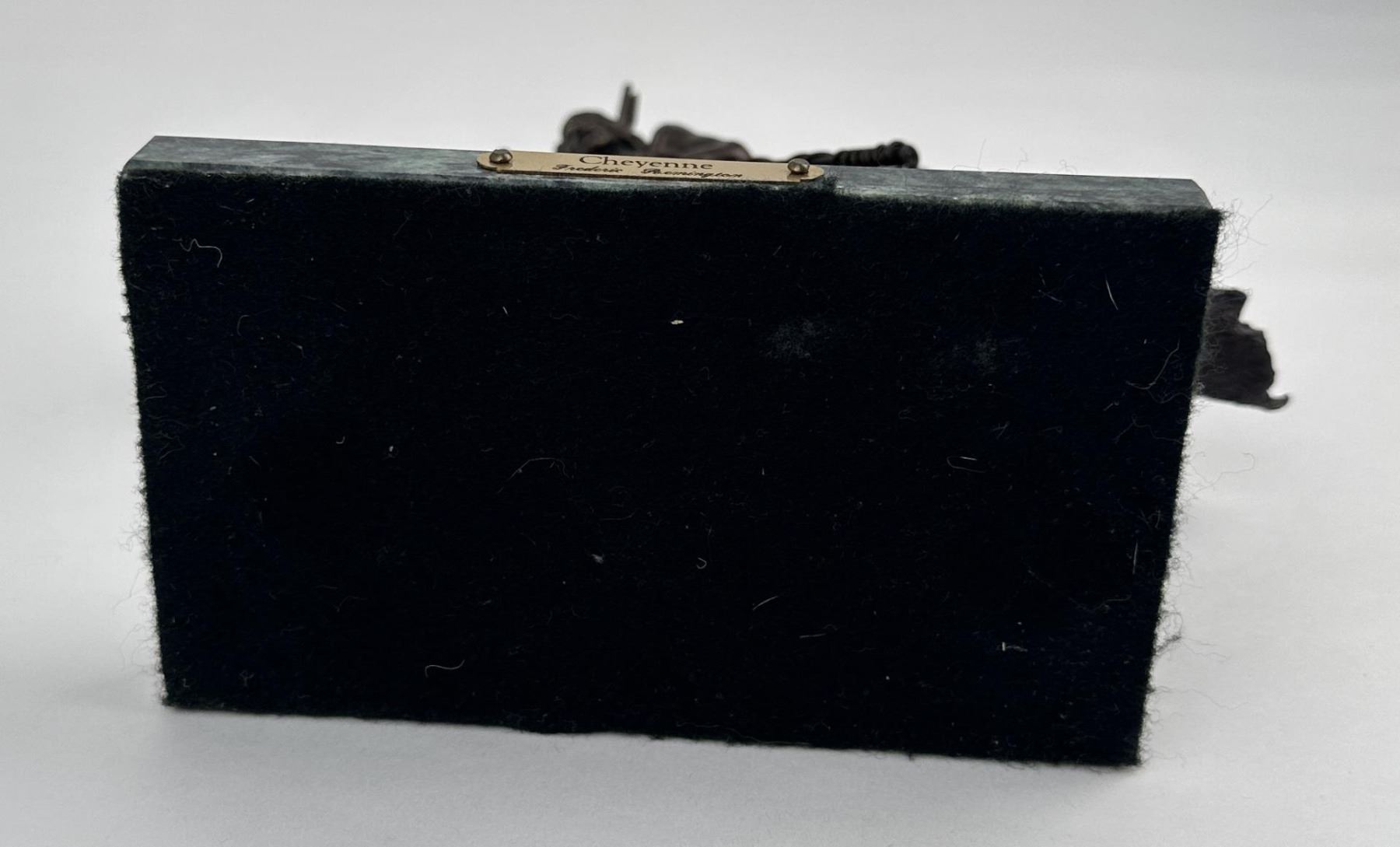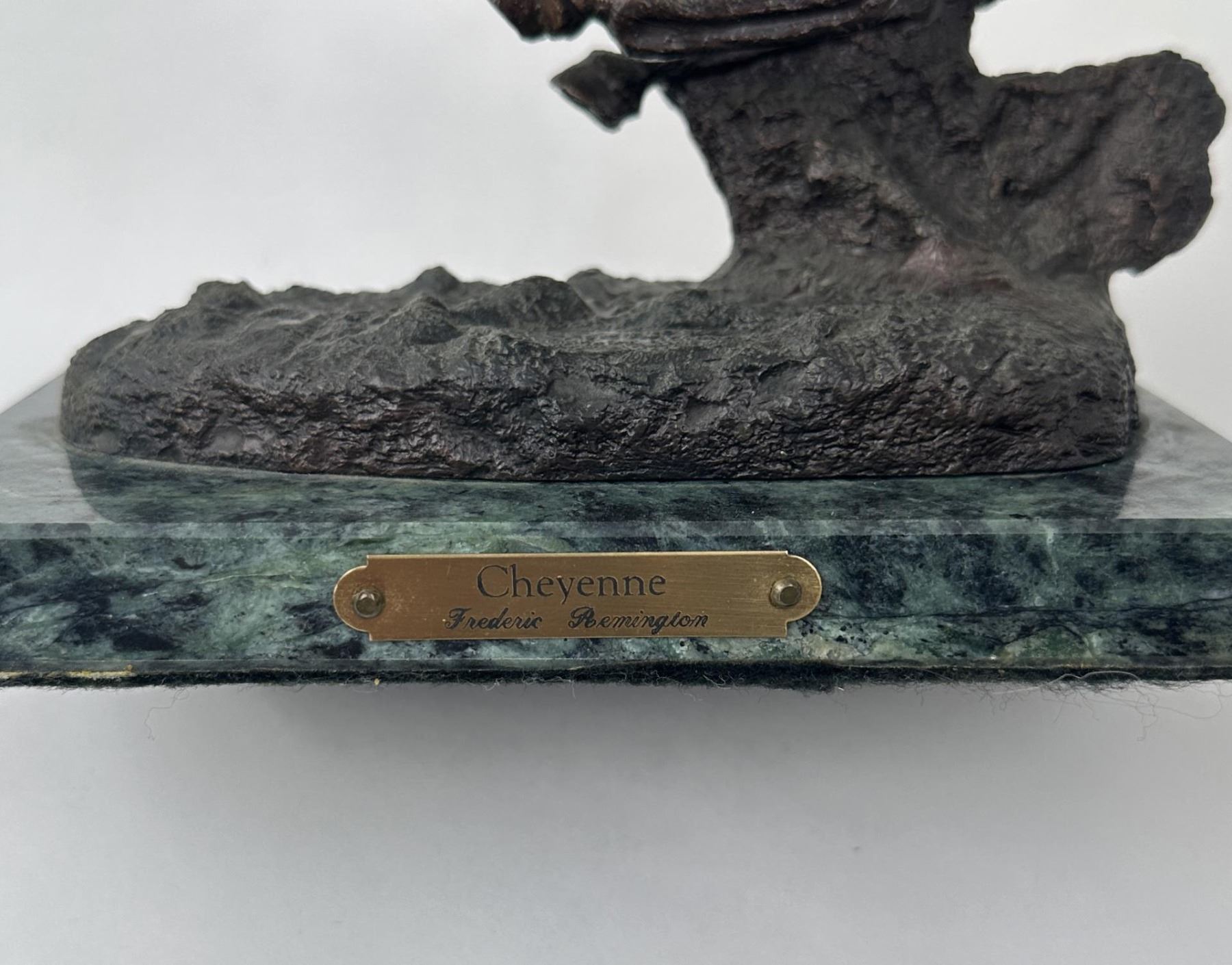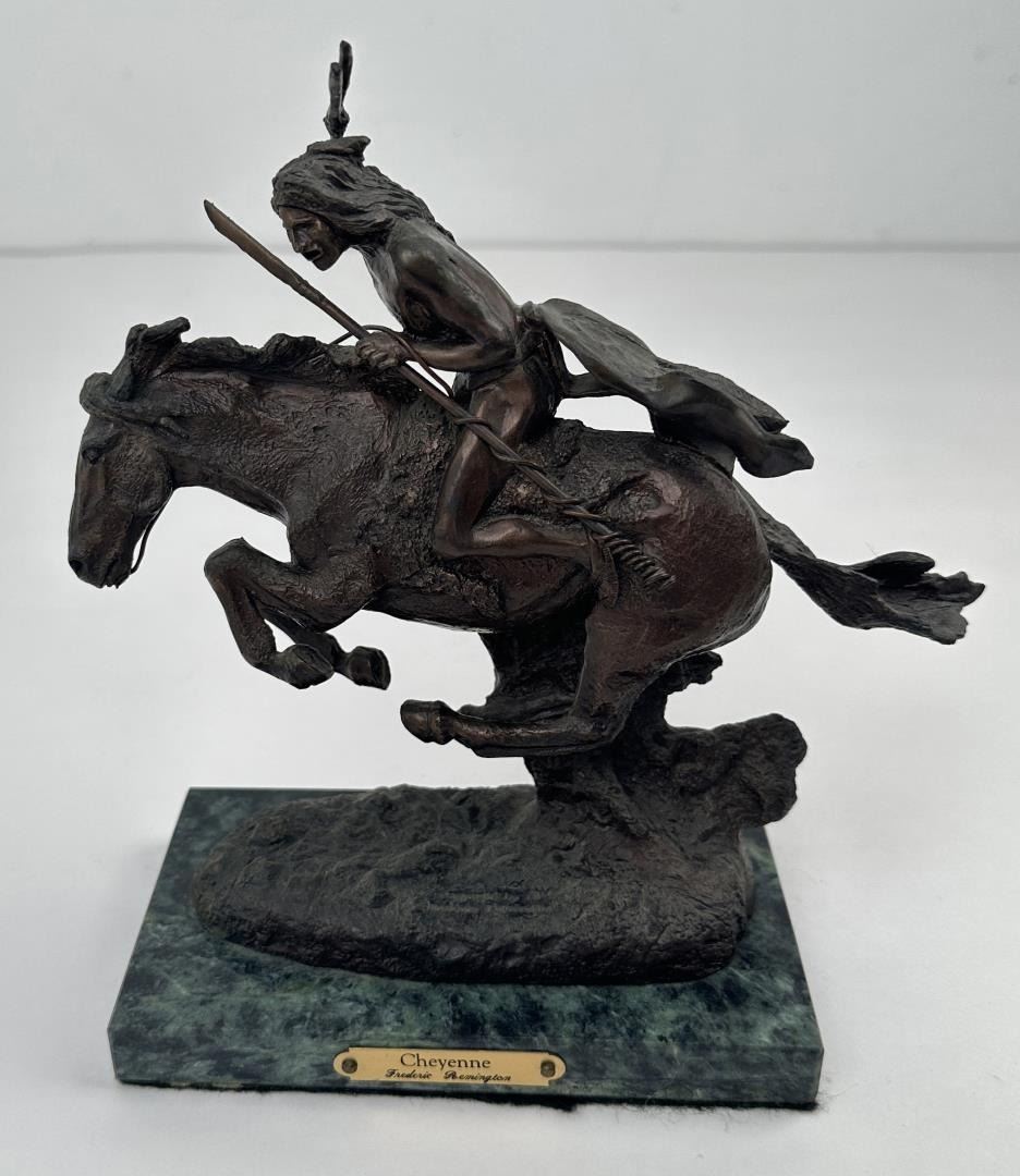 8 1/2" tall, 7 7/8" long. In his lifetime polymath Frederic Remington was the most successful and famous Western American artist. His immense talents included excelling as an illustrator, author, sculptor, and fine artist. His was a life tragically cut short. Born on October 4, 1861 in Canton, a small berg in bucolic upper state New York, he was much influenced by his father Seth Pierpont Remington, a Republican journalist who founded the St. Lawrence Plaindealer. His father had been a captain in the Civil War, and in 1870 President Ulysses S. Grant appointed him United States Collector of the Port of Ogdensburg, New York. In 1876 young Frederic enrolled at Highland Military Academy in Worcester, Massachusetts where he studied for the next two years. Two years later he enrolled at Yale for one year to study in the School of Fine Arts. His two loves were art and football. Only three months into school, he published his first illustration in the on-campus newspaper Yale Courant. On the gridiron he was a natural, demonstrating great strength and agility. Like Theodore Roosevelt, Remington also enjoyed boxing. A year later he met his future wife Eva Caten from Gloversville, New York. After the death of Remington’s father from tuberculosis on February 18, 1879, Eva rejected his first marriage proposal. Floundering, Remington headed to the American West to find himself—much like Theodore Roosevelt did when his mother and wife died on the same day. That led to a trip to Montana where he completed a number of sketches. Invigorated by his Western experiences, in February 1883 he headed to Kansas and with part of his inheritance bought a 160 acre sheep ranch near Peabody, Kansas. That failed adventure lasted about a year, and he then relocated to Kansas City, Missouri where Eva would join him as his wife. Yet he squandered the rest of his inheritance on a saloon there. After more illustrations were sold to Harper’s Weekly, in 1885 the Remingtons moved to New York City, and in 1886 he attended the Art Students League. By then Remington was earning $1,200 a year, twice the income of a school teacher. Other magazines such as St. Nicholas and Outing also published his art. His work certainly impressed a young Theodore Roosevelt who was chronicling his life in Medora—now in North Dakota—for a serial that ran in The Century Magazine. It was very common at the time for authors to serialize their works in magazines before they were published in book form. In the fall of 1887 Remington was commissioned to illustrate the magazine stories which ended up in Roosevelt’s 1888 classic book Ranch Life and the Hunting Trail. Early on, a lasting friendship between the two was cemented through these publications. By 1889 he had garnered national notoriety as one of the most accomplished illustrators in the country. He was a national celebrity. In 1889 his monumental canvas A Dash for the Timber was exhibited at the National Academy of Design. The New York Times reported, "The picture at the Autumn exhibition of the Academy of Design before which stands the largest number of people is Frederic Remington’s Dash for the Timber." A Silver medal for Last Lull in the Fight followed at the Exposition Universelle in Paris. In 1891 the National Academy of Design elected Remington as an Associate member. Yet he was never admitted as National Academician, despite support from fellow artists Gilbert Gaul, Childe Hassam, and others. His financial success allowed the Remingtons to move into a grand home he named Ednion Algonquin for "a place where I live in New Rochelle, New York. A young Norman Rockwell would someday paint in his studio. Through his travels, Remington embraced social Darwinism survival of the fittest that championed the U.S. military’s domination of the inferior Native Americans. Theodore Roosevelt, George Armstrong Custer, and Remington along with most other Americans—idolized Charles Darwin. As early as 1888 Remington started contributing short stories along with illustrations to magazines. His writings teemed with romantic Western stories chalk full of drama and violence. Initially, they presented the cavalryman as the hero and the Indian as the villain, especially when the Indian had been tainted with the vices of the white man. His West was the "frontier model where the fittest were rugged individuals from northern Europe and white Americans. Even though he was an accomplished author and painter, perhaps his greatest talent was as a sculptor. His bronzes are more famous and collectible than any other Western American artist. And yet his bronze repertoire was completed in just fourteen years. Starting in order of modeling, they are: The Broncho Buster, The Wounded Bunkie, The Wicked Pony, The Scalp, The Norther, The Cheyenne, The Buffalo Signal, Coming Through the Rye, The Mountain Man, The Sergeant, Paleolithic Man, Savage, Polo, The Rattlesnake, Dragoons 1850, The Outlaw, The Horse Thief, The Buffalo Horse, The Cowboy, Trooper of the Plains 1868, The Broncho Buster (large), and The Stampede. His Coming Through the Rye was widely viewed by the public at two world’s fairs. A New Jersey artisan in 1904 was commissioned by Remington to produce a heroic size plaster of the sculpture for the 1904 Louisiana Purchase Exposition in St. Louis, Missouri (called Off the Trail). It was then shipped to Portland, Oregon the next year for the Lewis and Clark Exposition and titled Shooting Up the Town. The Cowboy—his only monumental bronze—was commissioned in 1905 by the Fairmount Park Art Association in Philadelphia. The twelve feet high bronze was shipped to Philadelphia in May 1908 and unveiled in the park as The Mounted Cowboy. In 1900 Remington turned to Riccardo Bertelli at Roman Bronze Works in Brooklyn to cast his bronzes by the lost-wax casting process which allowed higher detail in the finished product. The Norther that year was his first bronze by this method. The Cheyenne was copyrighted