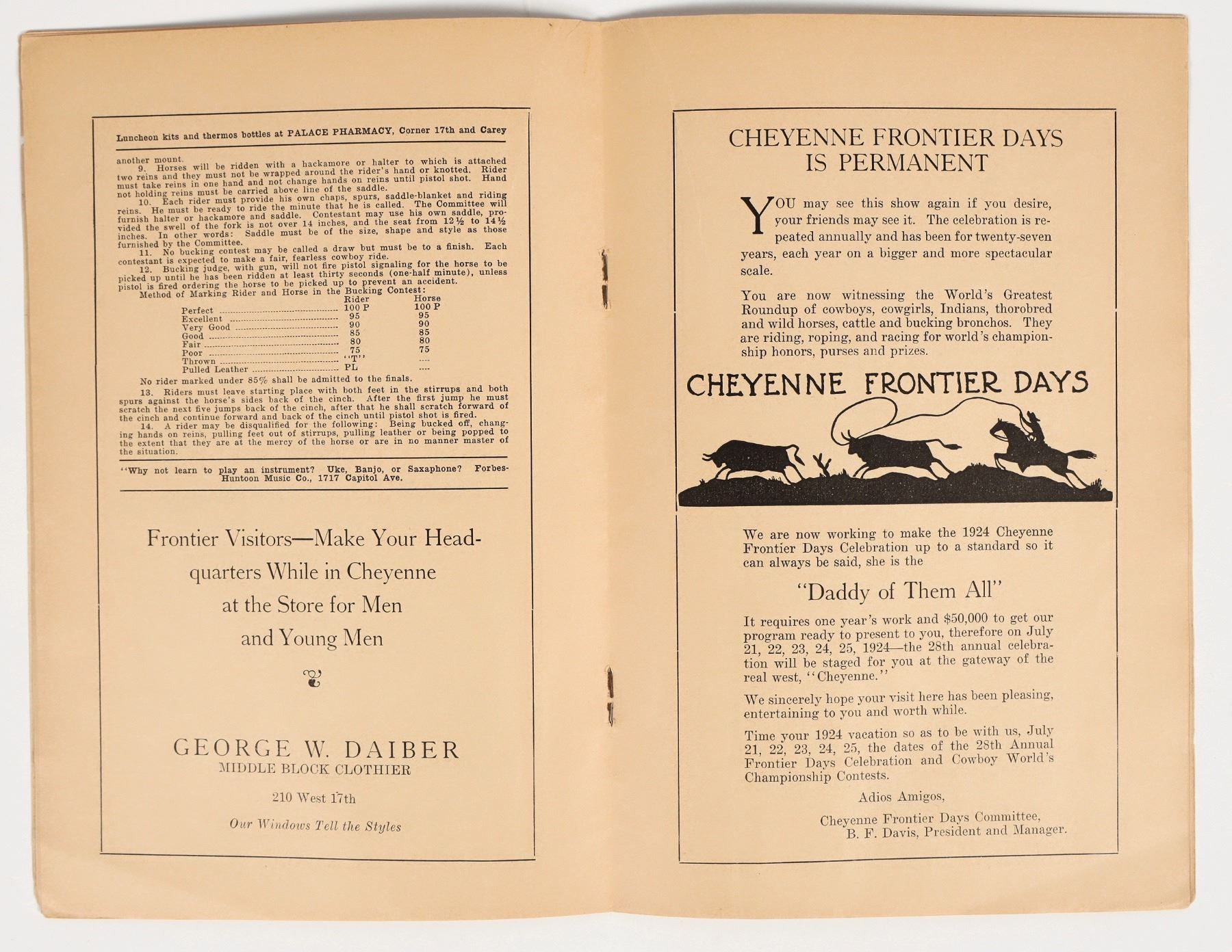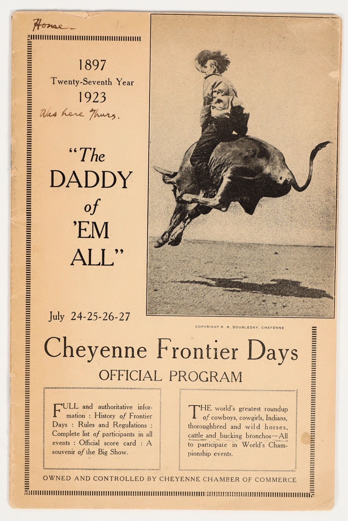 An official program booklet for the 1923 "Cheyenne Frontier Days" celebration of Cheyenne, Wyoming. Includes a schedule for various rodeo events as well as numerous ads. Fine condition, some toning; see photos. 6"x9".