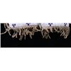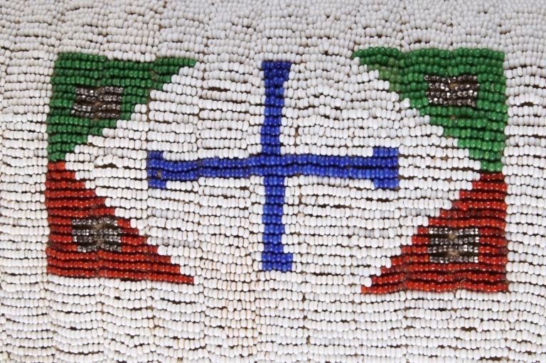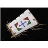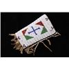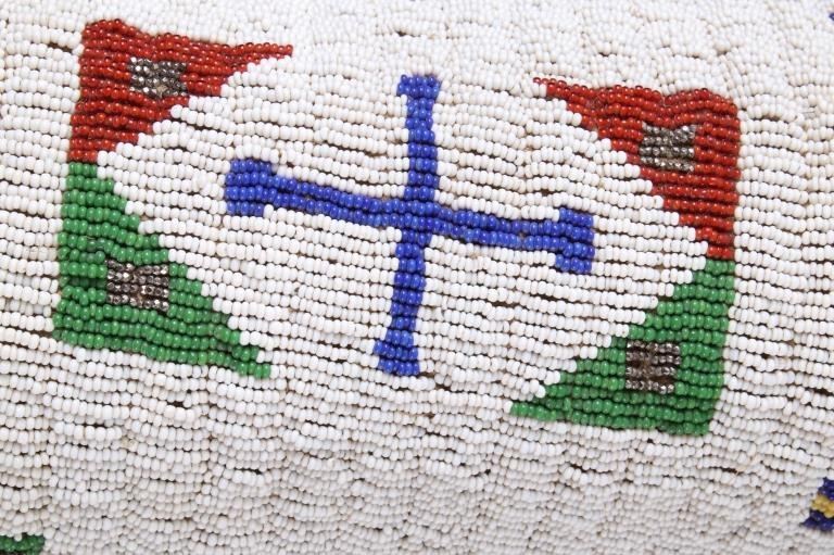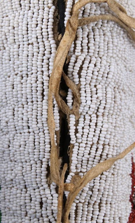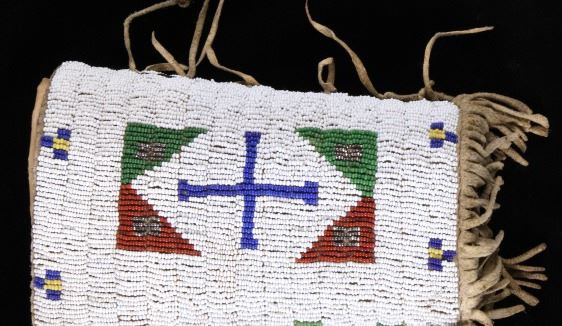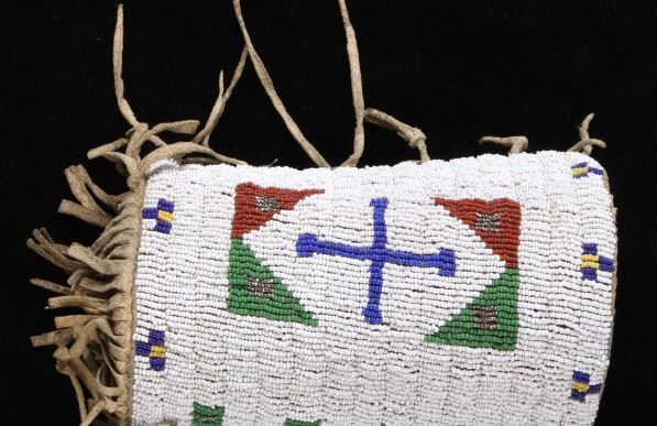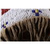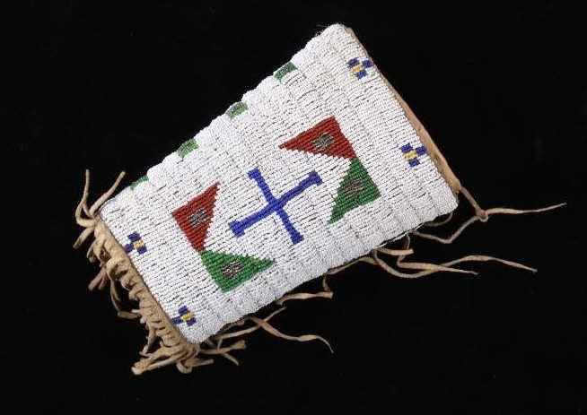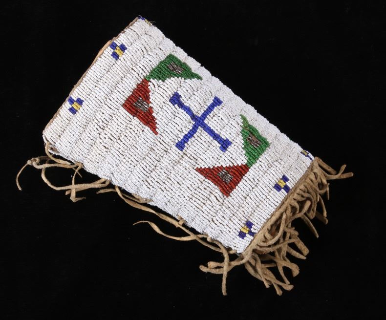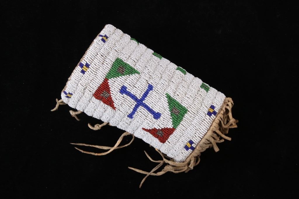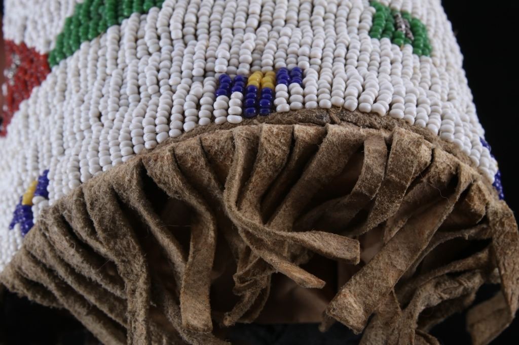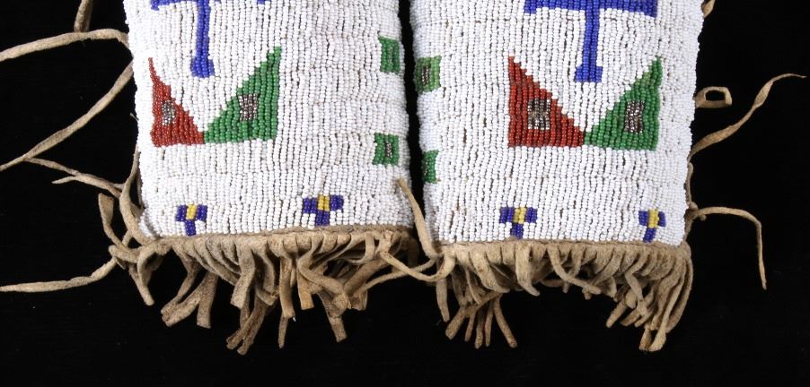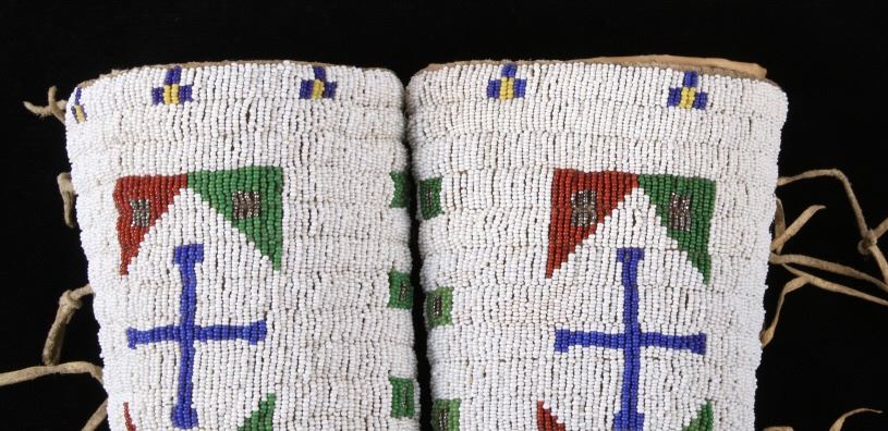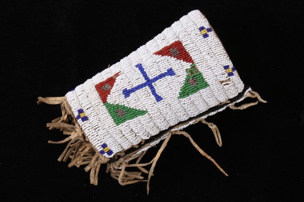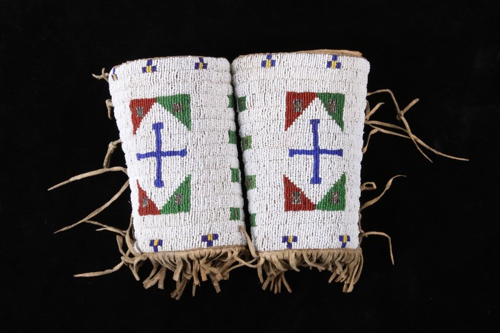 The lot features an outstanding set of Cheyenne Native American Indian fully beaded cuffs / arm bands dating to the 19th Century. The 1800's beaded arm cuff gauntlet set shows an Indian tanned Bison Great American Buffalo hide construction that is lined with a dark trade clothe calico and is covered in period correct 1800’s glass trade seed beads in a traditional geometric pattern. The beadwork shows a chalk white background with geometric pattern in red white hearts, royal blue, medium-green, greasy yellow, and rare petit faceted metal beads. Each cuff shows hand cut Buffalo fringe at the base and the original Indian tanned hide tie straps, a rare and wonderful addition. Provenance: The set is from the Denver Art Museum where they were purchased from the Denver Art Museum deaccession sale from the current collection of American Indian pieces out of Minden, Nevada. The set has been wonderfully museum quality preserved showing fine condition with little to no bead loss and is finely sinew sewn. Each cuff measures 6”W with additional 4”L ties by 7”L with an additional 2”L fringe.