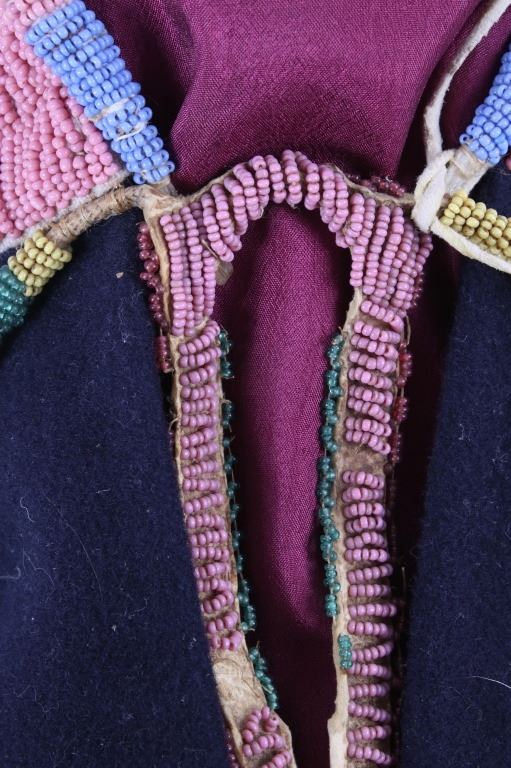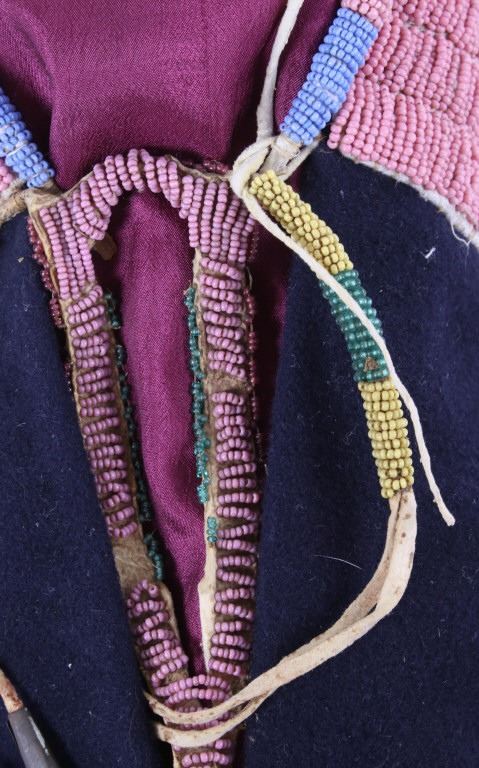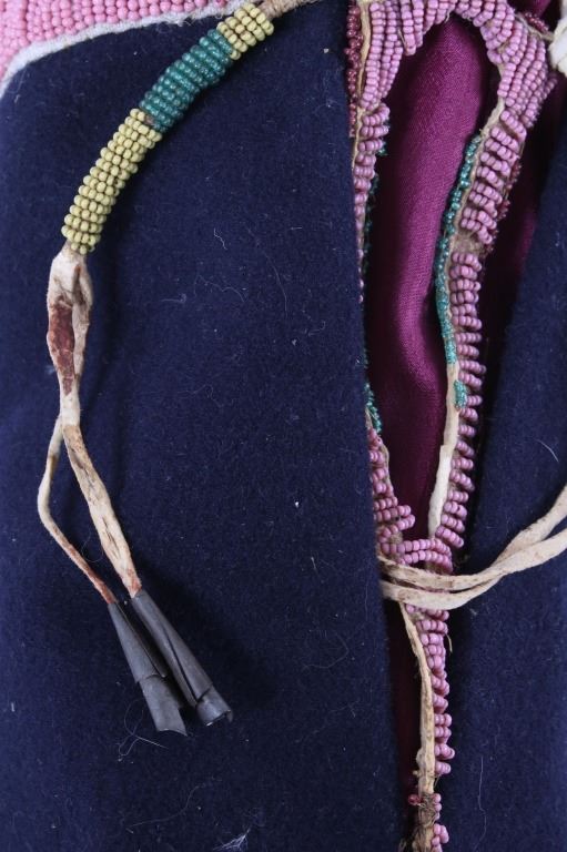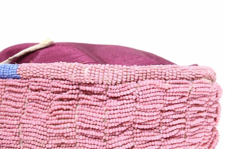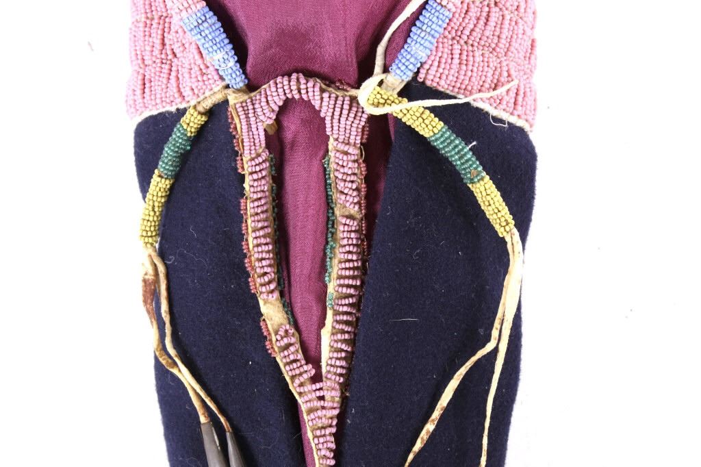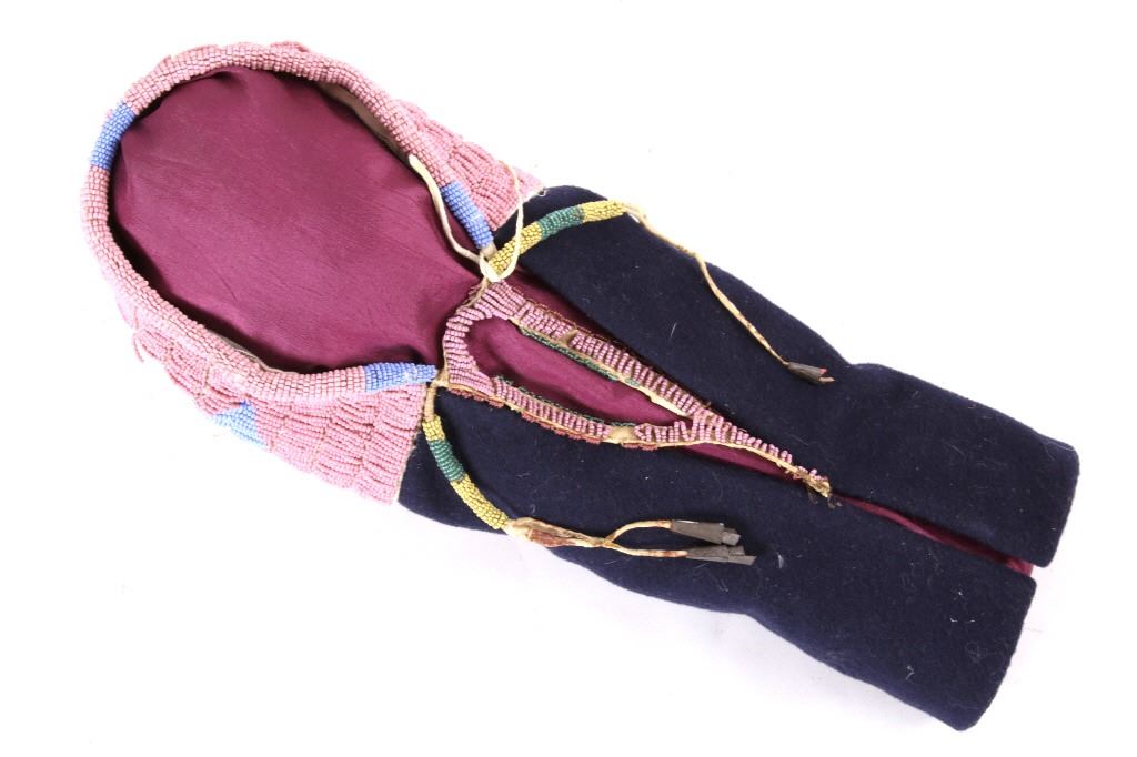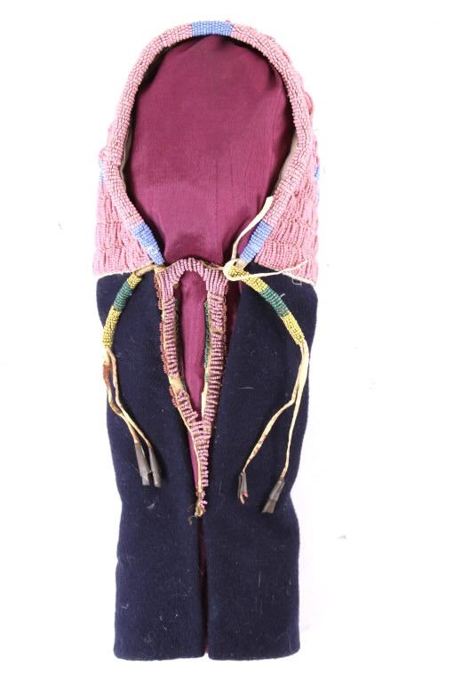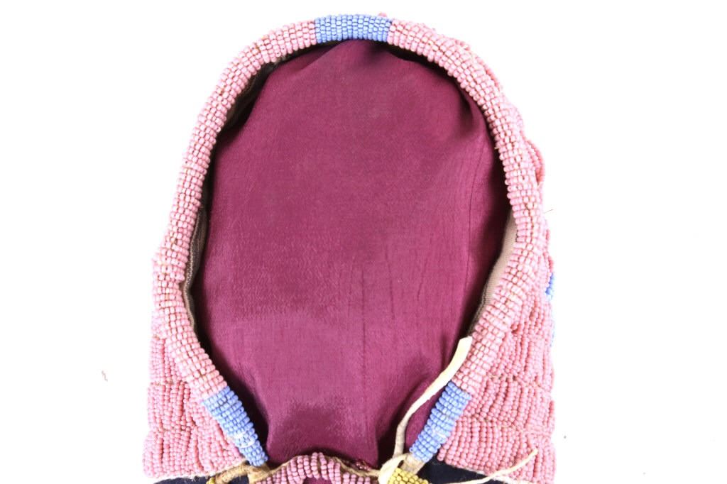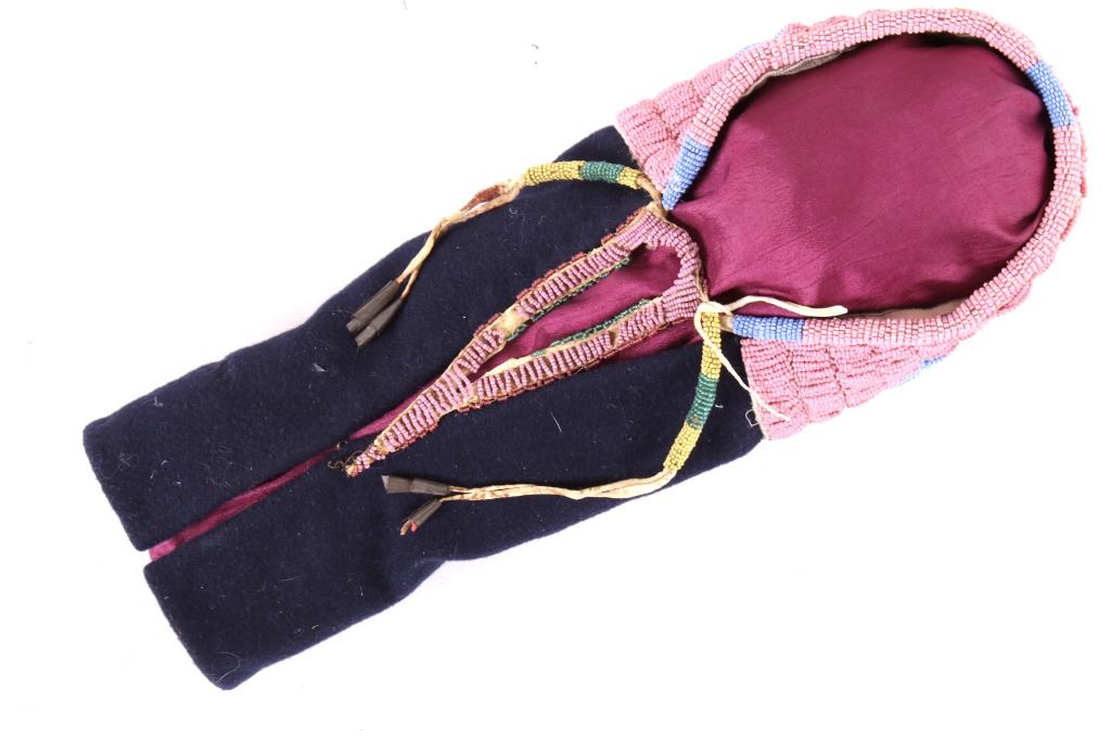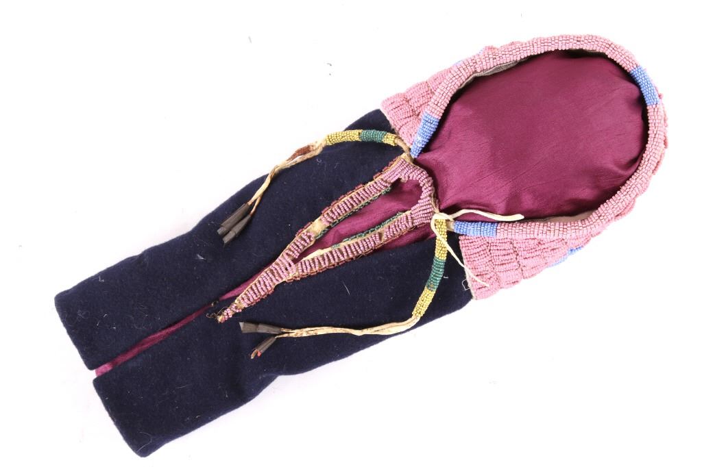 This is an excellent fully beaded papoose cradleboard cover from the Cheyenne Native American Indians and dating to the 19th Century. The 1800's piece shows a trade clothe wool blanket base and striped calico trade clothe construction that is fully covered on the top in 1800’s period correct glass trade seed beads in a traditional geometric pattern. The beadwork shows a Cheyenne pink background with rope fancy beaded edge and blue diamond patterns. The front has a wonderful bifurcated tongue fringe down the center which is also accented by long rope beaded side fringe all having a trade of red ocher mineral pigment dye. The fringe is beaded with Cheyenne pink, greasy yellow, semi-transparent green and a fancy edge of rose and green. The end of the fringe shows four rolled tin period correct jingle cones. The piece shows a combination of sinew and trade thread sewn construction and overall is very well preserved with little bead loss. This is truly a well museum quality craftsmanship. Provenance: From a large American Indian collection in Minden, Nevada. The piece measures overall 15.25”L x 7”W x 4.5”H.