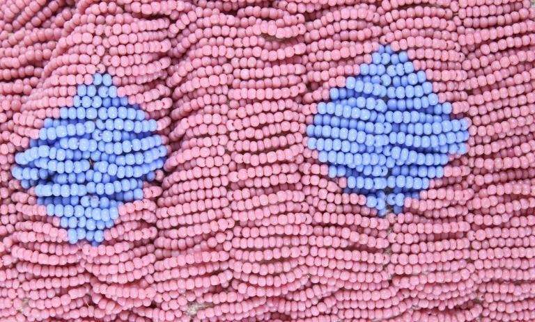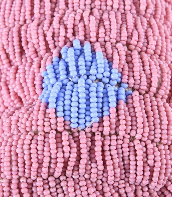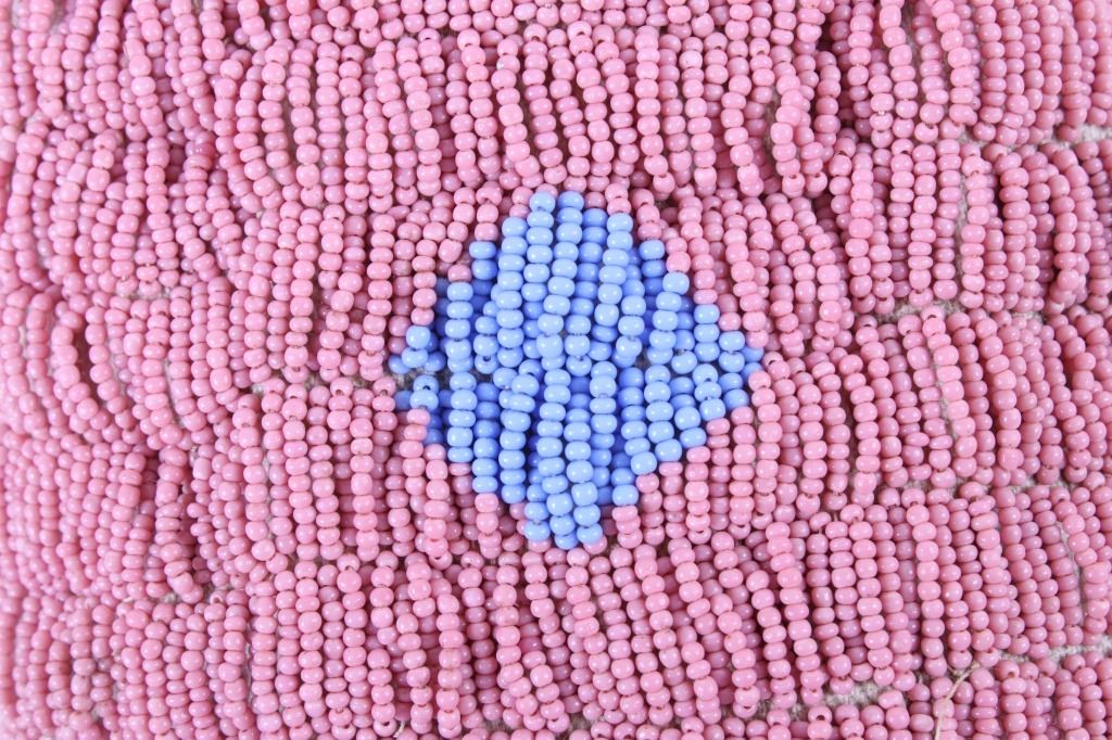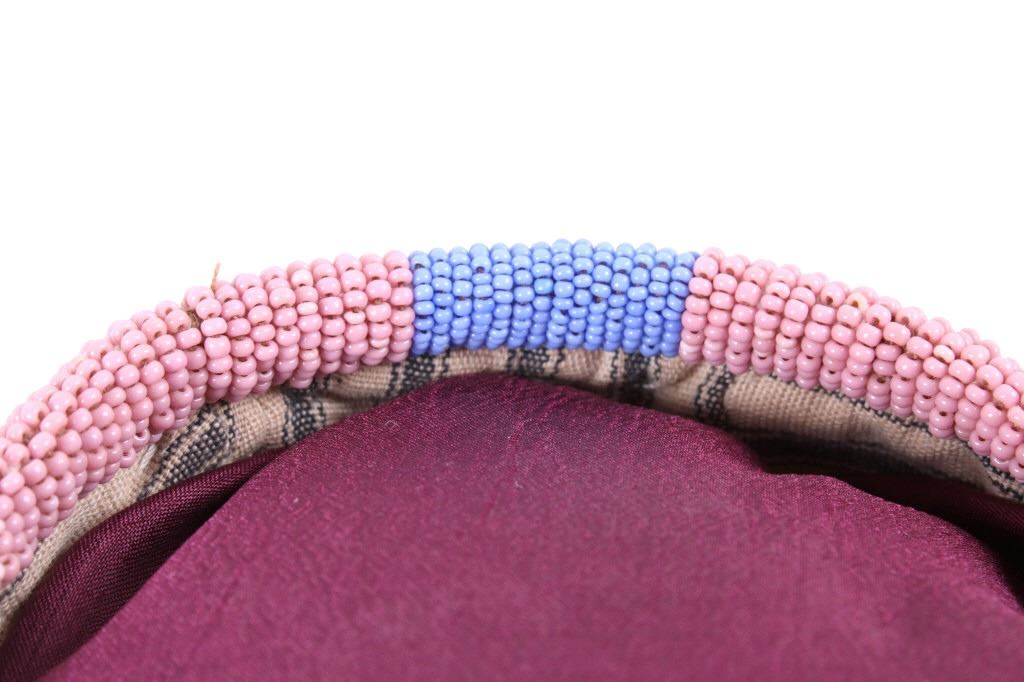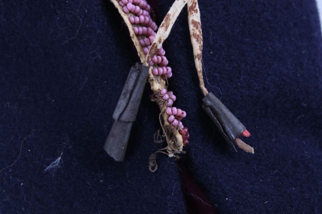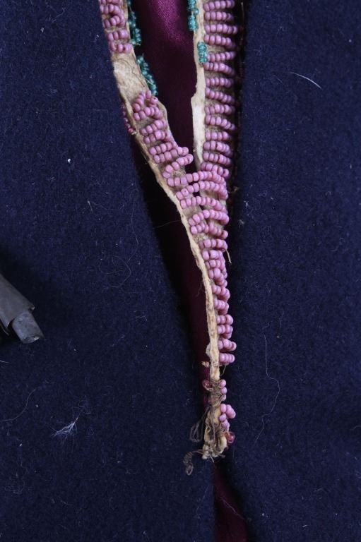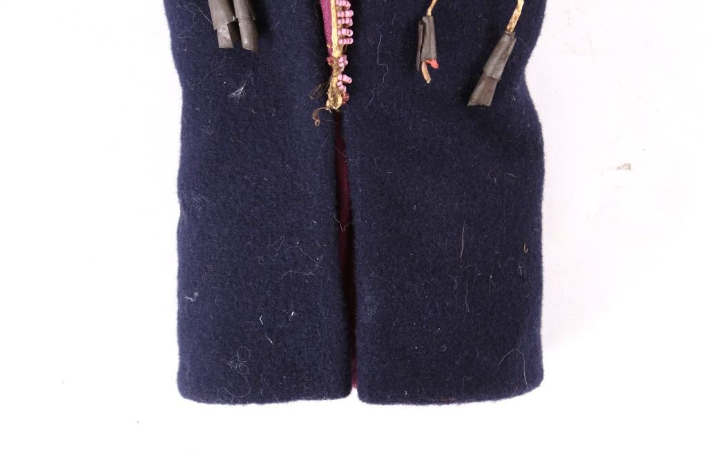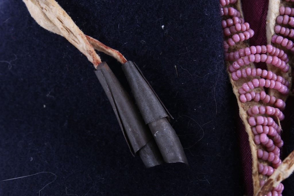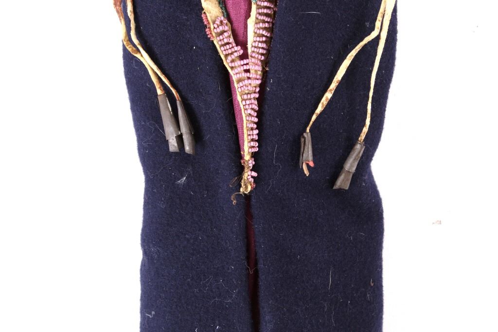 This is an excellent fully beaded papoose cradleboard cover from the Cheyenne Native American Indians and dating to the 19th Century. The 1800's piece shows a trade clothe wool blanket base and striped calico trade clothe construction that is fully covered on the top in 1800’s period correct glass trade seed beads in a traditional geometric pattern. The beadwork shows a Cheyenne pink background with rope fancy beaded edge and blue diamond patterns. The front has a wonderful bifurcated tongue fringe down the center which is also accented by long rope beaded side fringe all having a trade of red ocher mineral pigment dye. The fringe is beaded with Cheyenne pink, greasy yellow, semi-transparent green and a fancy edge of rose and green. The end of the fringe shows four rolled tin period correct jingle cones. The piece shows a combination of sinew and trade thread sewn construction and overall is very well preserved with little bead loss. This is truly a well museum quality craftsmanship. Provenance: From a large American Indian collection in Minden, Nevada. The piece measures overall 15.25”L x 7”W x 4.5”H.