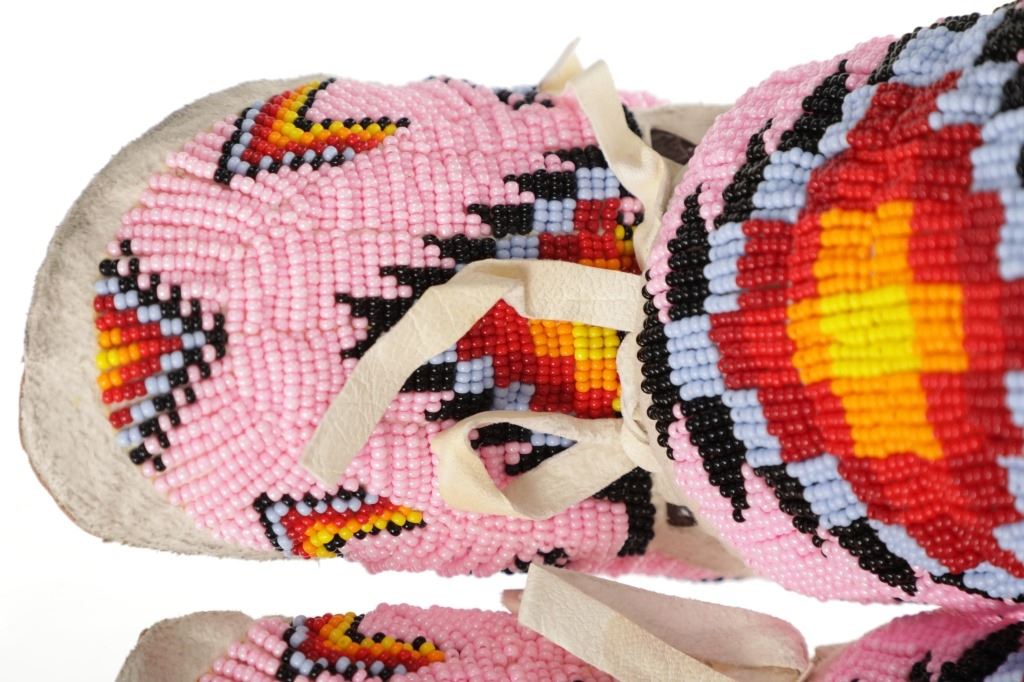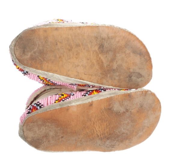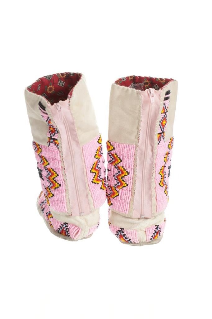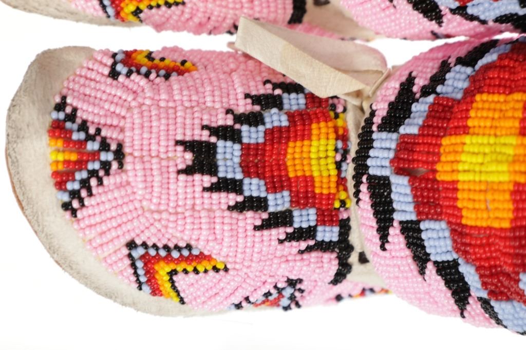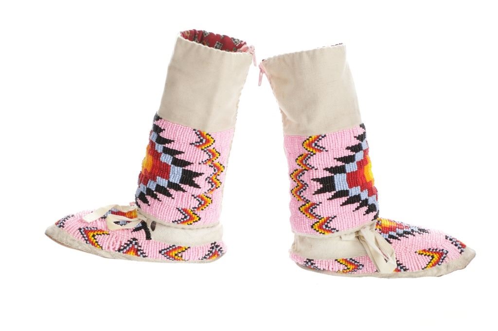 Featured in this lot is this Cheyenne beaded high top moccasins circa late 20th century. The moccasins feature a wonderfully and professionally crafted tanned hide and trade cloth construction that feature beautifully beaded tops and side walling of the moccasins and on the tops of the sleeves. The sleeves feature glass trade seed beads with colors such as: Cheyenne pink, black, light blue, maroon or purple, medium red, orange, and yellow. The moccasins feature thicker leather soles with wear marks on the bottom; and the sleeves shows a pink zipper. The condition of this pair of moccasins is good with no obvious signs of damage and in good overall condition. The moccasins are signed in red on the inside of the thick harder sole "Cheyenne". The measurements of these high top moccasins are 6 1/2" x 3 1/2" and the sleeves measure 6 1/2" x 4 1/2".