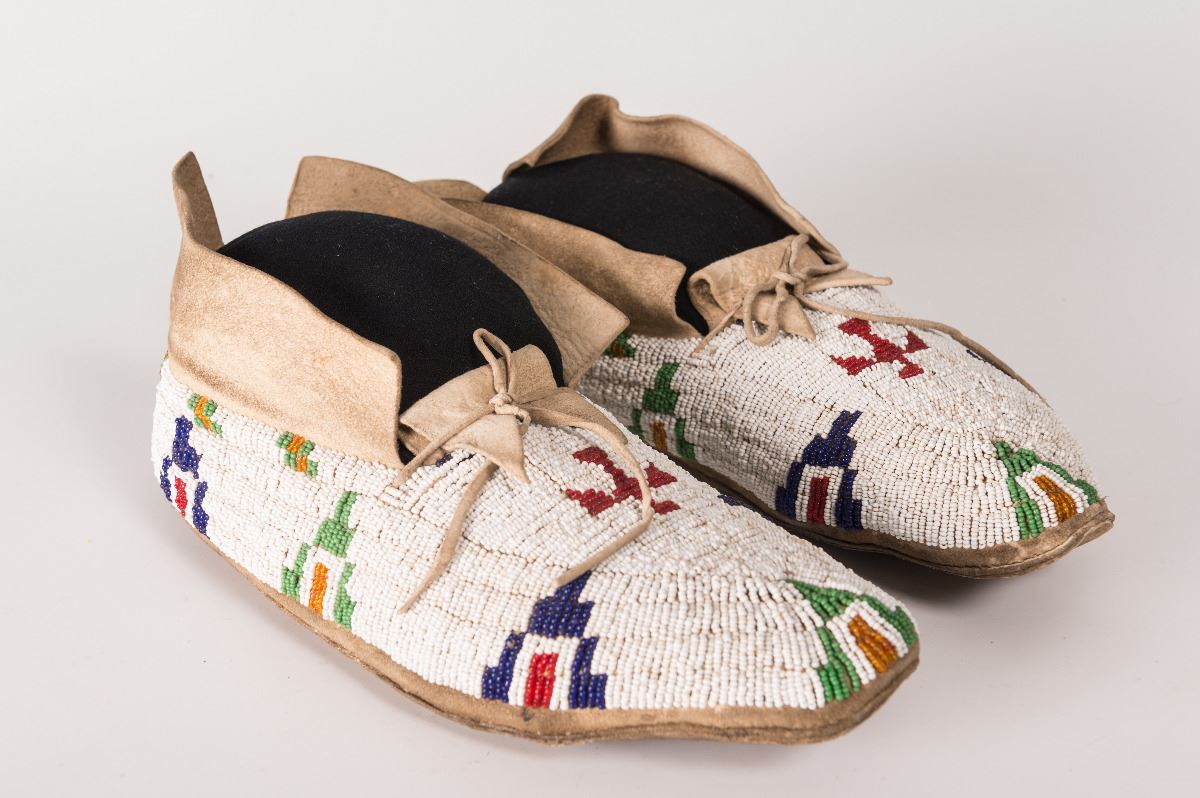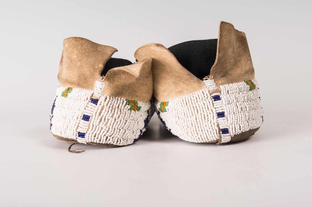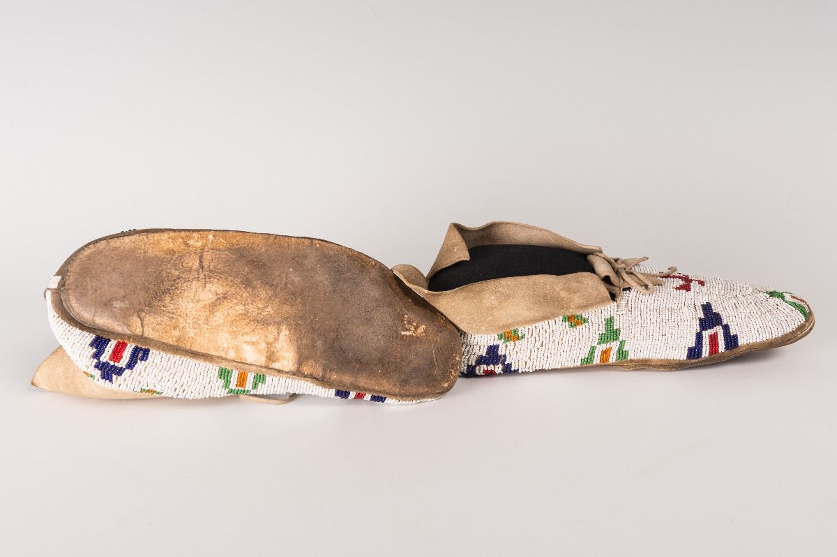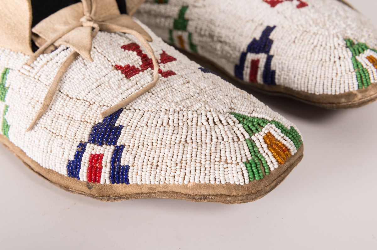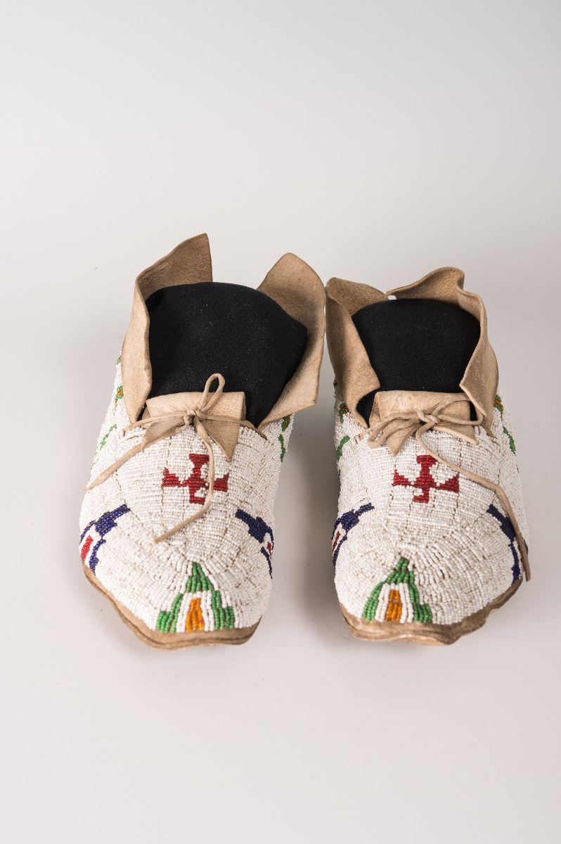 Cheyenne Fully Beaded Man's Moccasins. 10 ½" long with beaded eagle design on vamp, along with geometric designs all on a white background. Late 19th century.