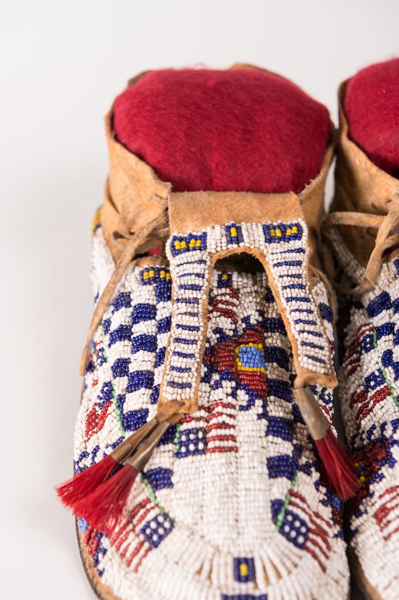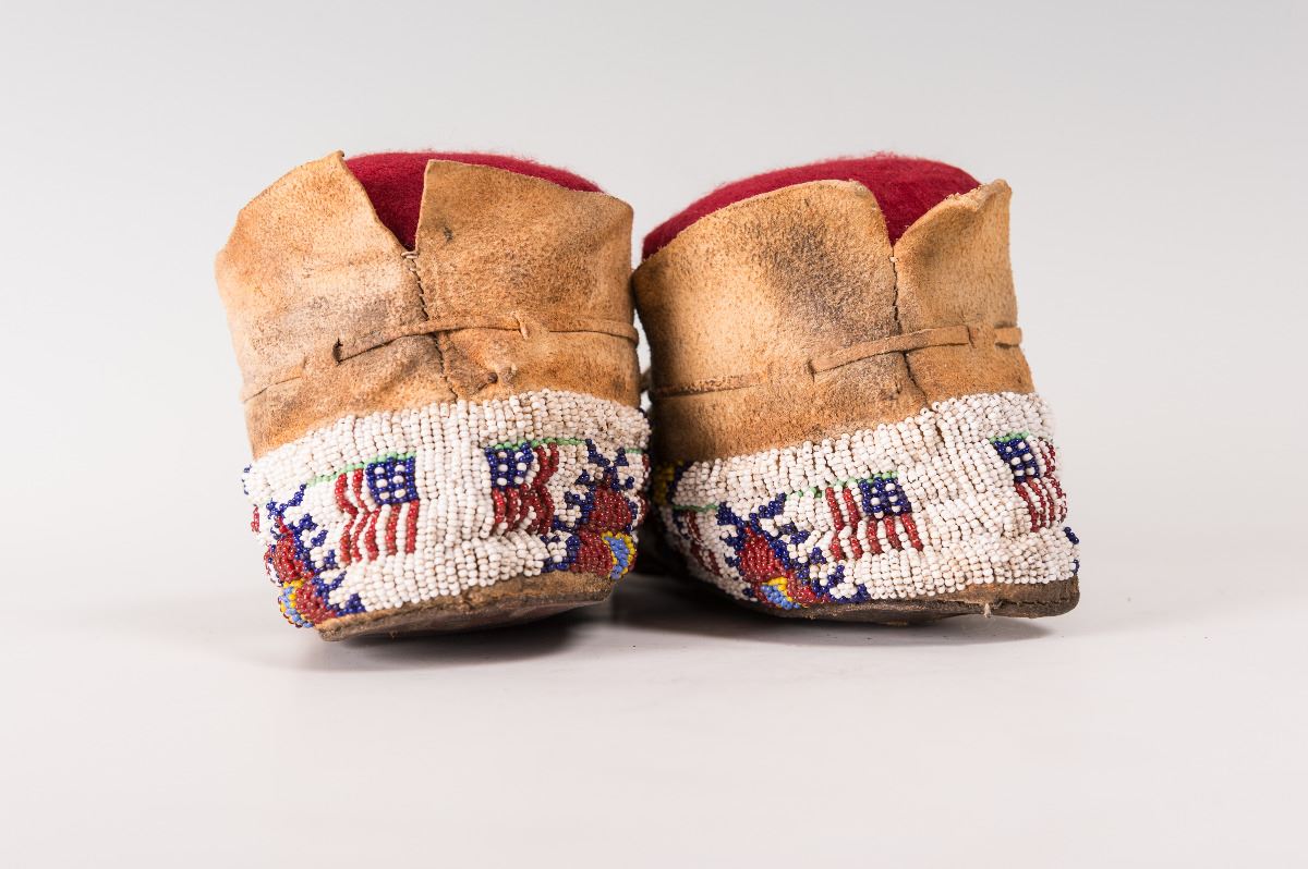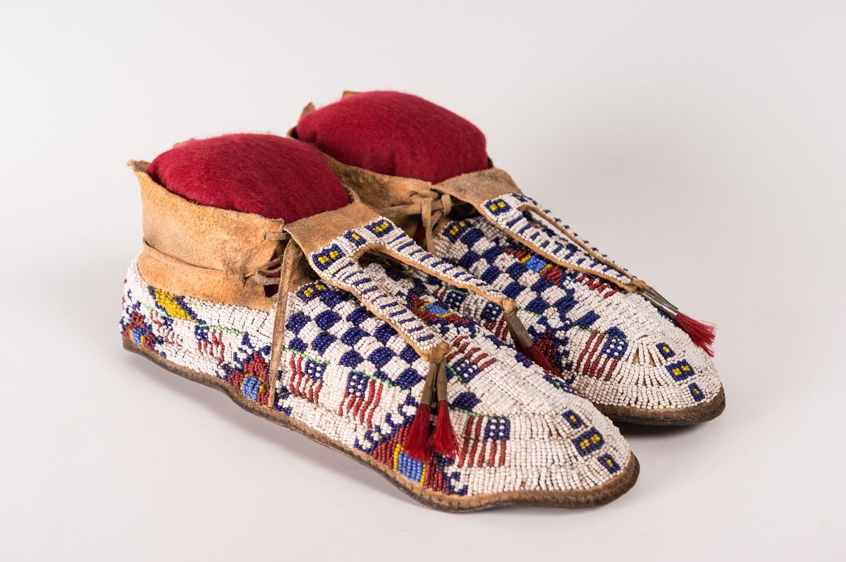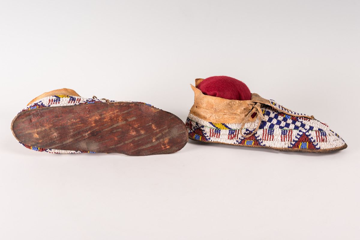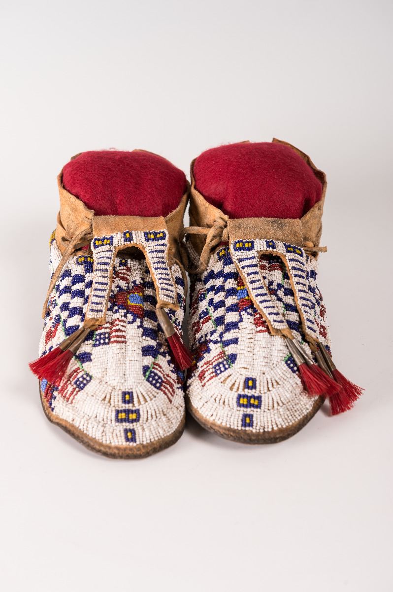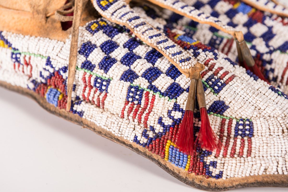 Cheyenne Fully Beaded Man's Moccasins. 11 ¾" long decorated with horsehair-stuffed tin cones on split-beaded tongues. 19th century.