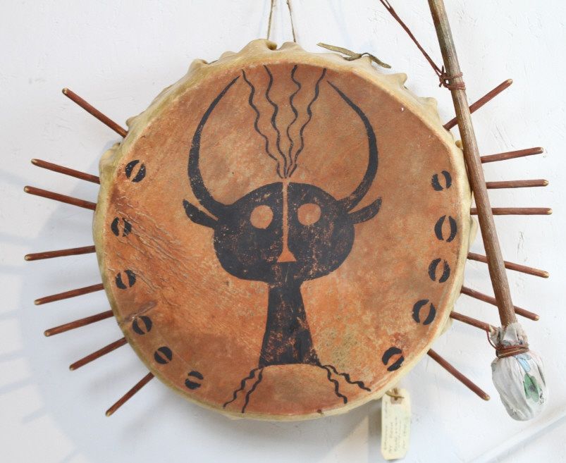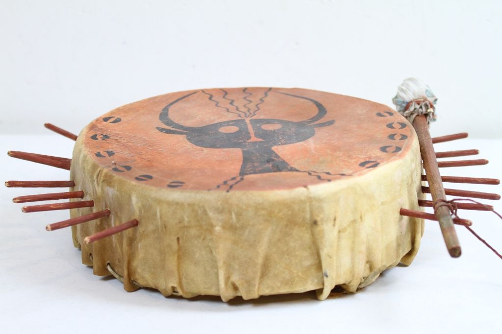 Cheyenne Ghost Bull Curing Drum This Drum is of brain tanned stretched hide by the Cheyenne Native Americans in Belle Creek, Montana. Hand painted with organic colors this is a curing peg drum from a private collection and is pre 1910