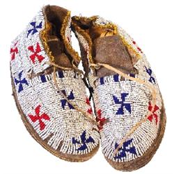 Cheyenne Indian child's moccasins, fully beaded w/very tiny red, white & blue seed beads on deerskin