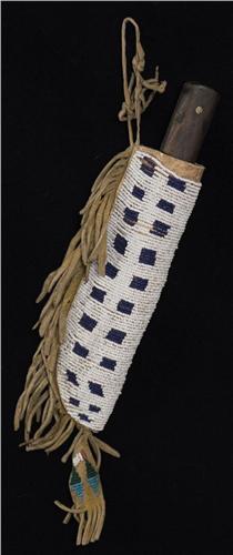 Cheyenne Knife Scabbard and Knife. 6 ½” x 1 ¾” not including ochred fringe and drop. Beaded on both sides. Buffalo hide with a parfleche liner. c. 1880. Fine condition. (est $2,000-3,000).