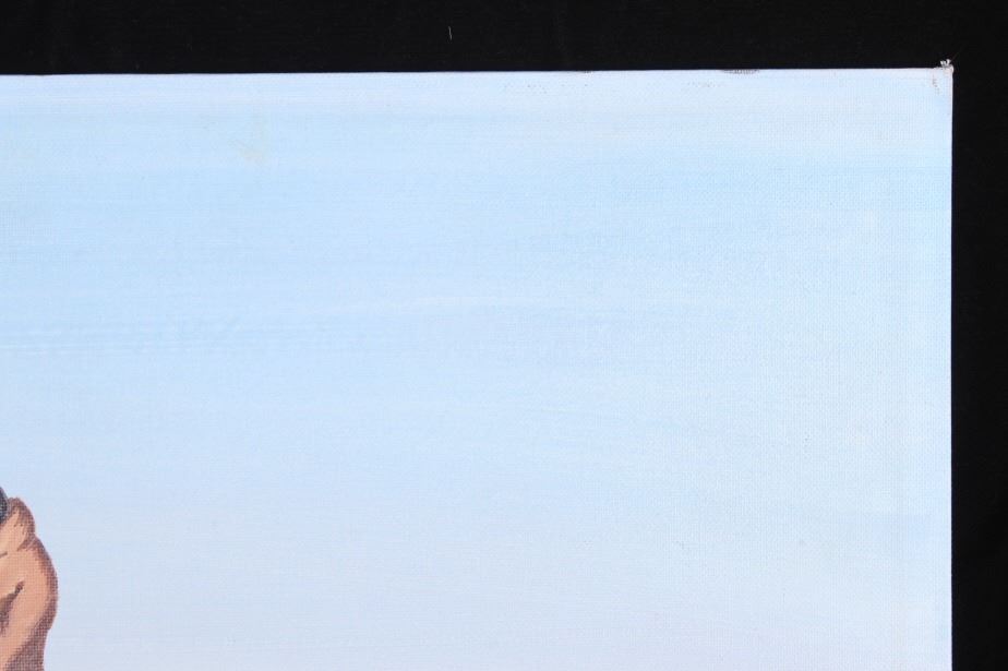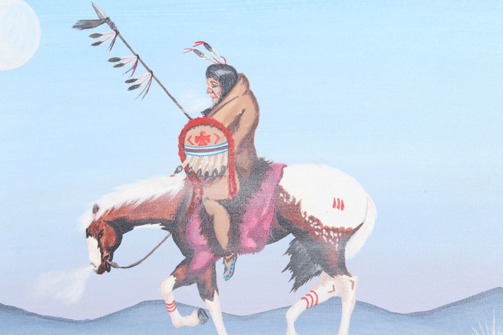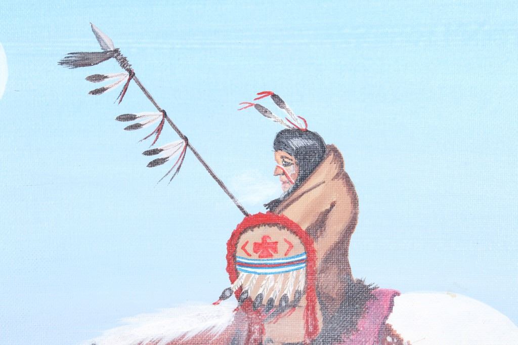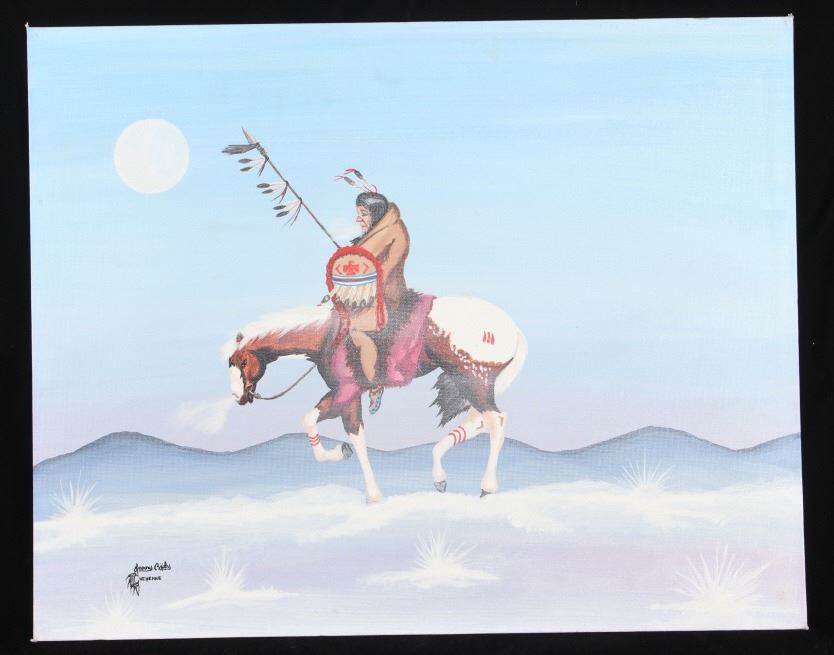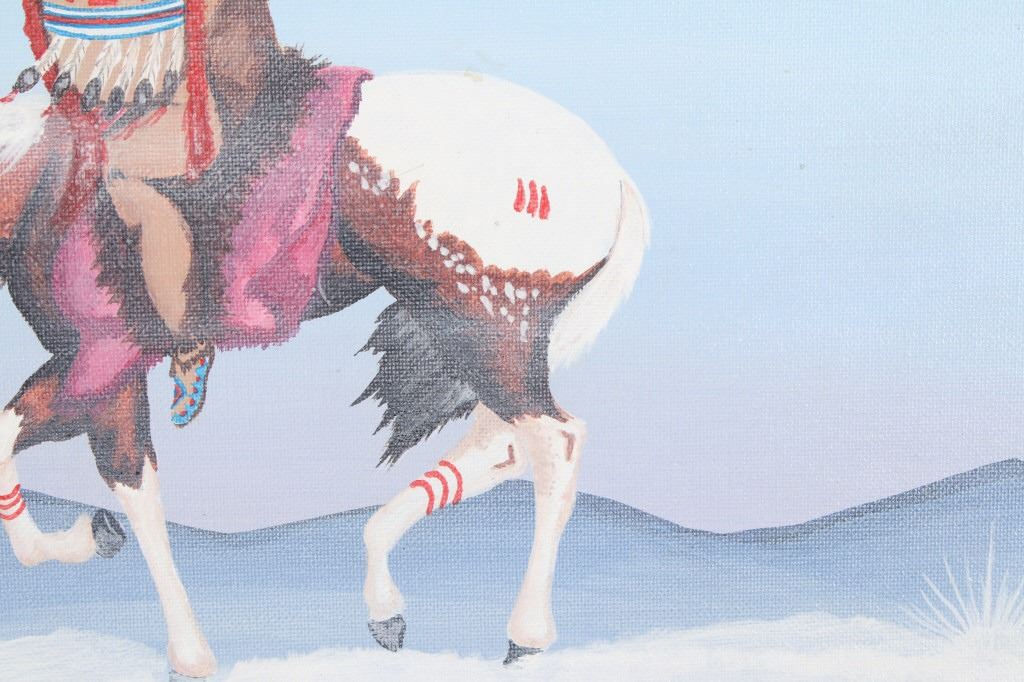 Offered in this lot is a signed original by Cheyenne artist Larry Bixby (1955-2018). This piece shows a warrior on horseback during a winter storm. The light blue and mauve of this painting add to the feel of the cold weather as the warrior and his horse journey home under the winter moon. Not many people understand the reality of the "daytime" winter moon, where the moon rises while it is still "daylight", as seen in this painting. The painting is signed in the lower left corner and bears a hallmark. The painting is in good, unframed condition on a canvas that measures 16" x 20".