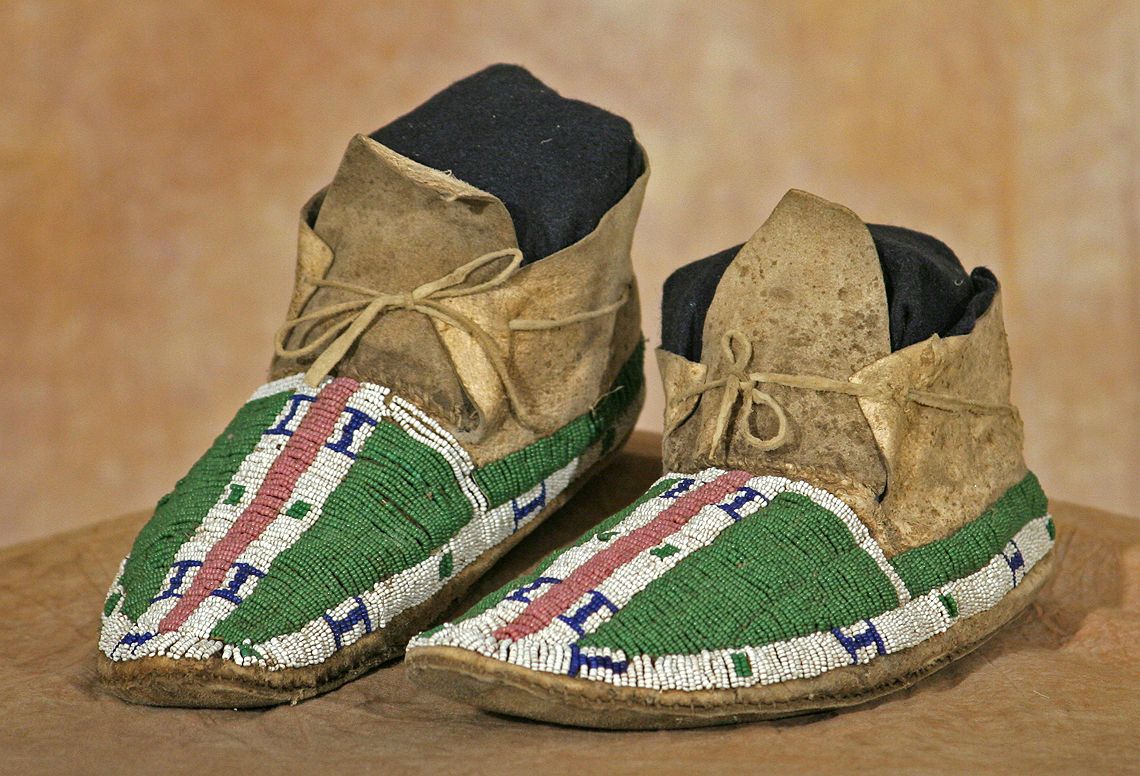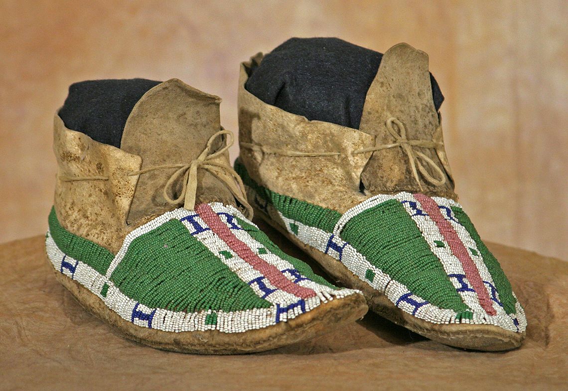 Cheyenne Man's Moccasins. 11" long with buffalo hide soles, beaded green Buffalo track designs with pink down the center. Circa 1880s. (est. $1,500-2,500). CONDITION REPORTS: www.auctioninsantafe.com/docs/cr2012.pdf