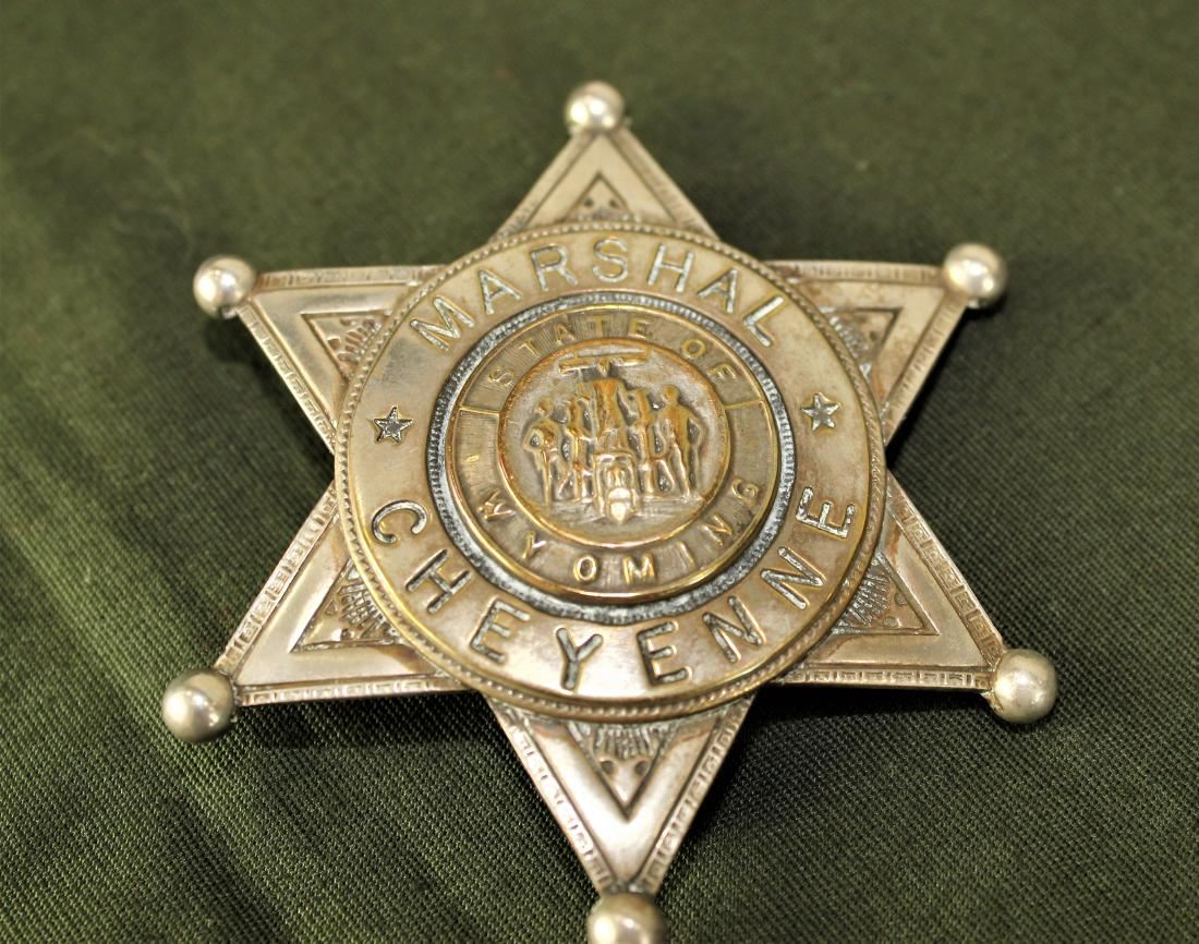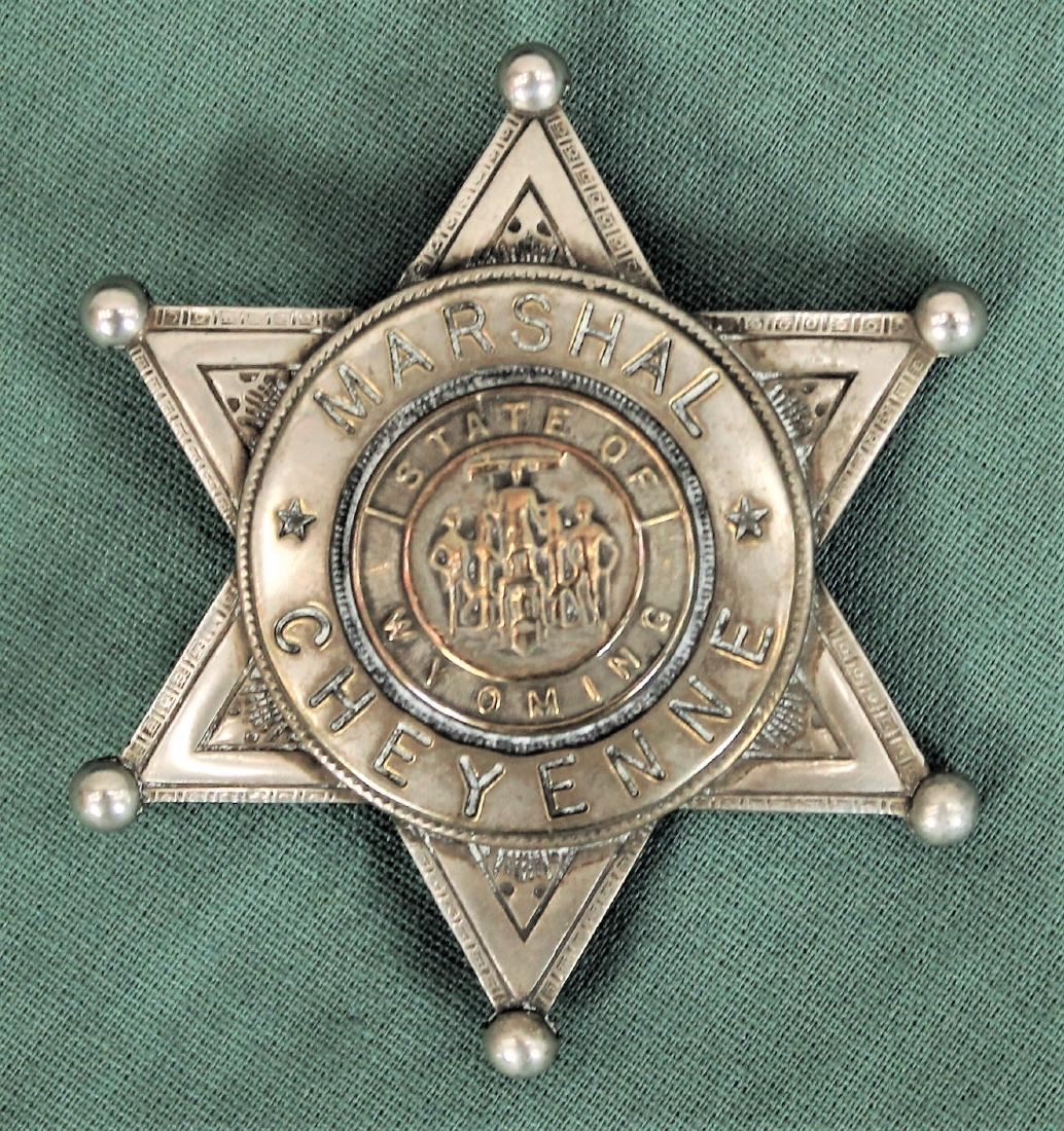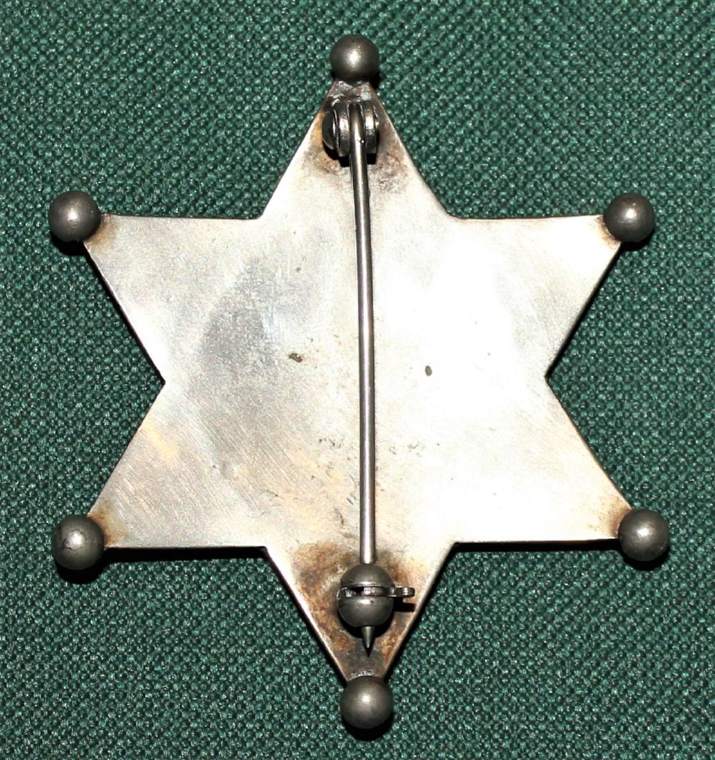 Extraordinary six point sterling silver star with gold "State of Wyoming" medallion in center. Done with spectacular three dimensional detail and showing beautiful age and patina. Measuring 2 1/2" in diameter.