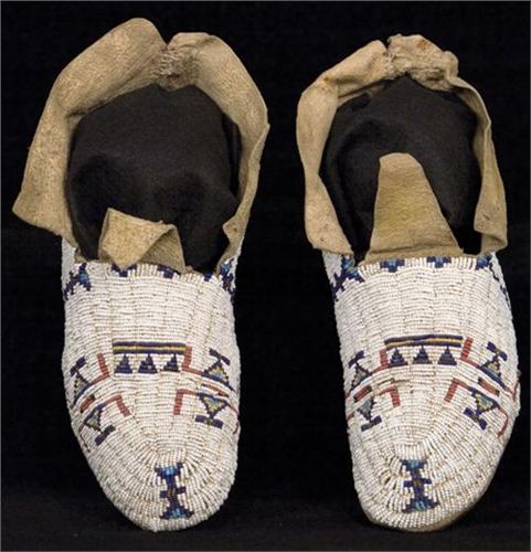 Cheyenne Men's Moccasins. 10" in length. Classic geometric designs. Fine beadwork. 19th Century. (est $2,000-2,500)