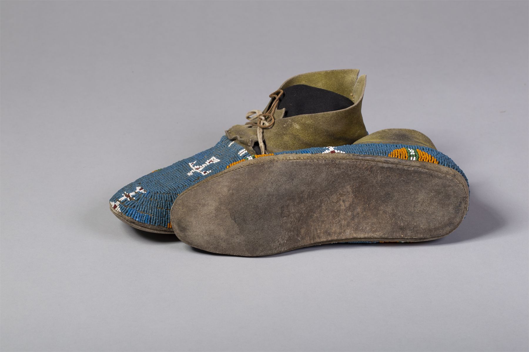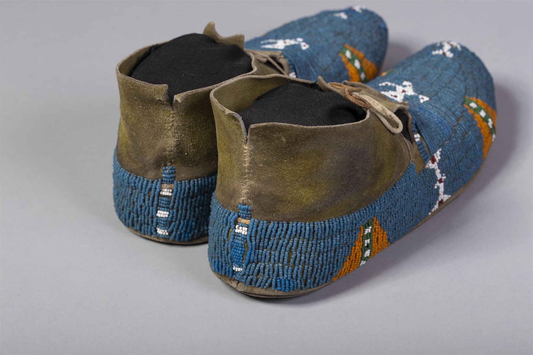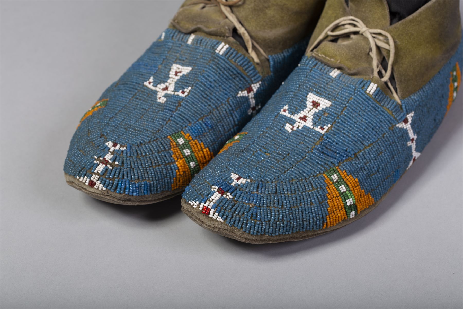 Fully beaded blue background with Thunderbirds on vamp, native green ochre uppers, stepped pyramids surrounding, no restoration.