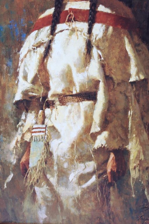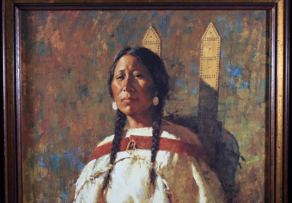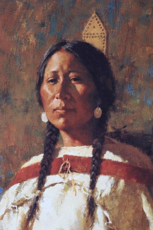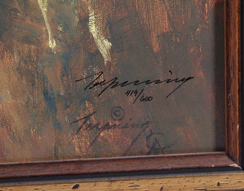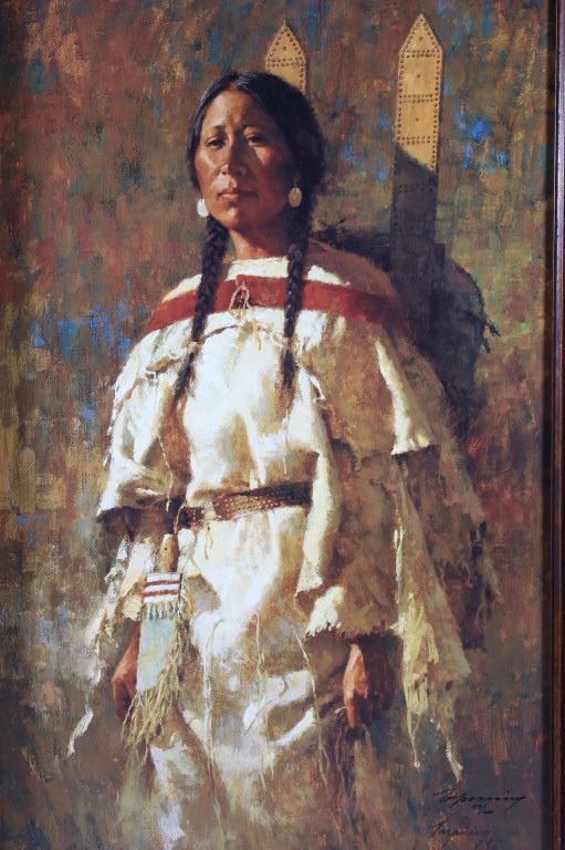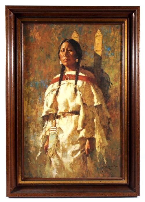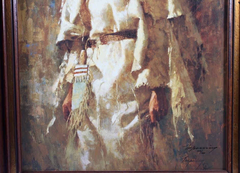 Featured in this lot we have a Giclee on canvas print by Howard Terpning titled "Cheyenne Mother". Howard Terpning is one of the most desired and notable Western artist of the 21st century and is known for is impressive depictions of the Native American Indian culture. Terpning is also a member of the Cowboy Artist of America and has won 60 awards in his field. The Giclee shows the image of a regal Native American woman dressed in a off white dress. The piece is signed in the bottom right hand side and is marked 419 of 600 limited edition Giclee prints. The print is set into a custom made dark wood frame with glint gold border around the print. The frame measures 22 1/2" wide by 32" tall with the print measuring 17" wide by 26 1/4" tall.