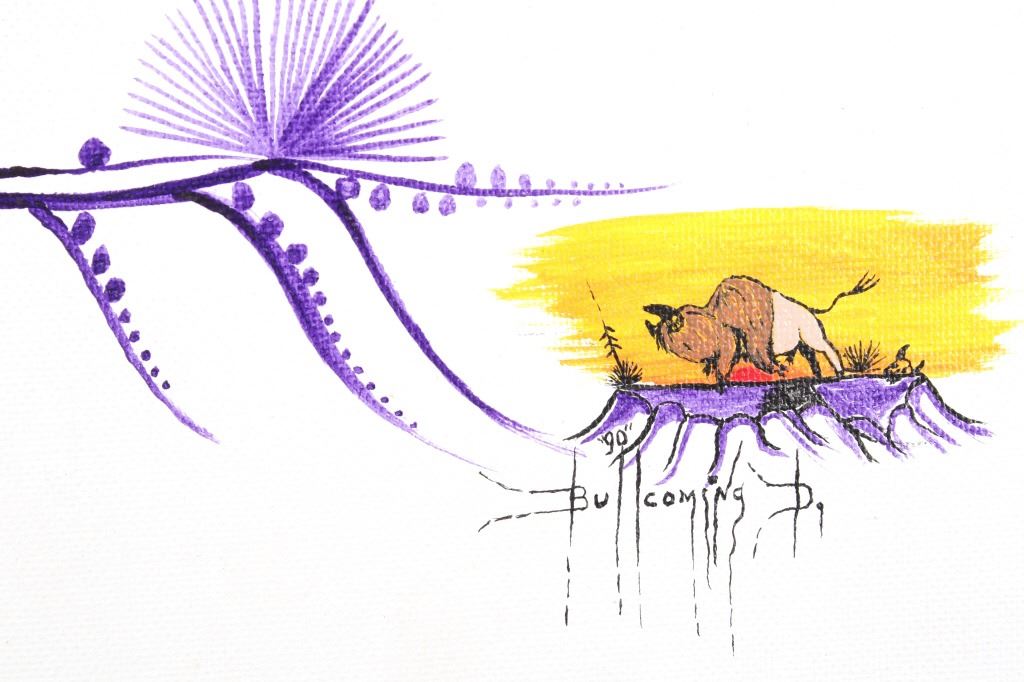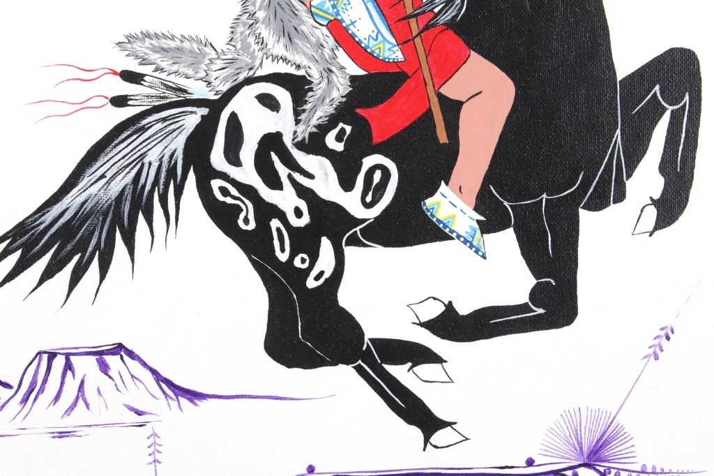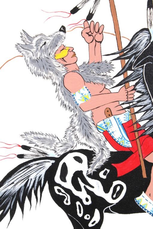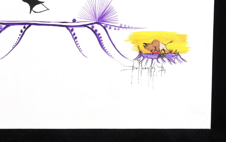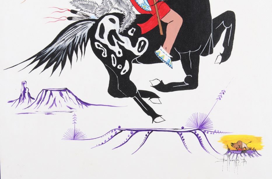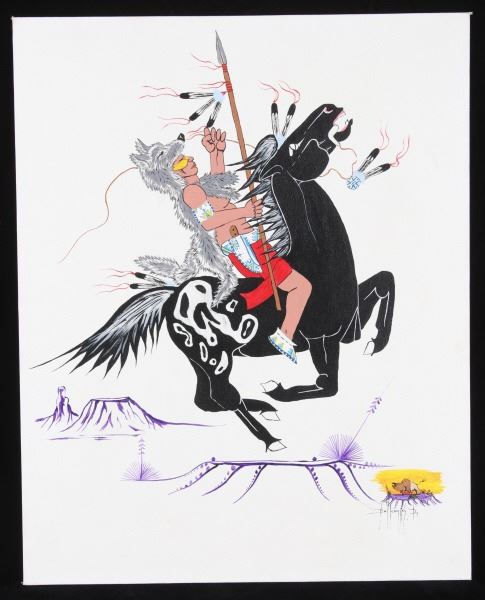 For your consideration is this Cheyenne, 1989, signed, original gouache horse and rider painting. The painting shows a brave in a wolf headdress, riding a beautiful black and white horse on a hill with some floral accents. The painting is signed "Bull Coming" with a miniature of his hallmark of a buffalo. The back of the canvas bears the title, "’Returning with Coups’ 1989 Dwight Bullcoming”, but the signature in the front lower right corner shows "90", from when the painting was started till finished. The condition of this painting is good. The measurements of this gouache painting are 20" x 16".