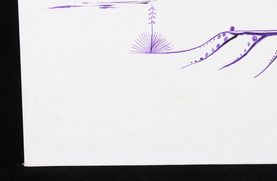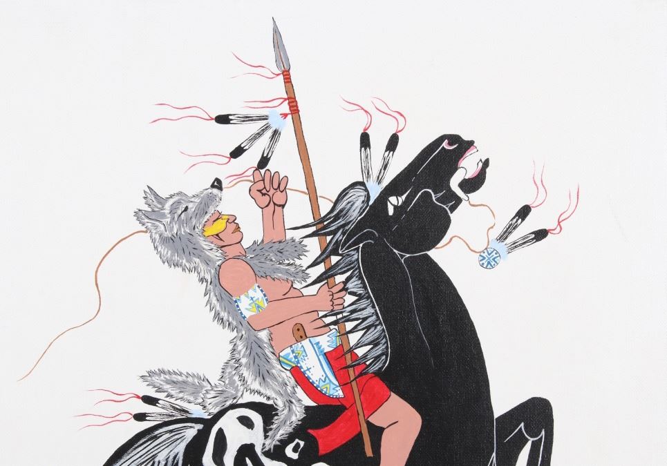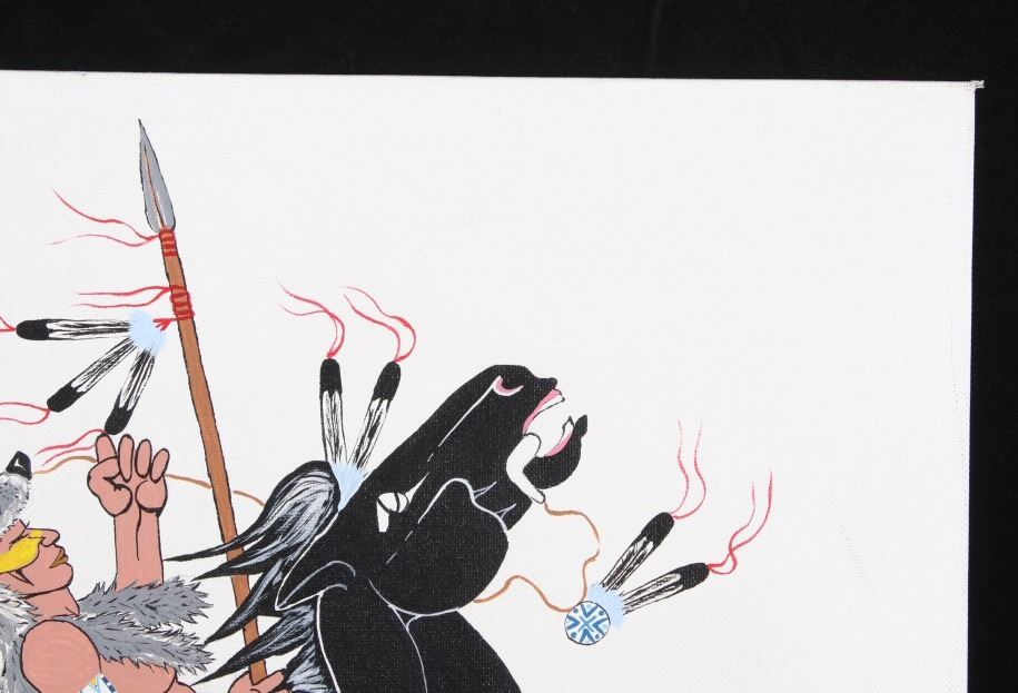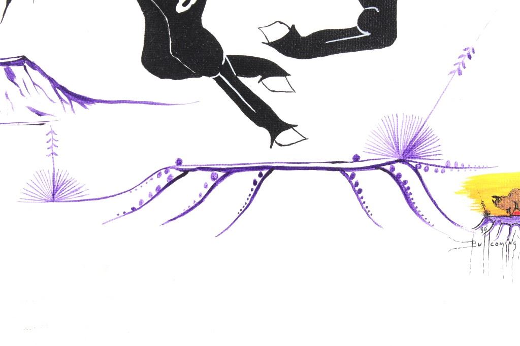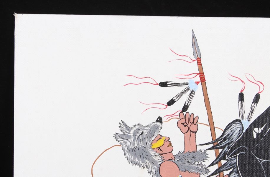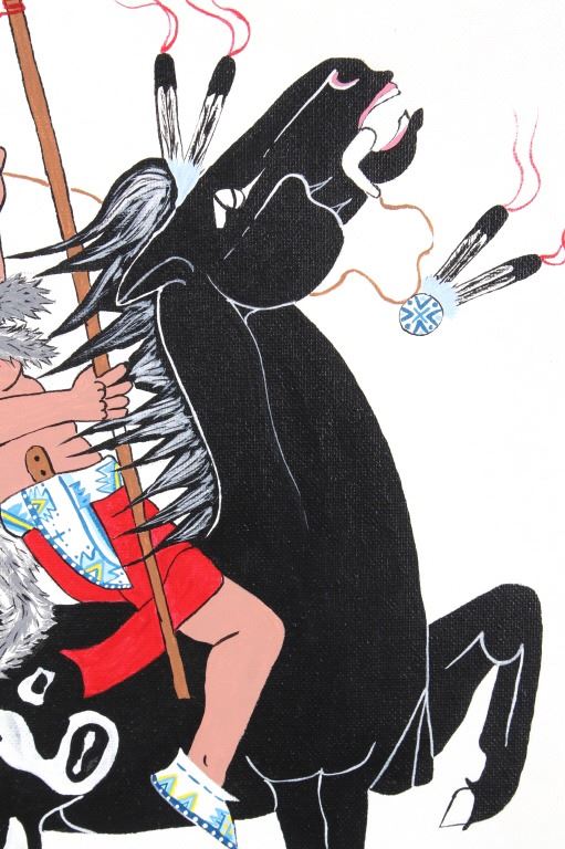 For your consideration is this Cheyenne, 1989, signed, original gouache horse and rider painting. The painting shows a brave in a wolf headdress, riding a beautiful black and white horse on a hill with some floral accents. The painting is signed "Bull Coming" with a miniature of his hallmark of a buffalo. The back of the canvas bears the title, "’Returning with Coups’ 1989 Dwight Bullcoming”, but the signature in the front lower right corner shows "90", from when the painting was started till finished. The condition of this painting is good. The measurements of this gouache painting are 20" x 16".