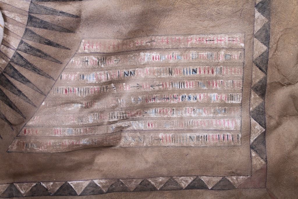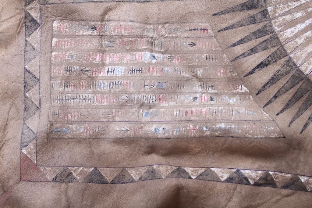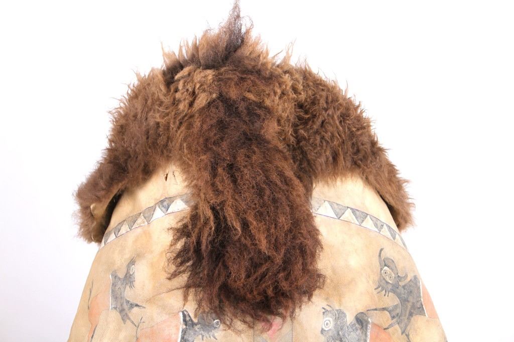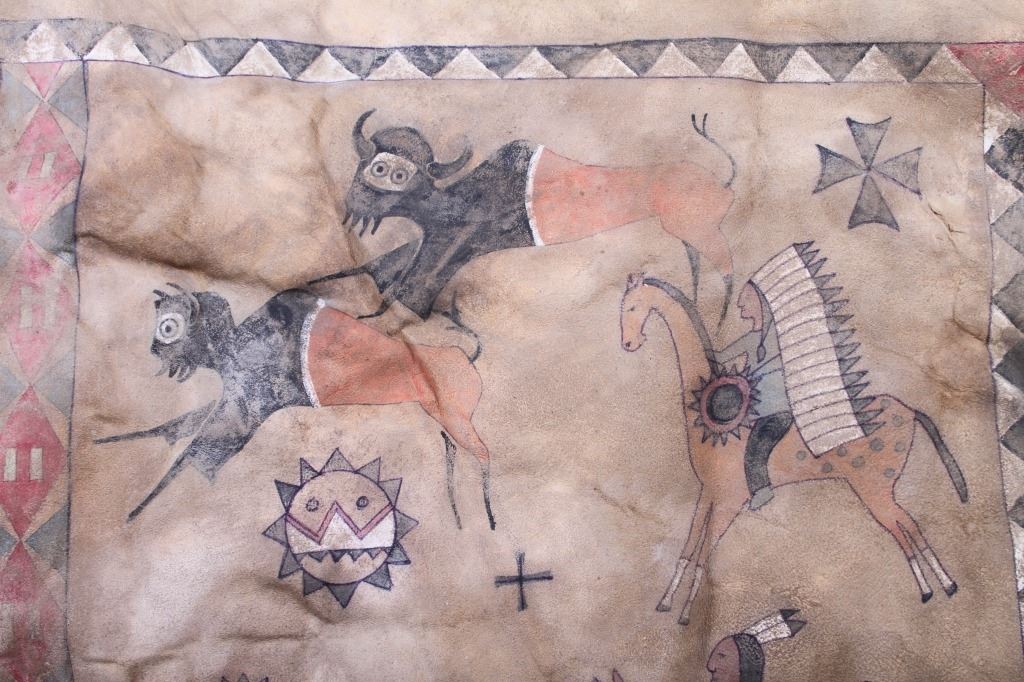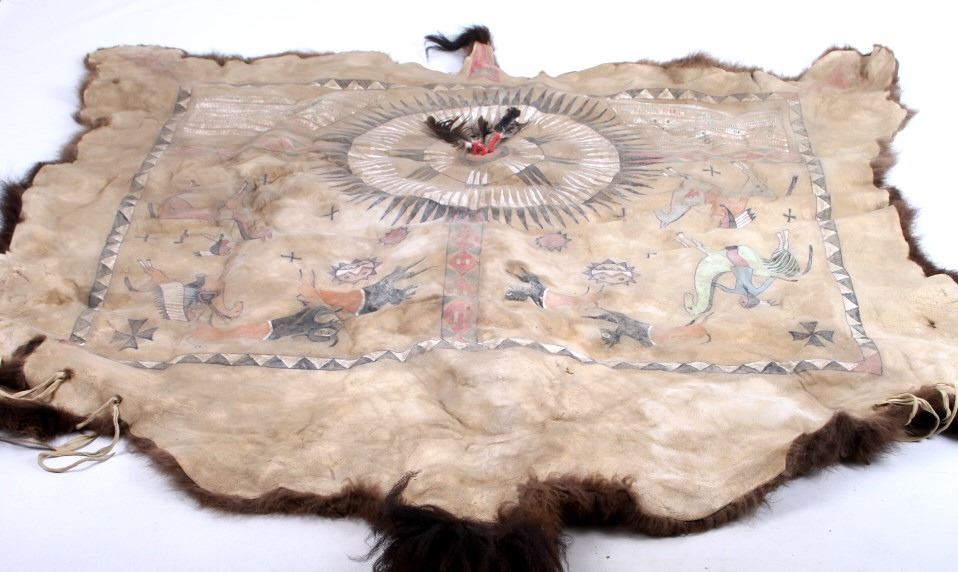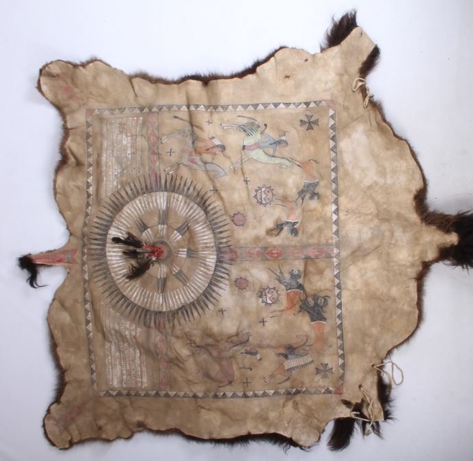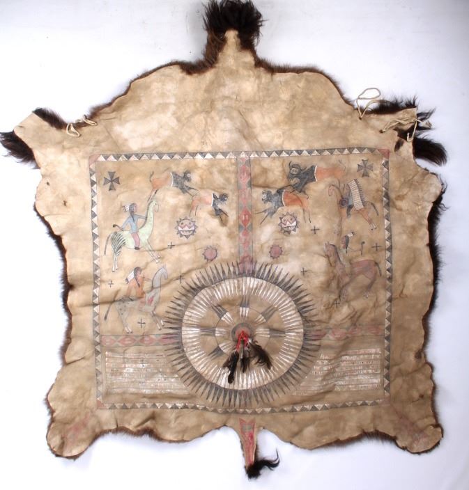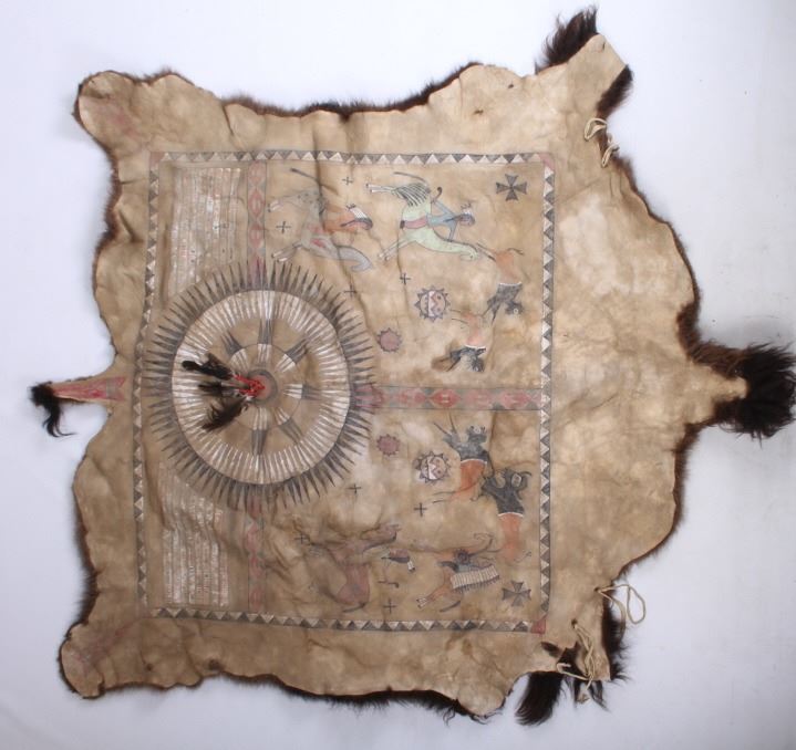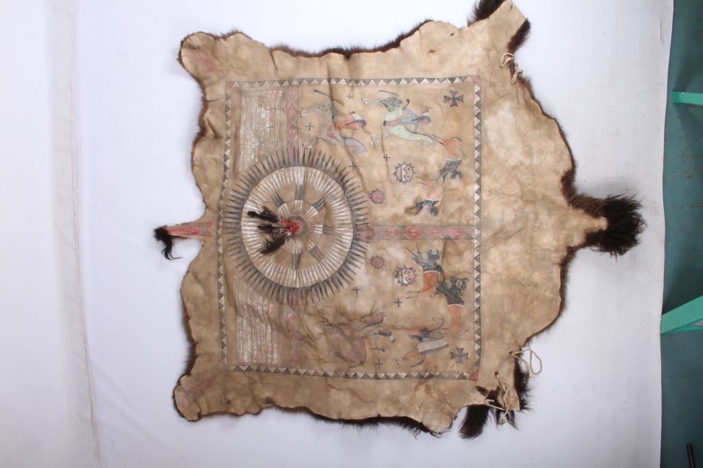 This is from the Cheyenne Native American Indians and shows an excellently mineral polychrome painted Buffalo Hide Robe. The piece has a wonderful "Winter Count" scene depicting Chief's and armed Warriors on horseback Buffalo Hunting. The piece has a wonderful pinwheel center traditional pinwheel symbol with various pictorial paintings in a geometric border. Provenance: This was acquired in 1930 by Isaac Mundy Collection in Kansas City and kept under museum conditions until being sold into the Phil Reovack Collection of Breckinridge, Co. circa 1970. Isaac Mundy was a government blacksmith for the Delaware Indians of Missouri Valley in the 19th Century. The hide is in very good well preserved museum quality condition and shows much if not all of the fur on the back side. This would have been worn by a Cheyenne Chief over the shoulders. Measures 93"L x 76"W. Please review pictures for condition and age. The piece does not come with any documentation. No Returns.