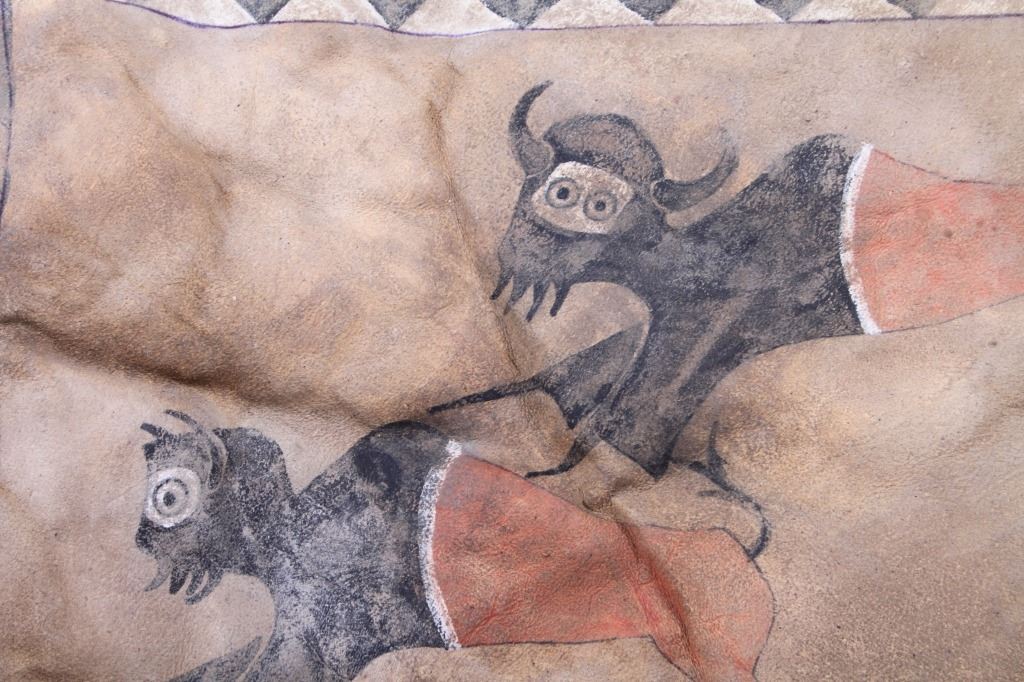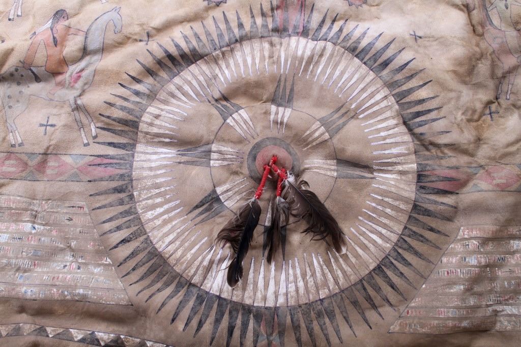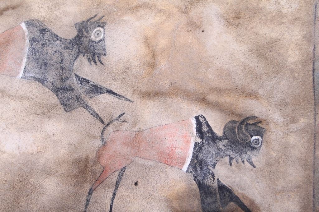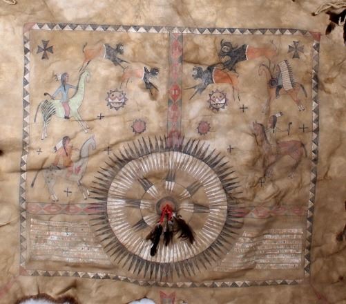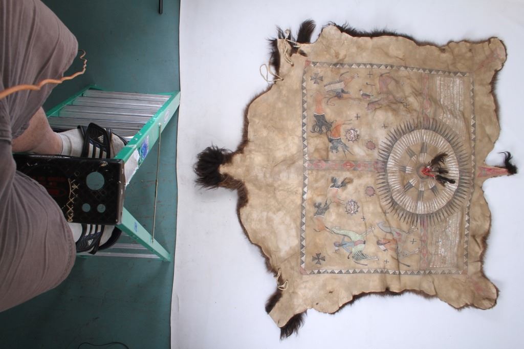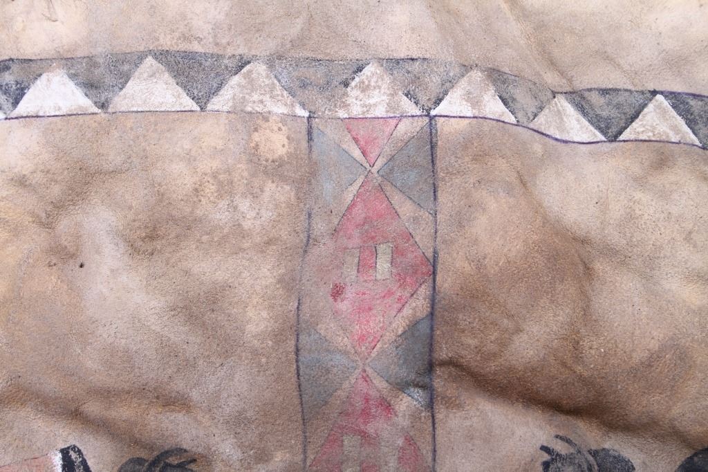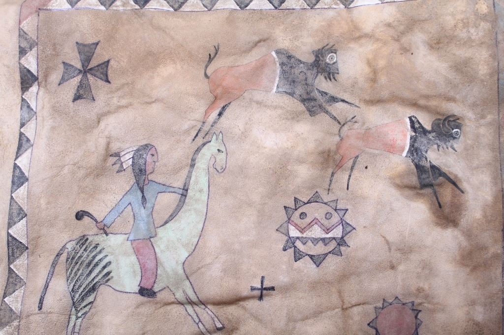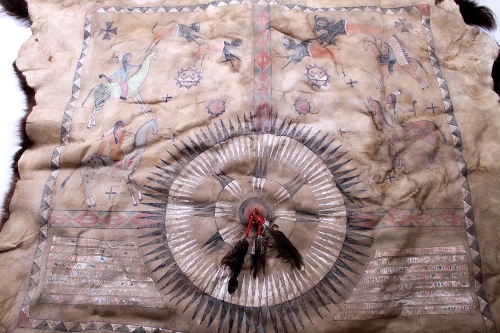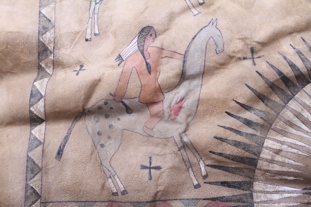 This is from the Cheyenne Native American Indians and shows an excellently mineral polychrome painted Buffalo Hide Robe. The piece has a wonderful "Winter Count" scene depicting Chief's and armed Warriors on horseback Buffalo Hunting. The piece has a wonderful pinwheel center traditional pinwheel symbol with various pictorial paintings in a geometric border. Provenance: This was acquired in 1930 by Isaac Mundy Collection in Kansas City and kept under museum conditions until being sold into the Phil Reovack Collection of Breckinridge, Co. circa 1970. Isaac Mundy was a government blacksmith for the Delaware Indians of Missouri Valley in the 19th Century. The hide is in very good well preserved museum quality condition and shows much if not all of the fur on the back side. This would have been worn by a Cheyenne Chief over the shoulders. Measures 93"L x 76"W. Please review pictures for condition and age. The piece does not come with any documentation. No Returns.