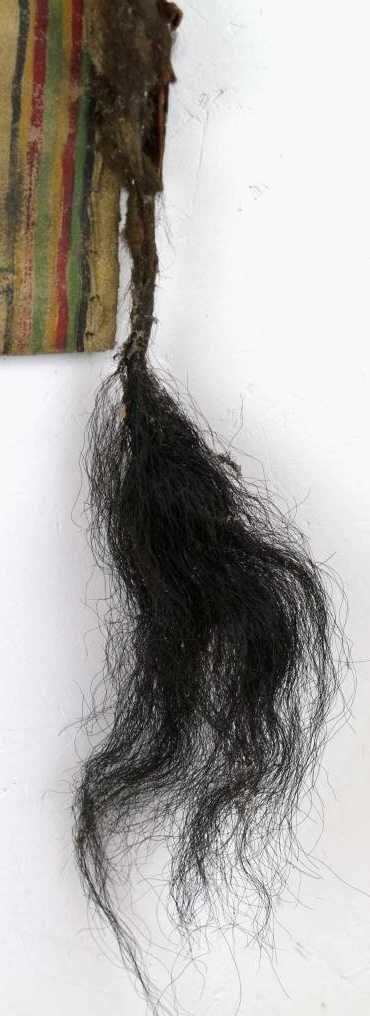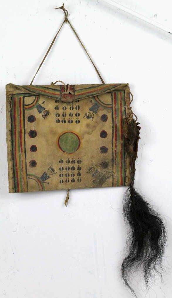 Cheyenne Parfleche Flat Case circa early 1900's - This is made of smoked brain tan Buffalo Rawhide and sewn with brain tan deer hide. There is a genuine buffalo rail and hide effigy attached. Has good patina and distress for age. The original of this bag is mentioned in "The American Indian Parfleche (on page 117)" and is on display in the Smithsonian Institution collected by William Wildschut and is from 1860. This piece was done in the early 1900's by the Cheyenne people. Measure 9"x10.5"